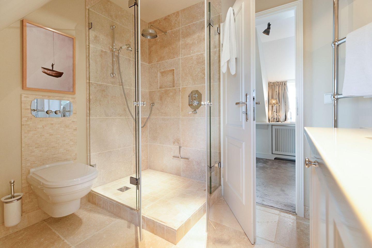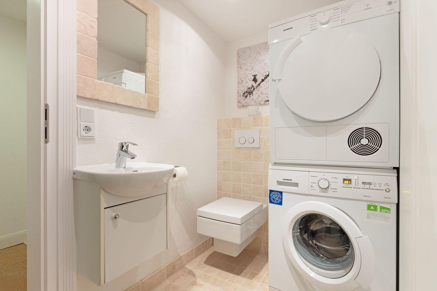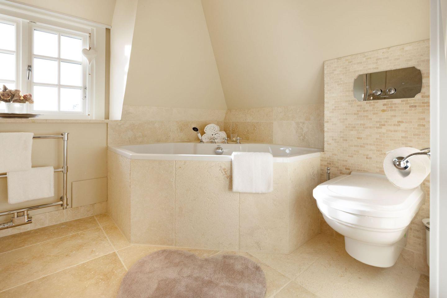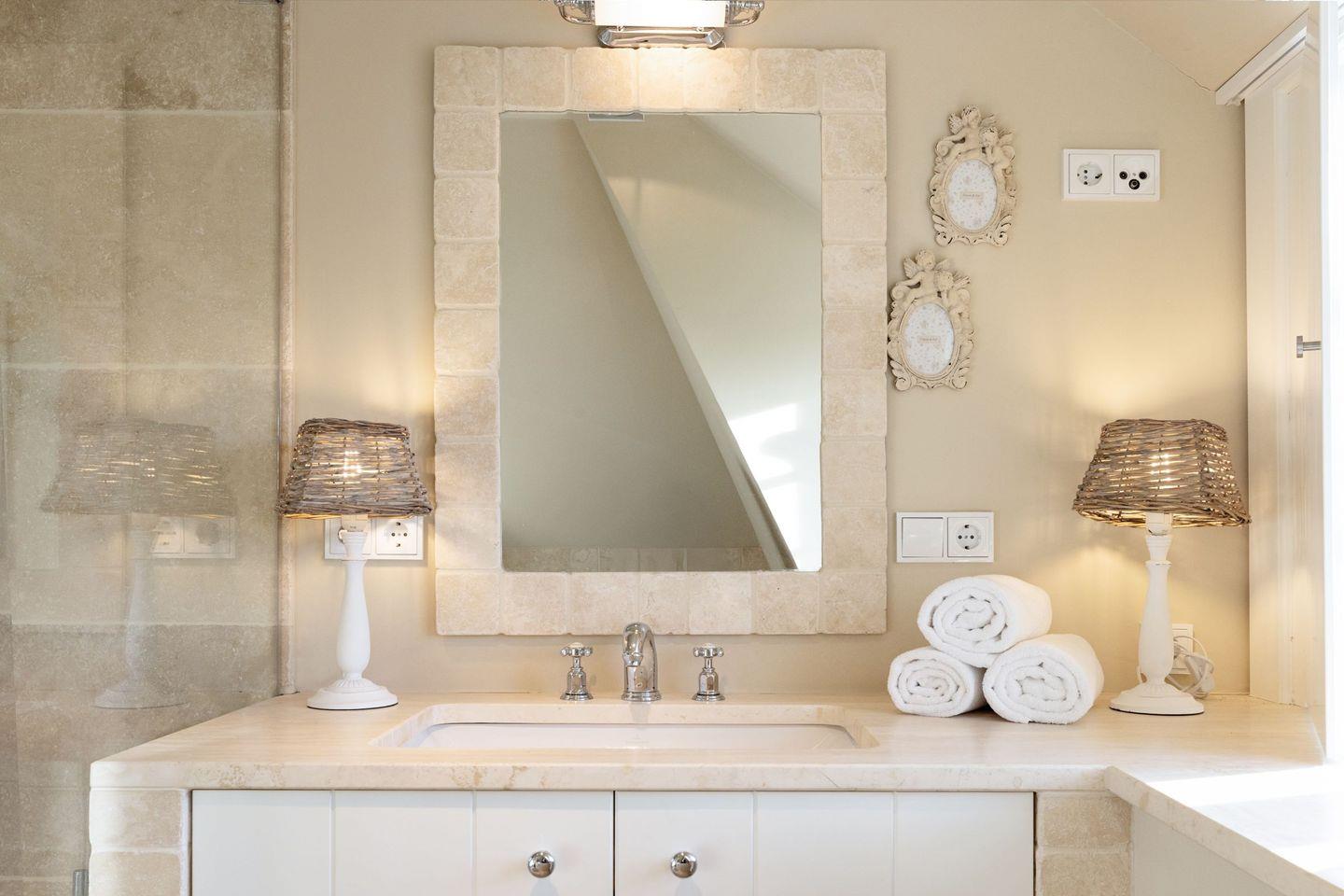 Es gibt zwei moderne Badezimmer, ausgestattet mit einer Dusche und einer Badewanne und zusätzlich steht ein Gäste-WC zur Verfügung.