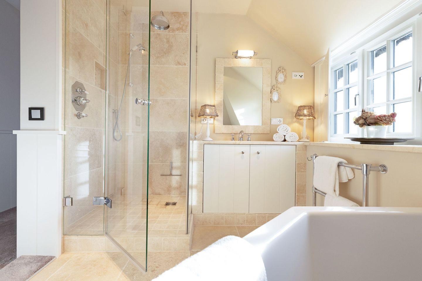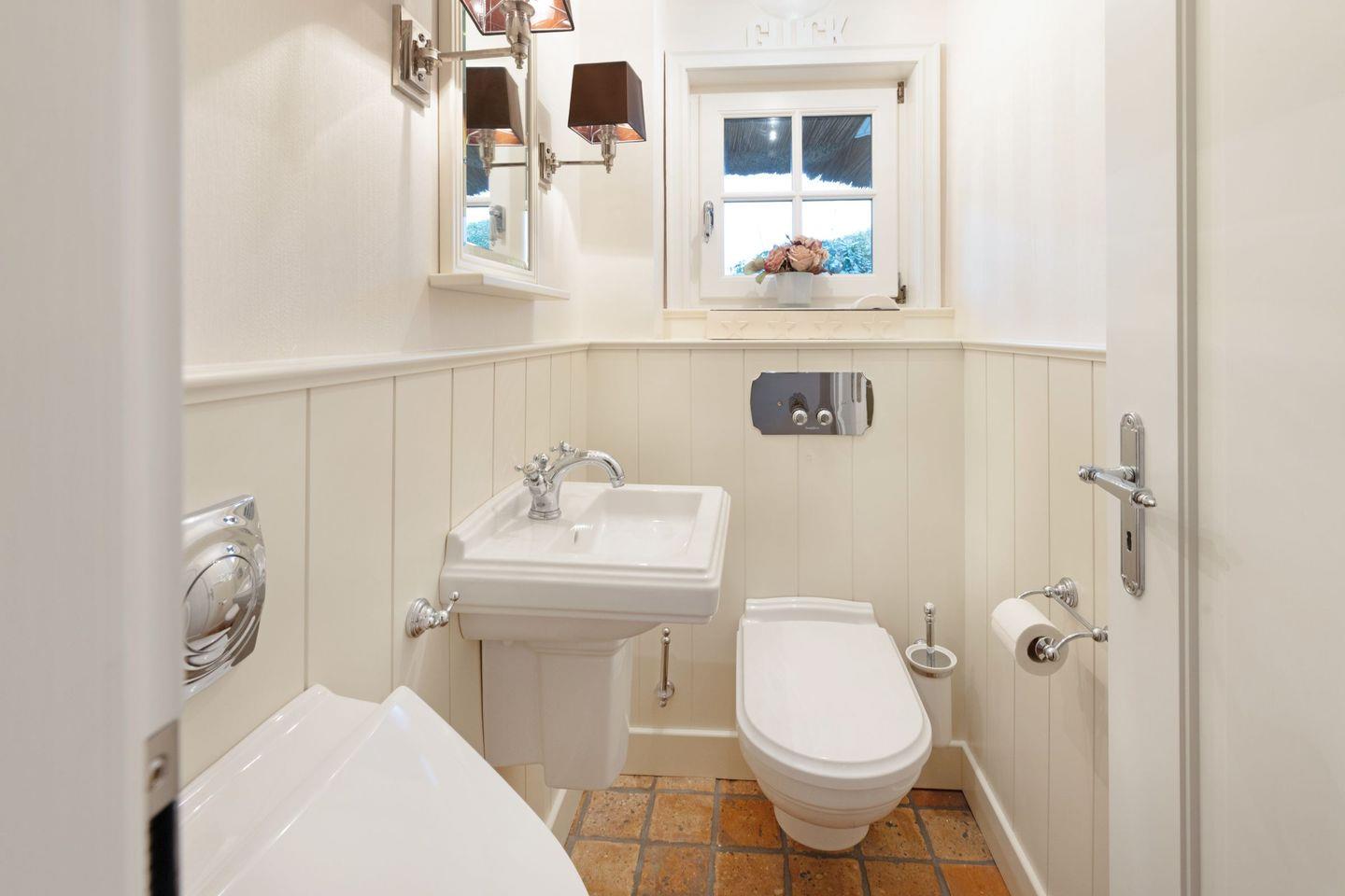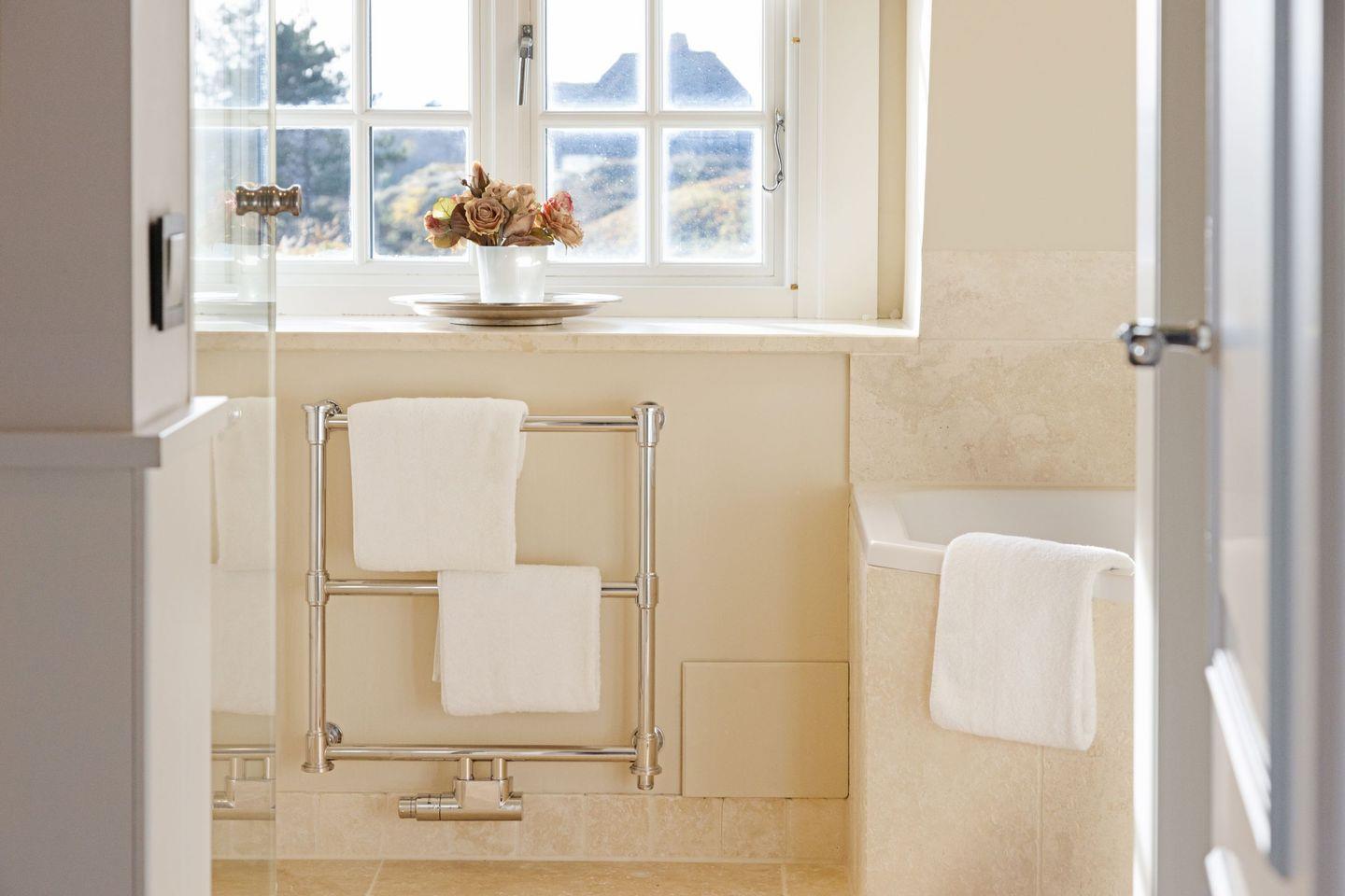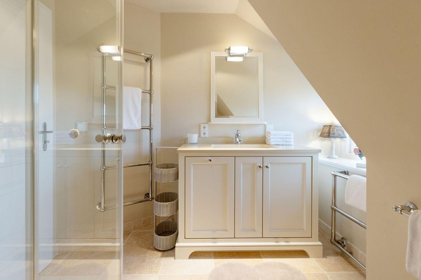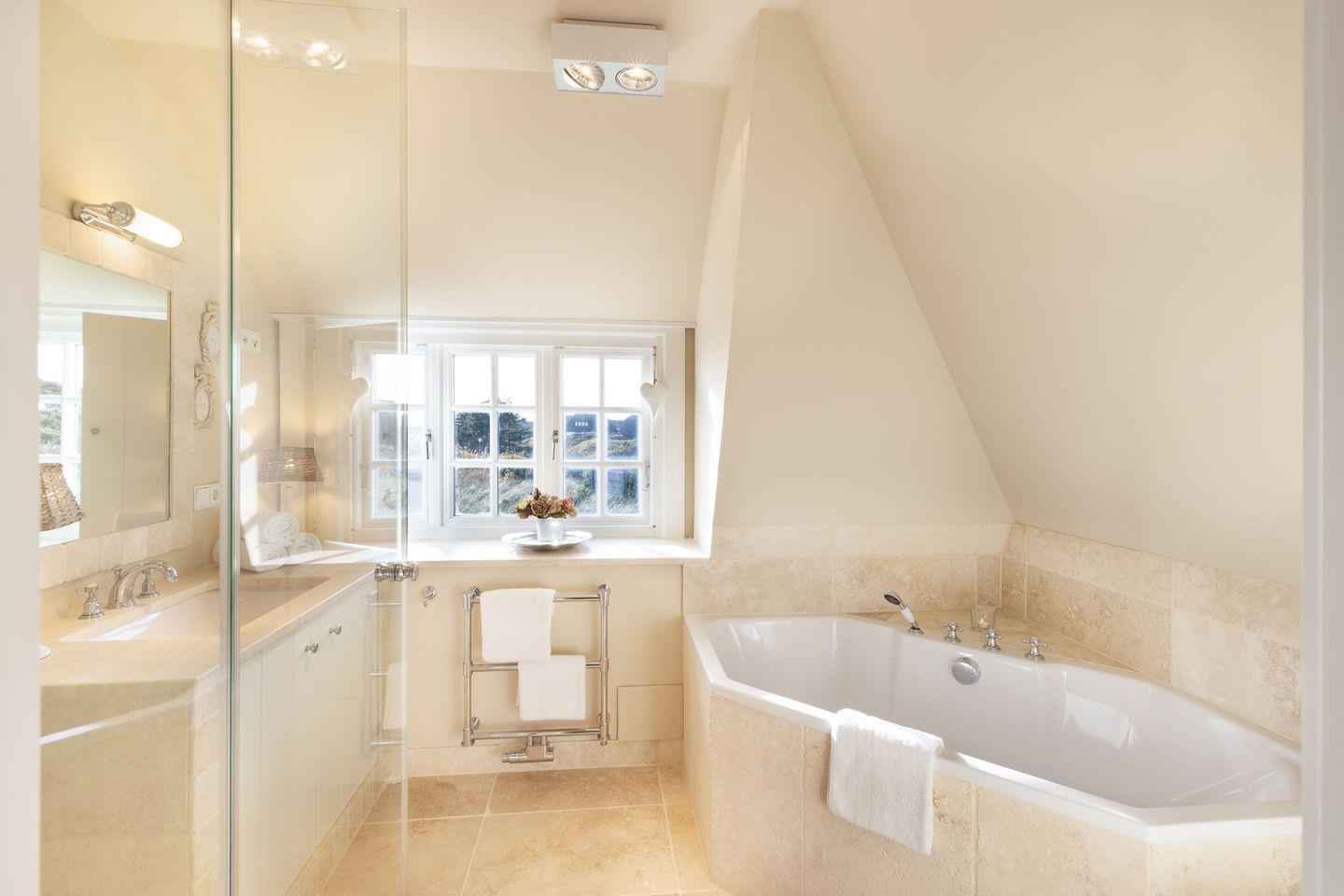 Es gibt zwei moderne Badezimmer, ausgestattet mit einer Dusche und einer Badewanne und zusätzlich steht ein Gäste-WC zur Verfügung.