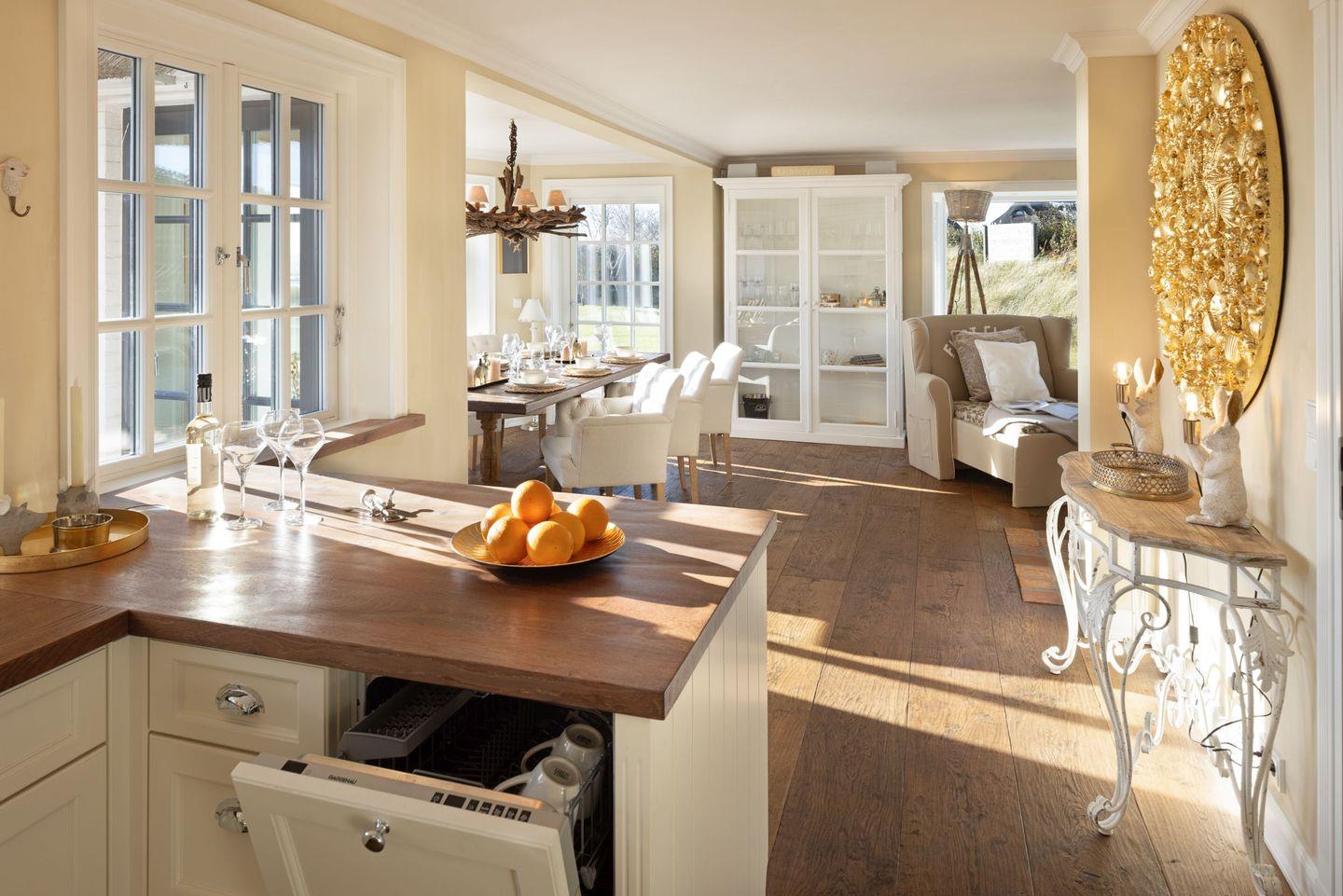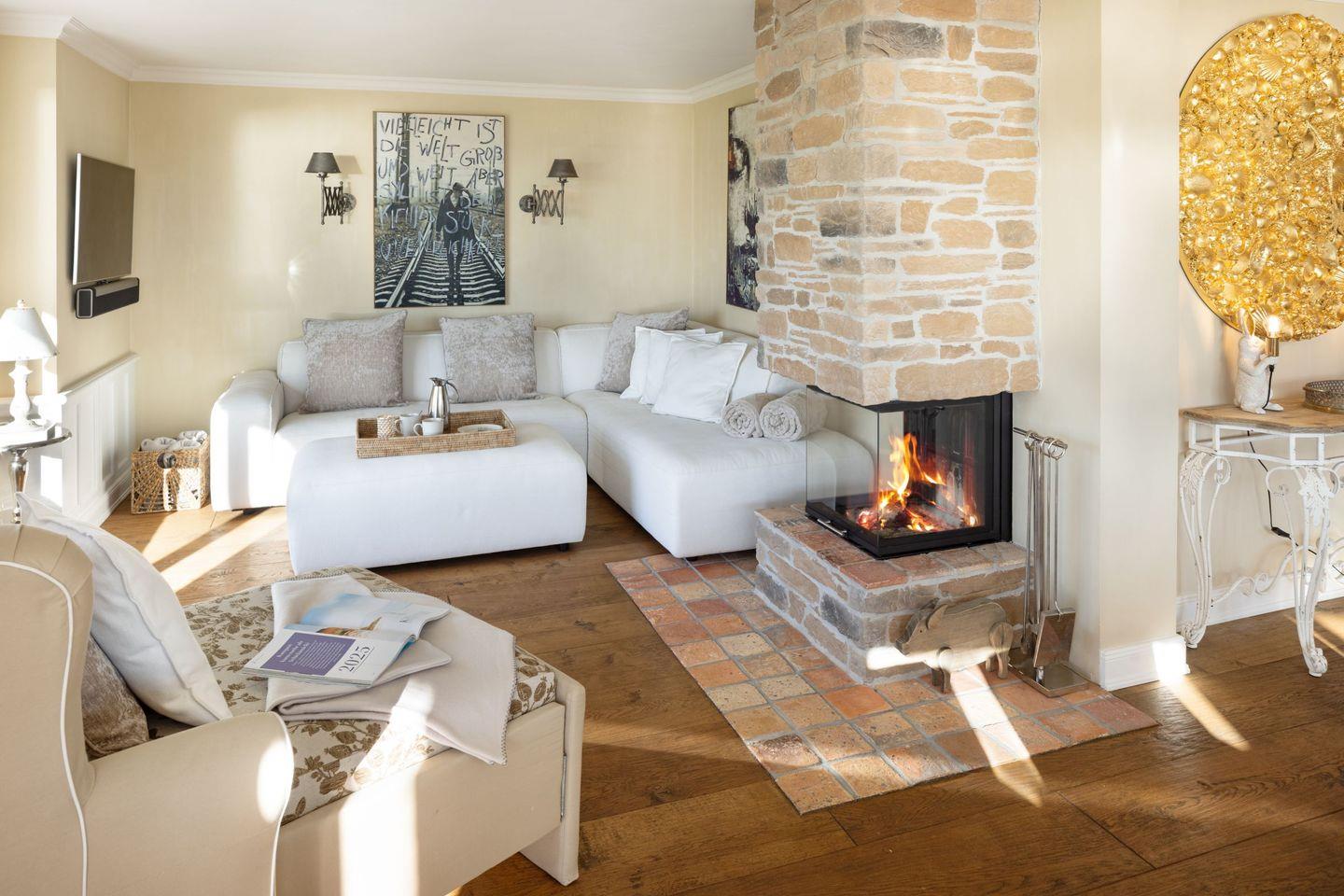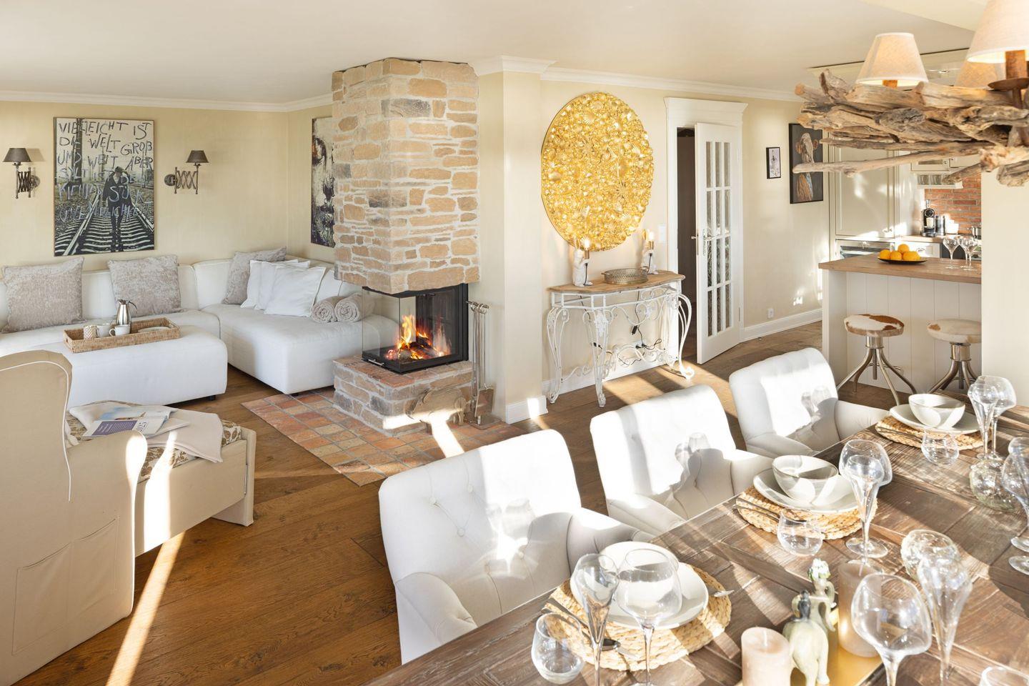 Die offene Küche ist modern gestaltet und verfügt über alle notwendigen Geräte, darunter ein Cerankochfeld, einen Backofen und eine Spülmaschine. Genießen Sie gesellige Kochabende am großen Esstisch, der nahtlos in den Wohnbereich übergeht. Der Wohnraum ist stilvoll mit Parkett ausgestattet und lädt mit einer gemütlichen Sofaecke und einem offenen Kamin zu entspannten Stunden ein. Für Unterhaltung sorgt ein hochmodernes Entertainment-System mit vier Fernsehern und einer schnellen Internetverbindung über WLAN.