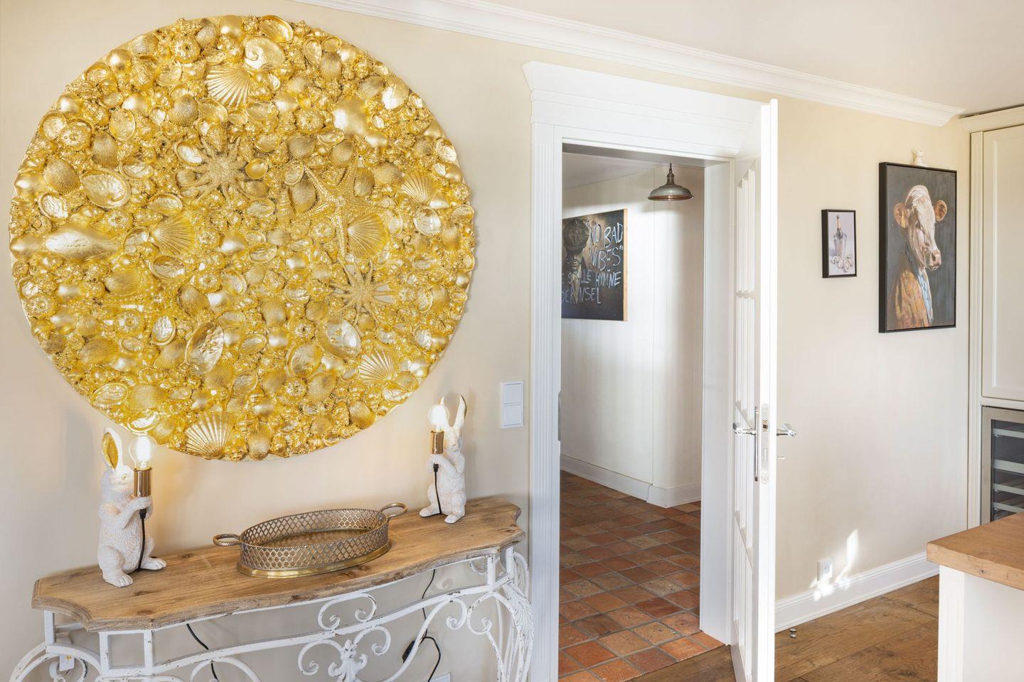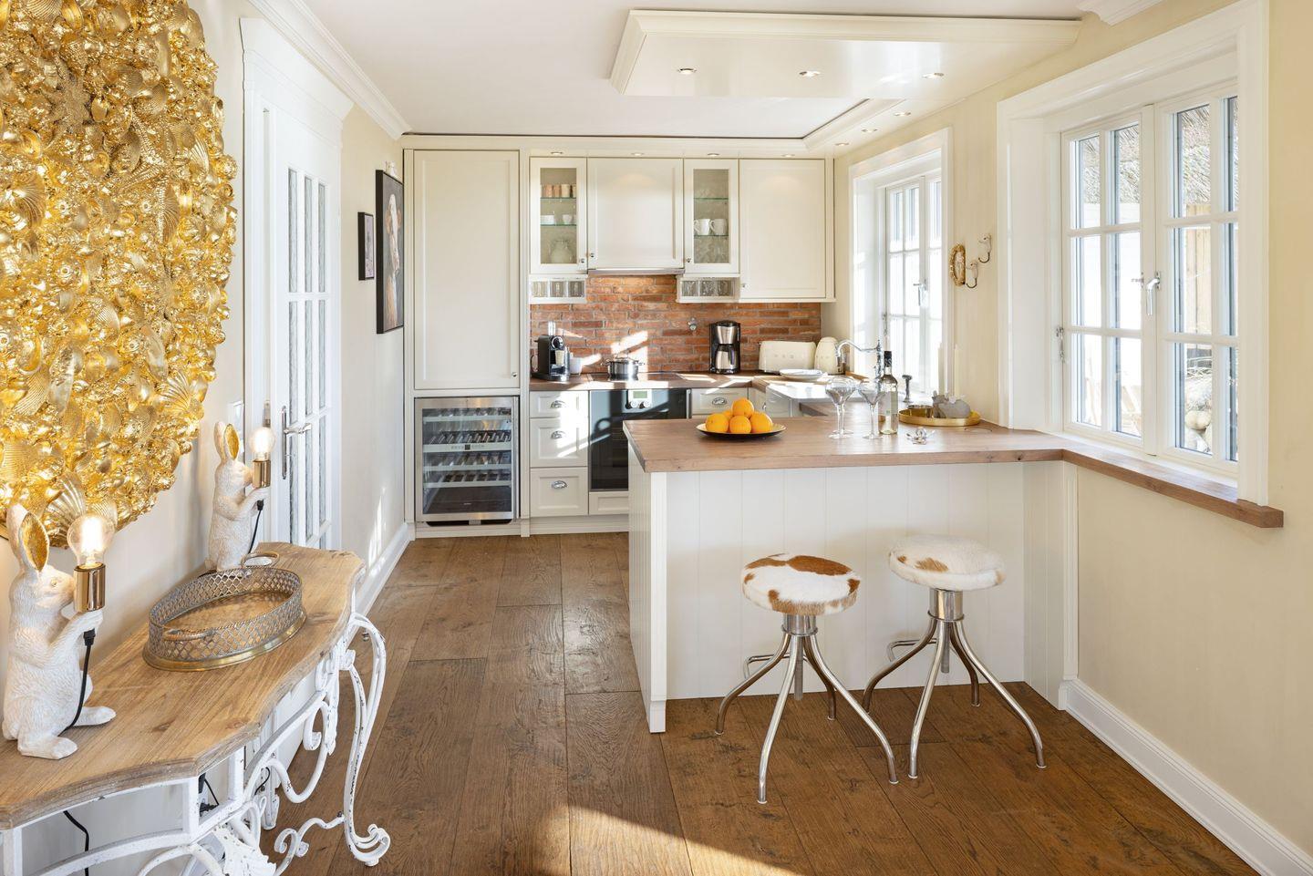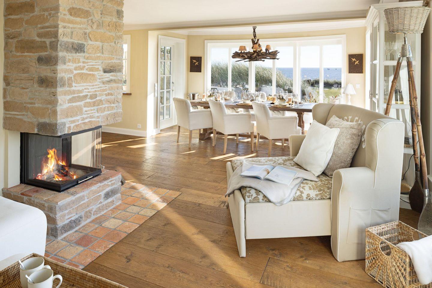Die offene Küche ist modern gestaltet und verfügt über alle notwendigen Geräte, darunter ein Cerankochfeld, einen Backofen und eine Spülmaschine. Genießen Sie gesellige Kochabende am großen Esstisch, der nahtlos in den Wohnbereich übergeht. Der Wohnraum ist stilvoll mit Parkett ausgestattet und lädt mit einer gemütlichen Sofaecke und einem offenen Kamin zu entspannten Stunden ein. Für Unterhaltung sorgt ein hochmodernes Entertainment-System mit vier Fernsehern und einer schnellen Internetverbindung über WLAN.
