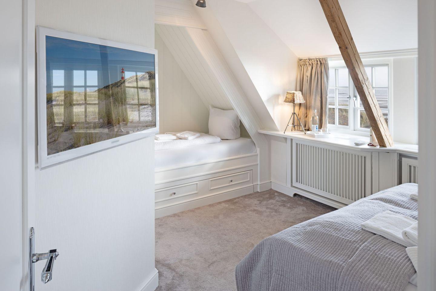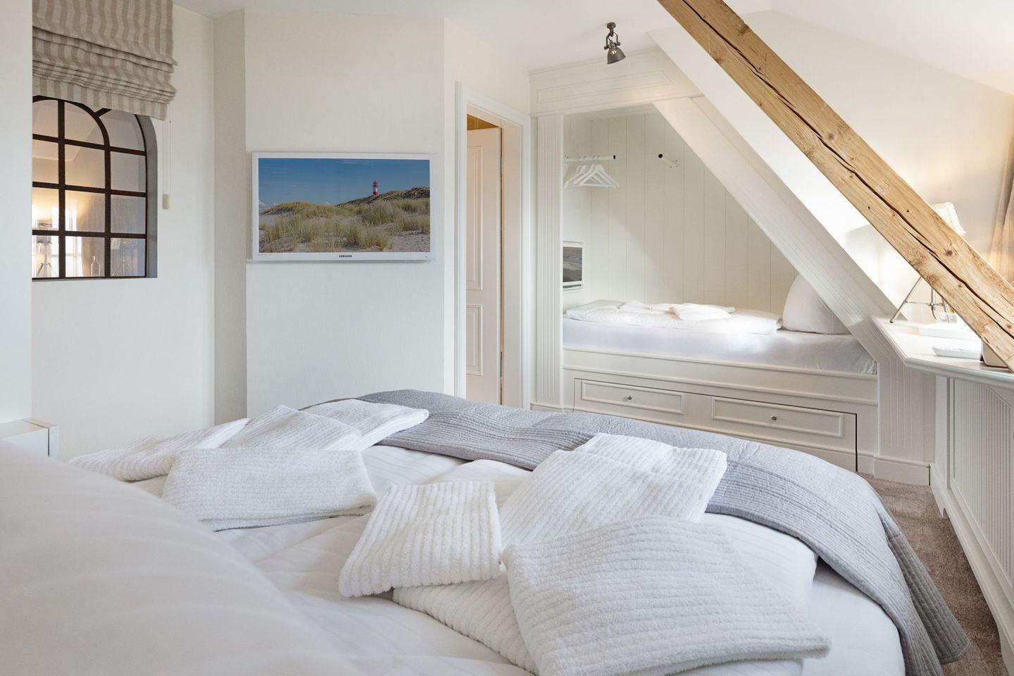 Willkommen im „Seaside“, Ihrer idealen Ferienunterkunft auf der malerischen Insel Sylt. Diese exklusive Unterkunft bietet nicht nur Platz für bis zu 4 Gäste, sondern auch eine Vielzahl an Annehmlichkeiten, um Ihren Aufenthalt unvergesslich zu machen. Ihnen stehen drei Schlafzimmer zur Verfügung. Zwei davon befinden sich im 1.OG, mit je einem Doppelbett. Im Master Bedroom findet sich zudem zusätzlich eine Schlafalkove. Bei dem dritten Schlafzimmer handelt es sich um ein Einzelzimmer im Souterrain des Hauses.