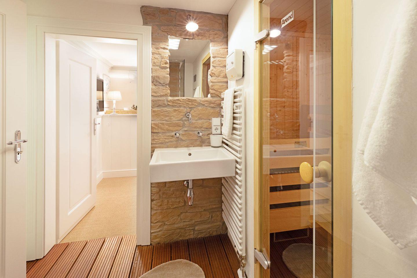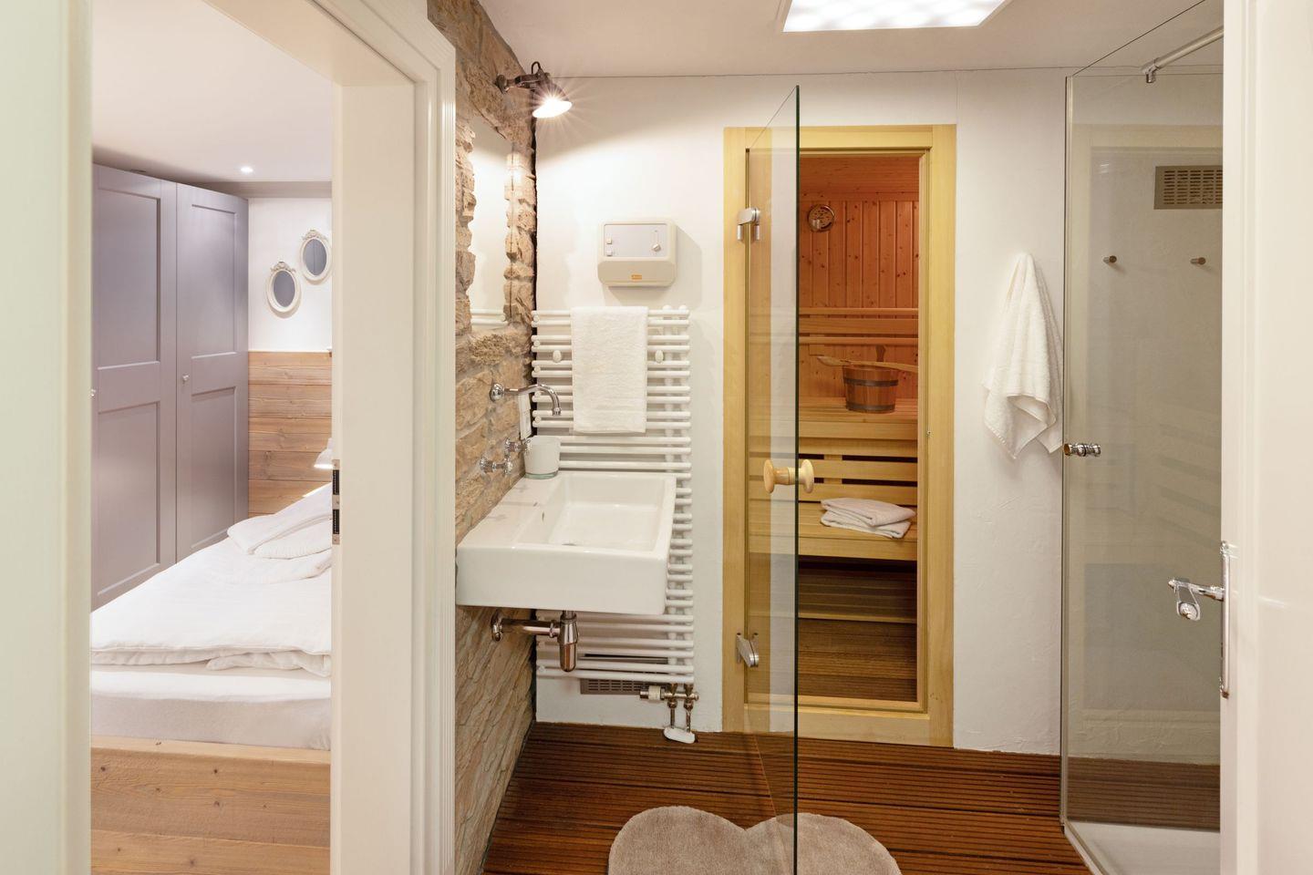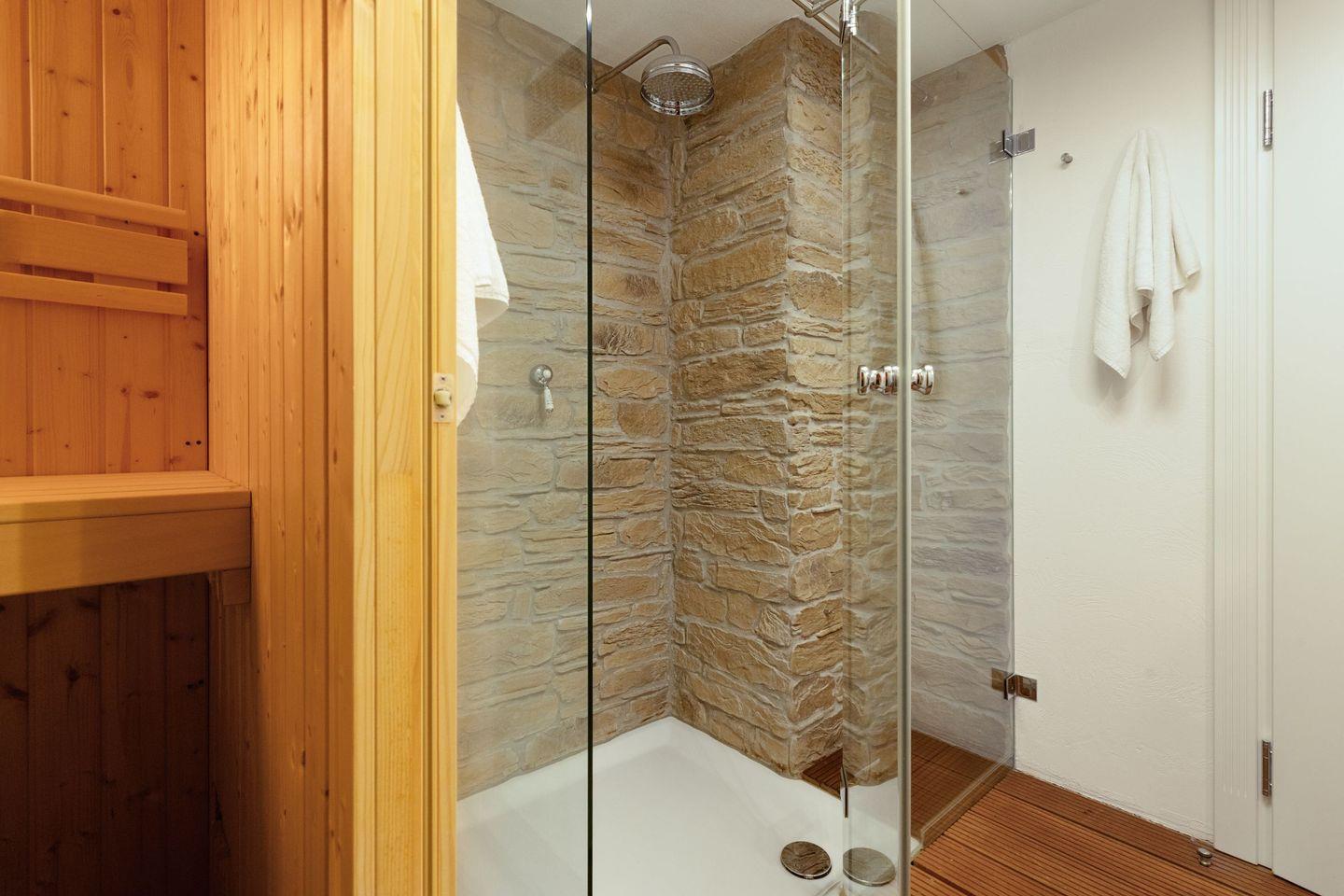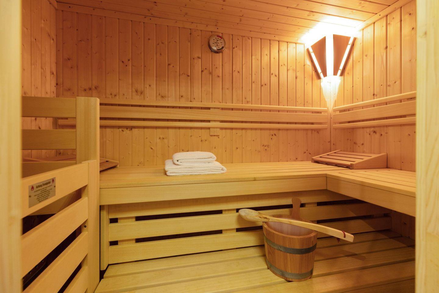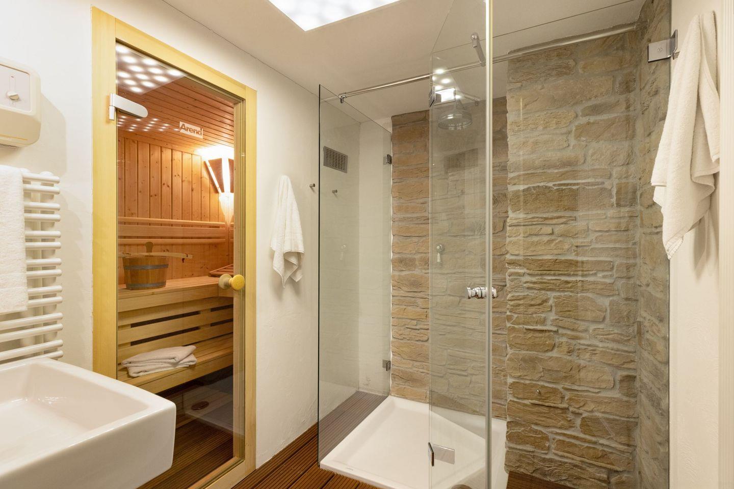 Eine große Sauna mit zusätzlicher Dusche ist ebenfalls vorhanden.