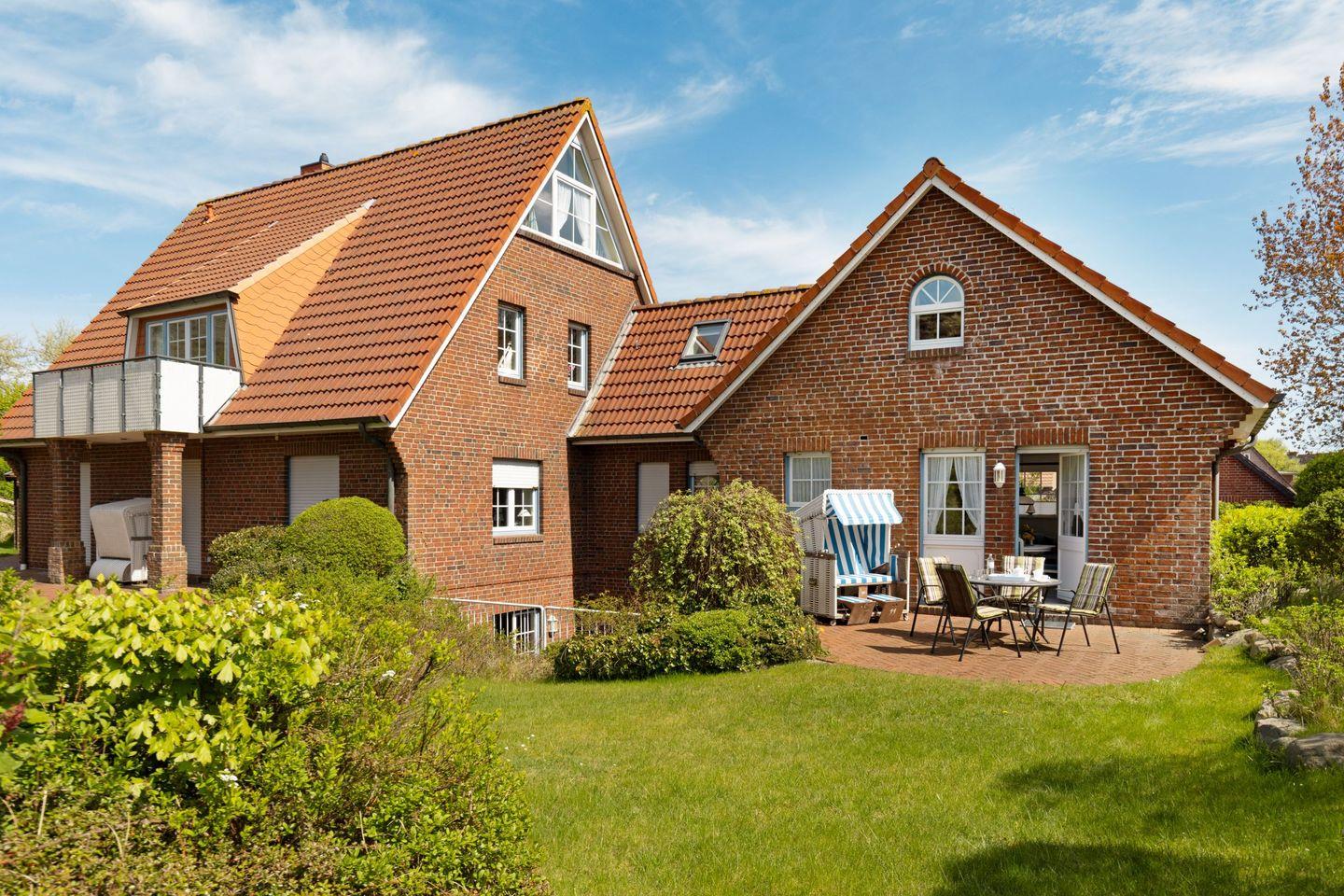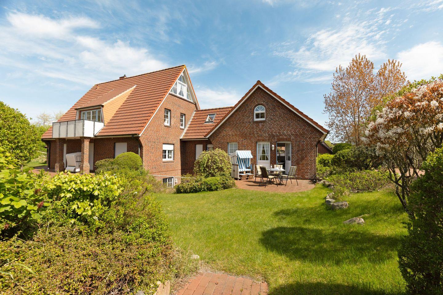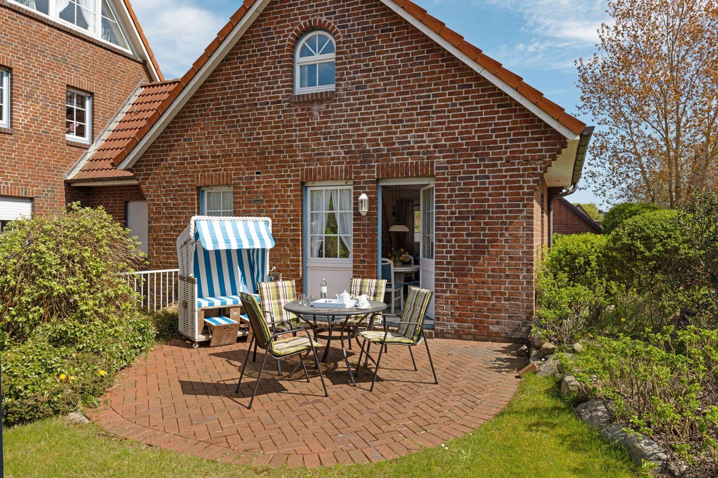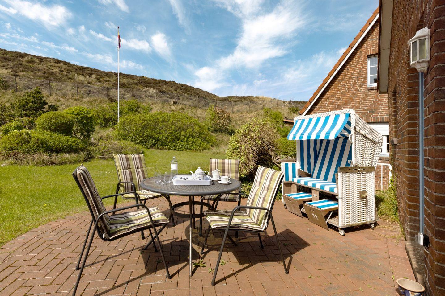 Auf der möblierten Terrasse genießen Sie die frische Nordseeluft und den Blick ins Grüne. Gartenmöbel und Strandkorb stehen Ihnen saisonal zur Verfügung.