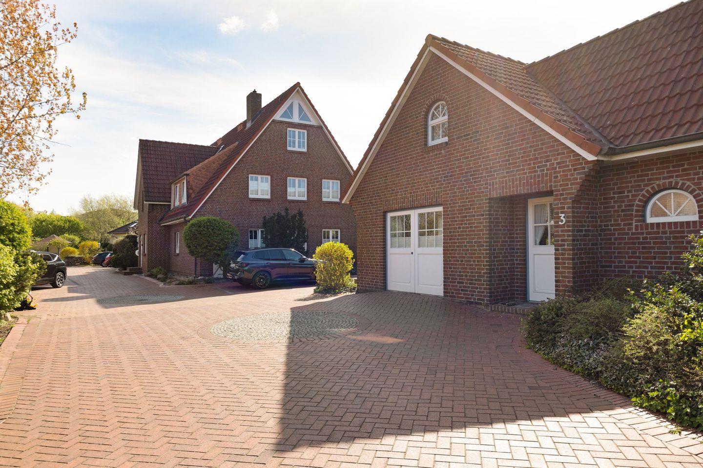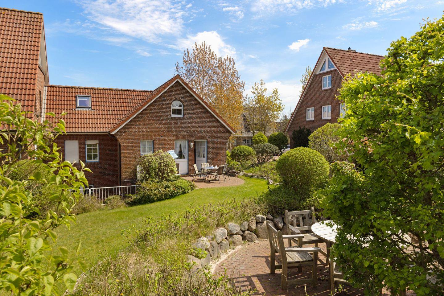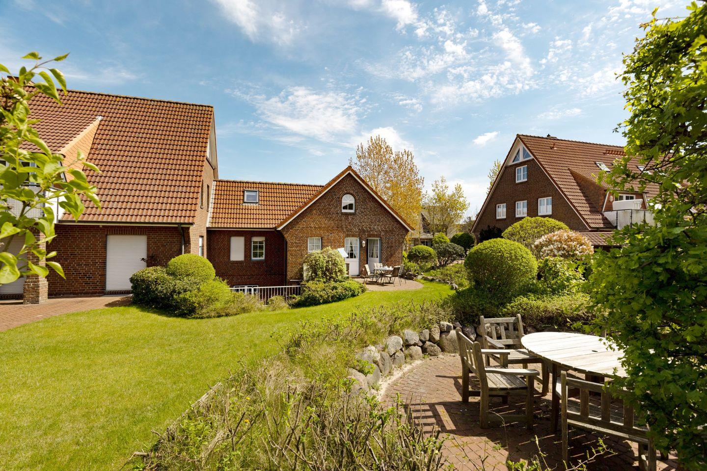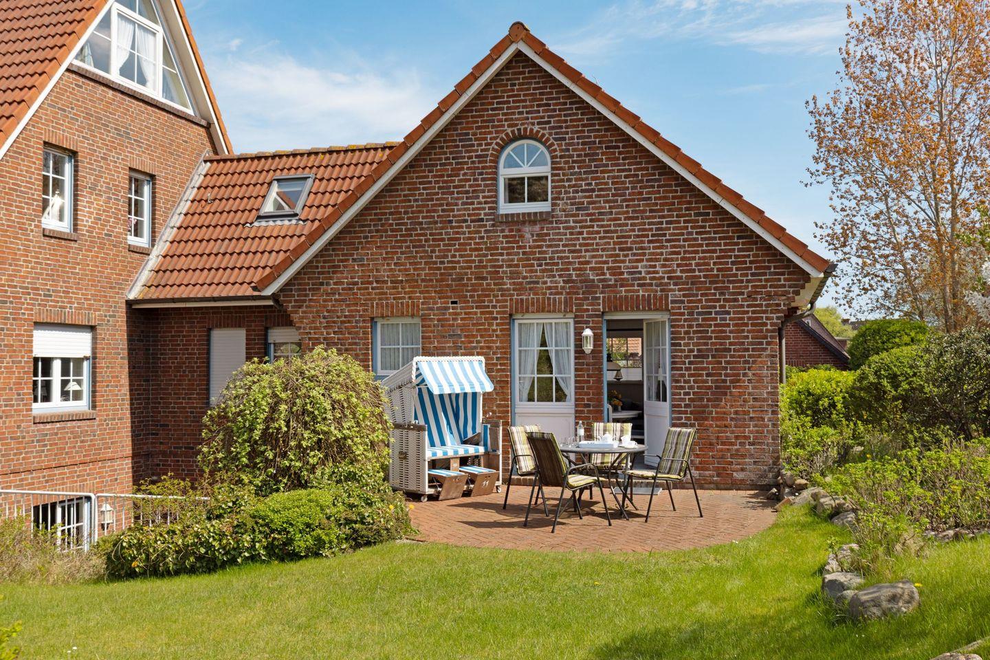 Auf der möblierten Terrasse genießen Sie die frische Nordseeluft und den Blick ins Grüne. Gartenmöbel und Strandkorb stehen Ihnen saisonal zur Verfügung.