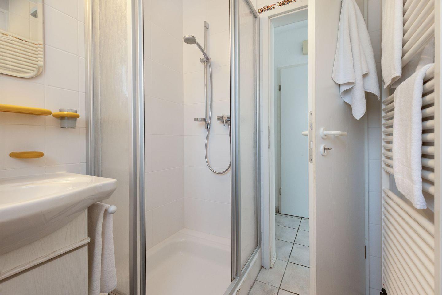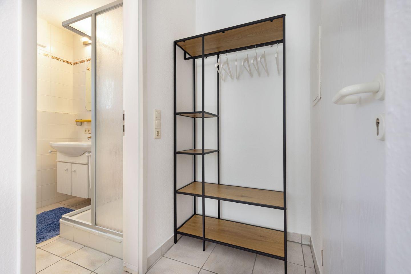 Das Schlafzimmer bietet ein komfortables Doppelbett und ausreichend Stauraum. Das Badezimmer verfügt über eine Dusche, Waschbecken und WC – alles, was Sie für Ihren täglichen Komfort brauchen.