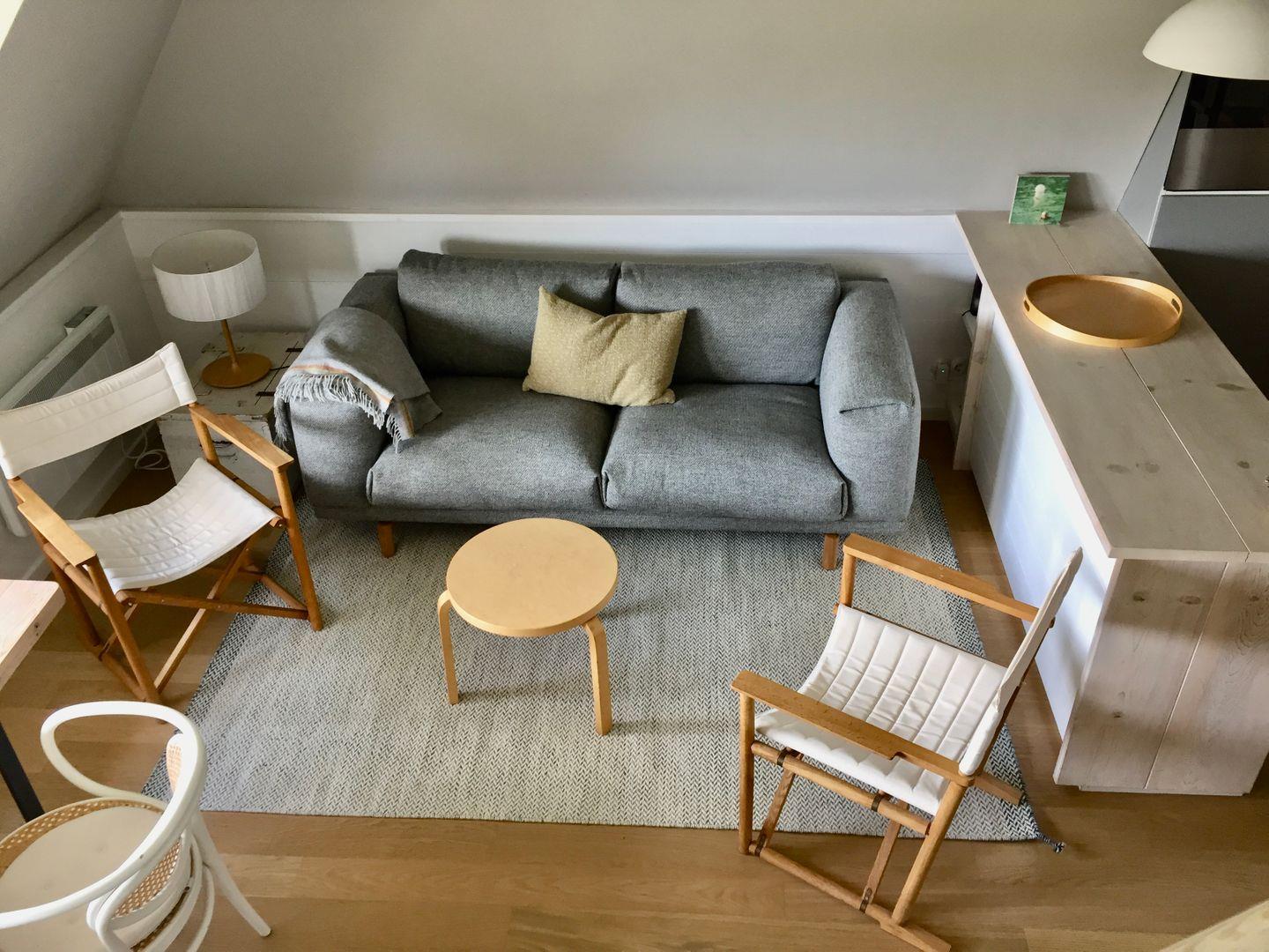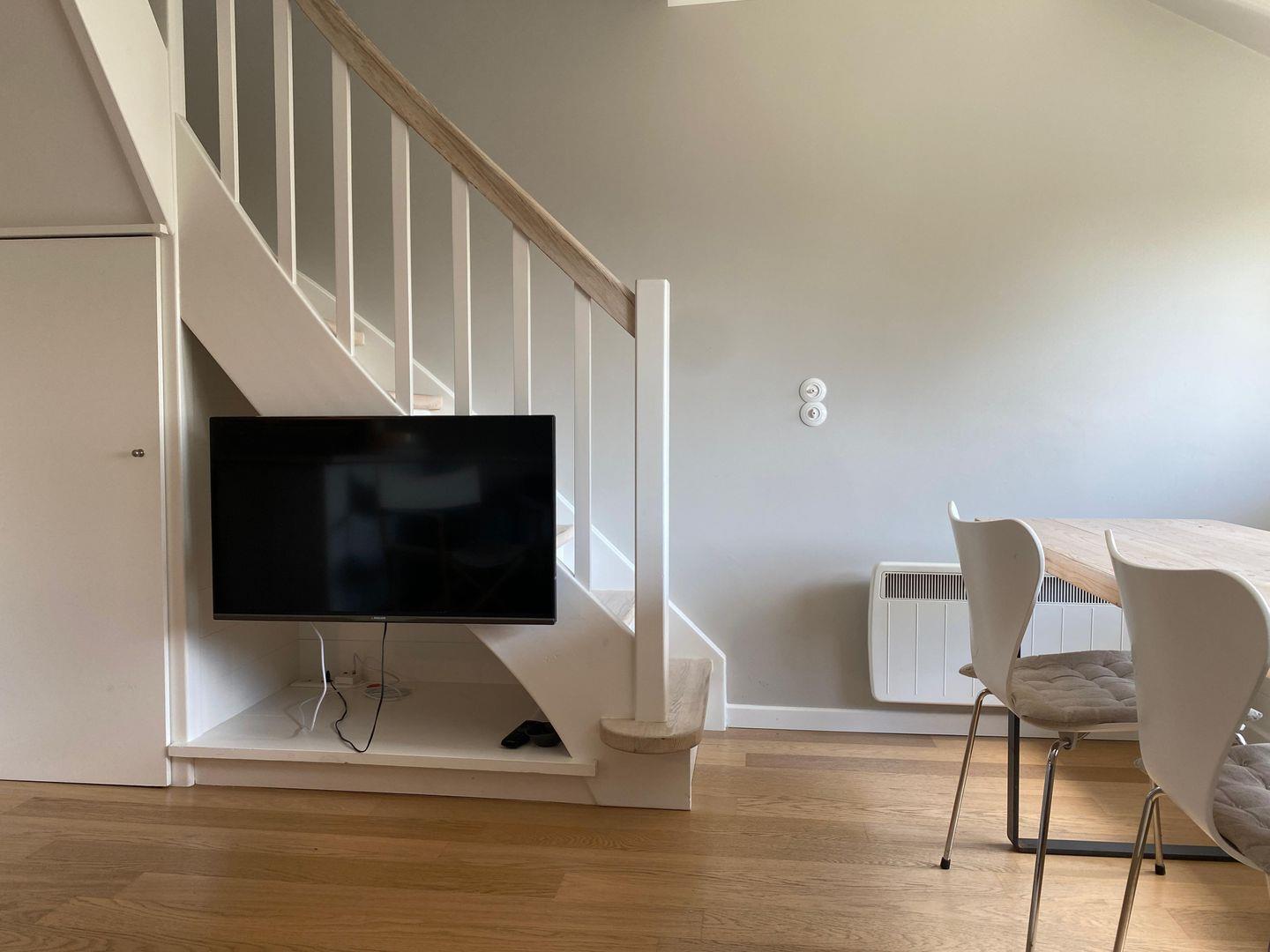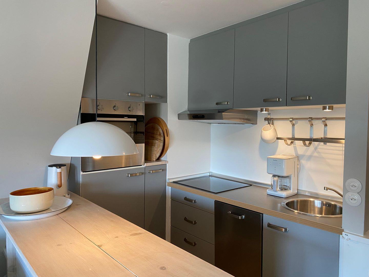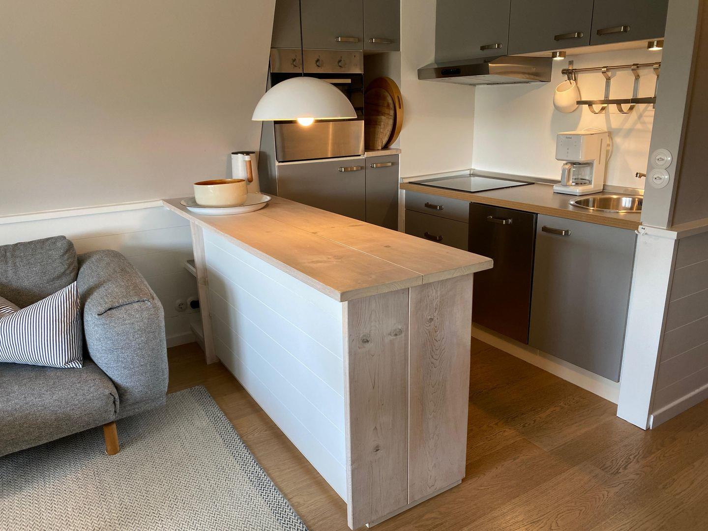 Die Wohnung ist modern und funktional eingerichtet. Der Wohnbereich umfasst eine bequeme Sofaecke, einen Essbereich mit Esstisch sowie einen Fernseher, der für entspannte Abende sorgt. Bücher stehen ebenfalls bereit und sorgen für zusätzliche Unterhaltung. Die offene Küche ist zum Wohnzimmer hin ausgerichtet und mit modernen Geräten ausgestattet: Neben einem Cerankochfeld, Backofen mit Elektroanschluss, Kühlschrank mit integriertem Gefrierfach und Spülmaschine finden Sie dort auch Küchenutensilien, Kaffeemaschine, Wasserkocher sowie Toaster.