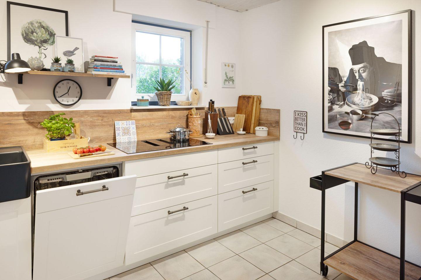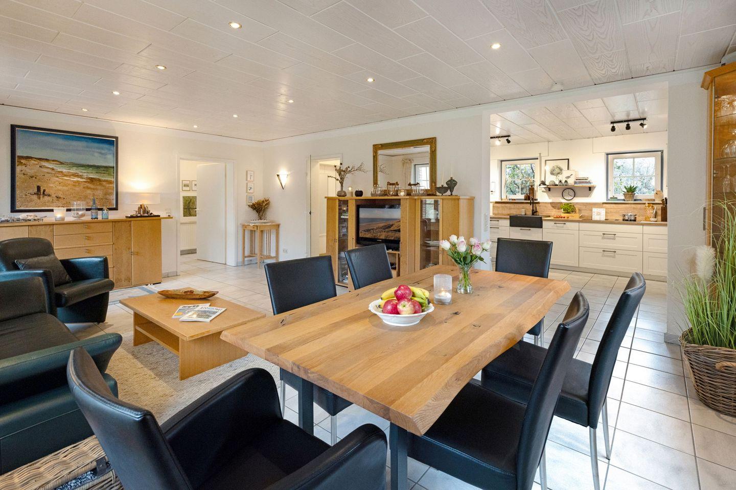 Der helle Wohnbereich mit Sofaecke, Sessel und TV lädt zum Entspannen ein. Die moderne, offene Küche ist gut ausgestattet, und der angrenzende Essbereich bietet Raum für gemeinsame Mahlzeiten.