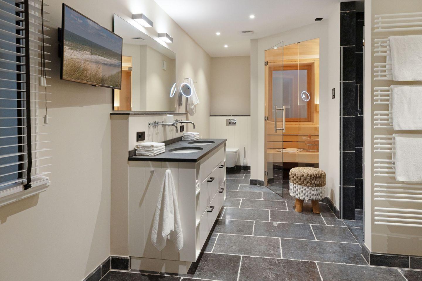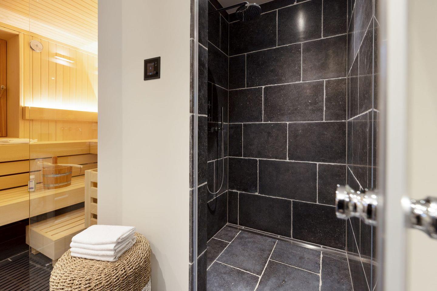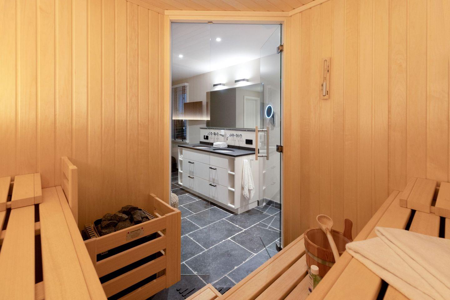 Drei komfortable Schlafzimmer, zwei moderne Badezimmer mit bodengleichen Duschen, ein Gäste-WC sowie ein privater Wellnessbereich mit Sauna und Ruheraum sorgen für höchsten Wohnkomfort.