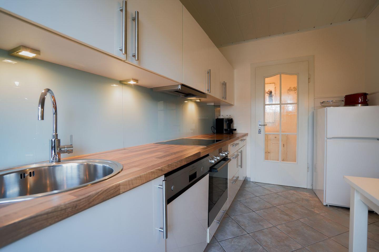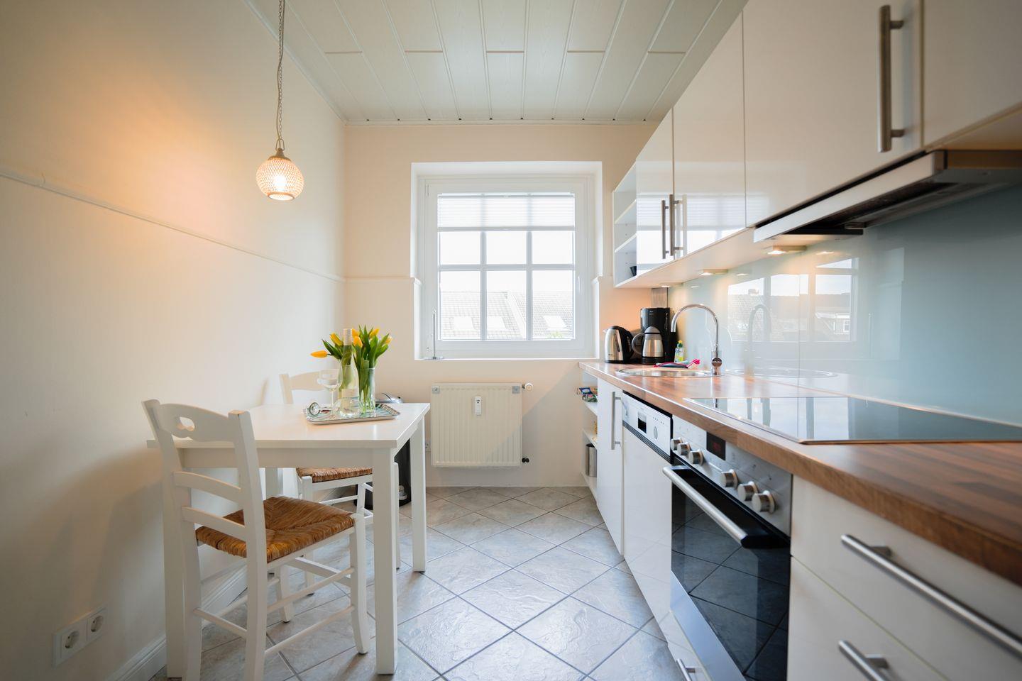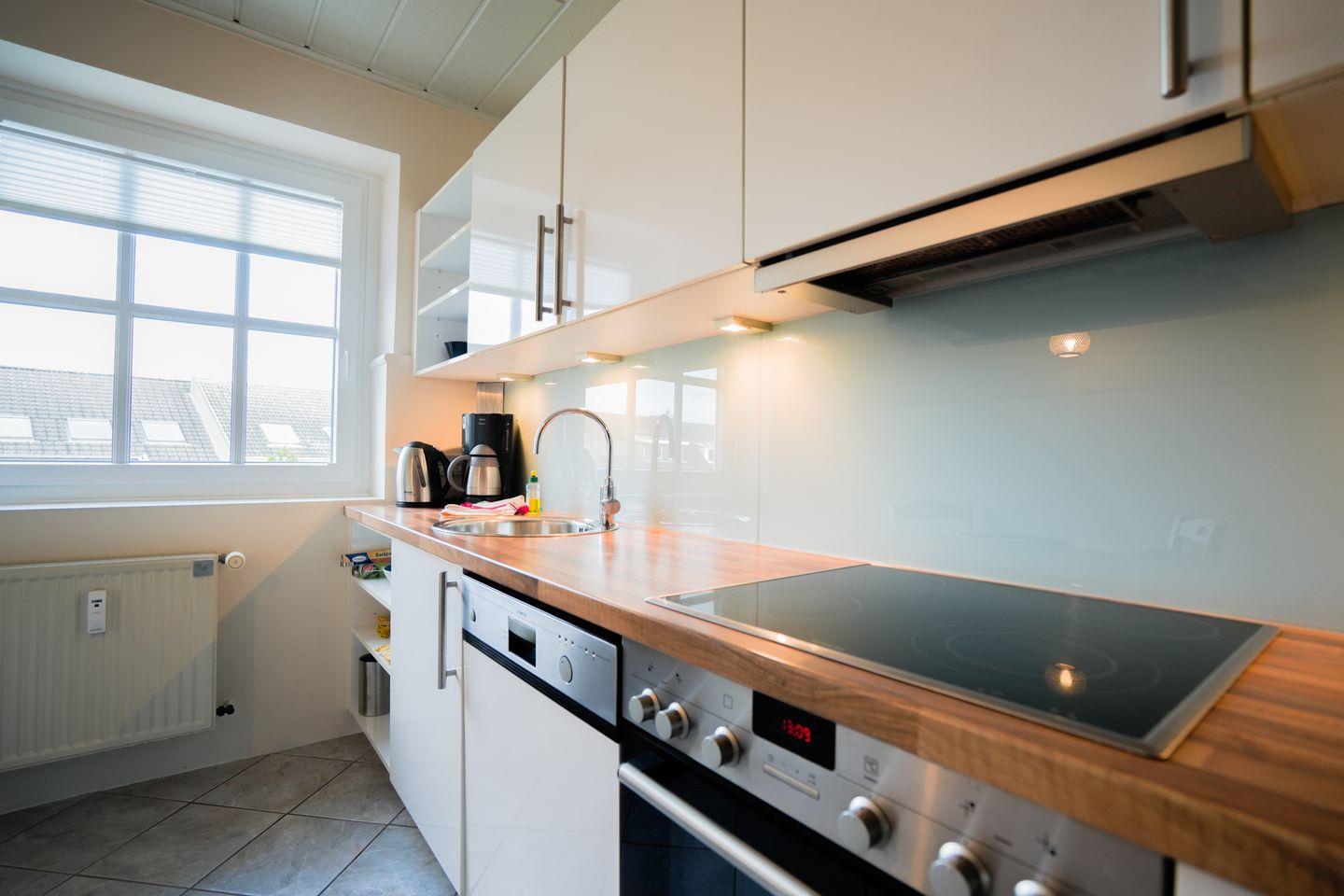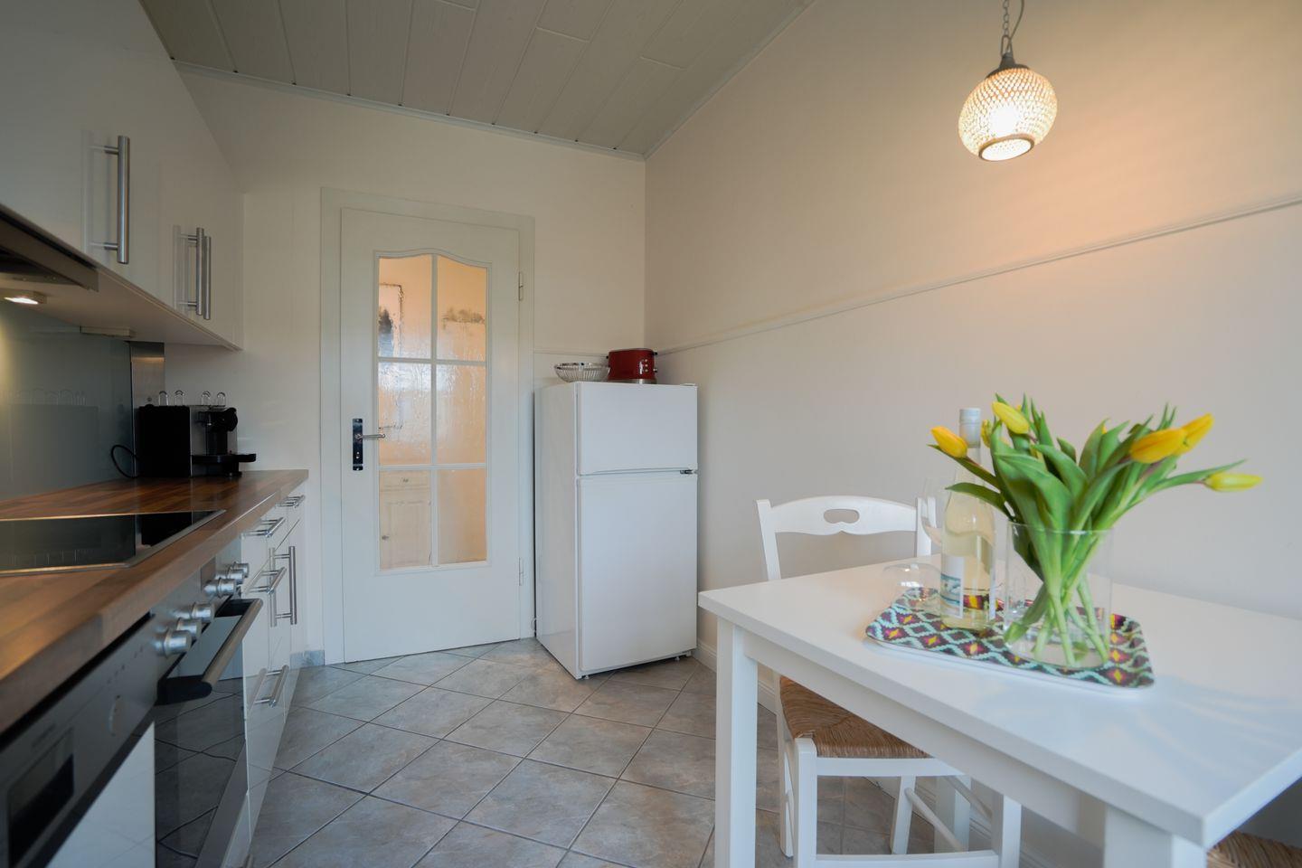 Die geschlossene Küche ist vollständig und hochwertig ausgestattet: Sie finden dort einen Ceranherd mit Elektro-Backofen, Kühlschrank und einen extra Gefrierschrank, Spülmaschine, Toaster, Wasserkocher, Espressomaschine DeLonghi, sowie eine klassische Kaffeemaschine. Küchenutensilien sind in passender Anzahl vorhanden, sodass Sie sich nach Belieben selbst versorgen können.
