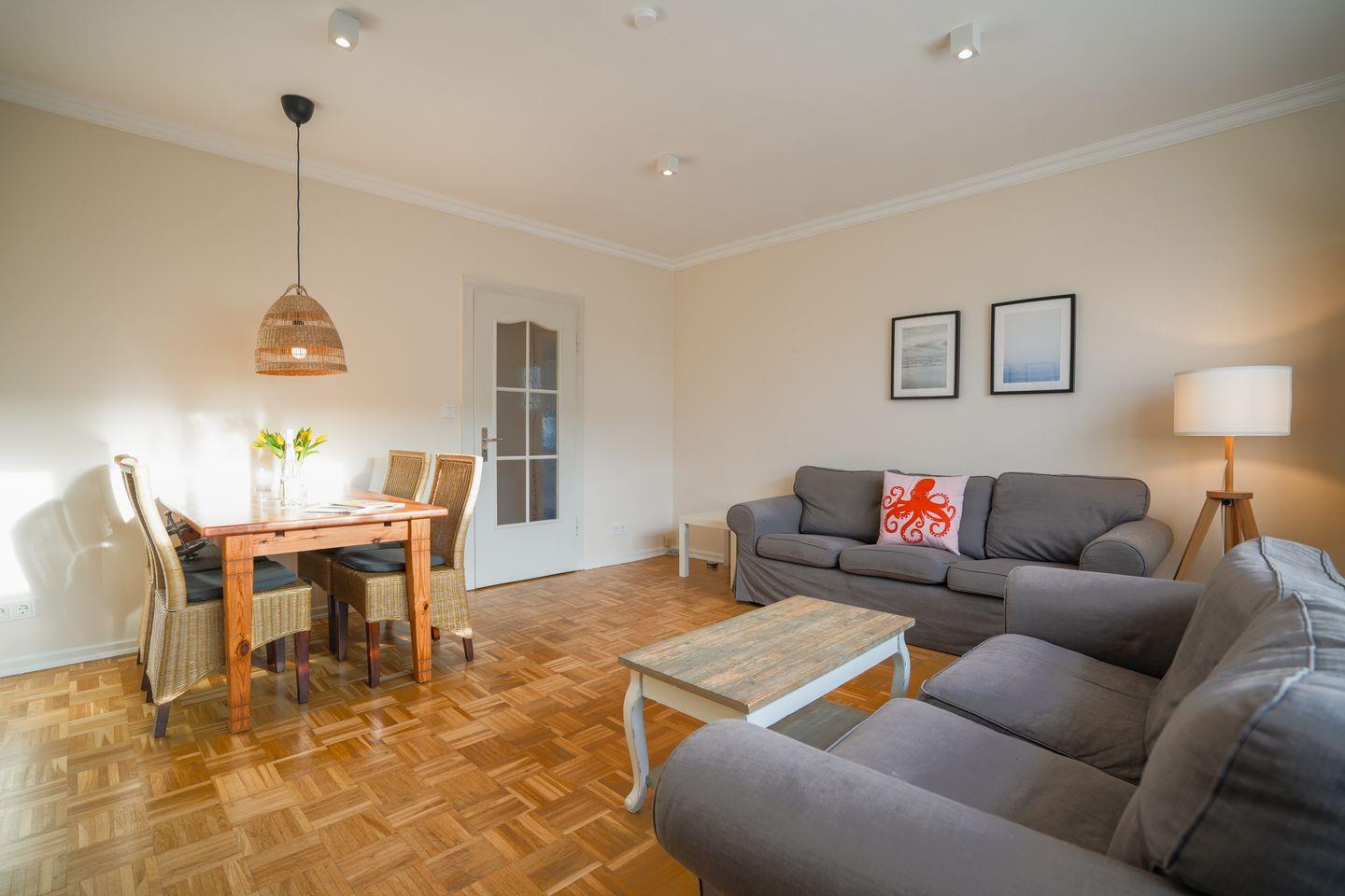 Die Ferienwohnung verfügt über zwei separate Schlafzimmer. Hierbei handelt es sich um ein Doppelbettschlafzimmer und ein Schlafzimmer mit Etagenbett, sowie ein Einzelbett. Im zentralen Wohnbereich lädt eine gemütliche Sofaecke zum Verweilen und Entspannen ein. Direkt angrenzend befindet sich der moderne Essbereich mit Esstisch, der für gesellige Mahlzeiten in angenehmem Ambiente sorgt. Zum Angebot für Familien und kleine Gruppen zählt außerdem ein großzügiges Badezimmer mit Duschwanne und WC. Ein Haartrockner, Kosmetikspiegel, Ganzkörperspiegel (im Schlafzimmer) und reichlich Ablagemöglichkeiten sorgen für einen rundum komfortablen Aufenthalt.