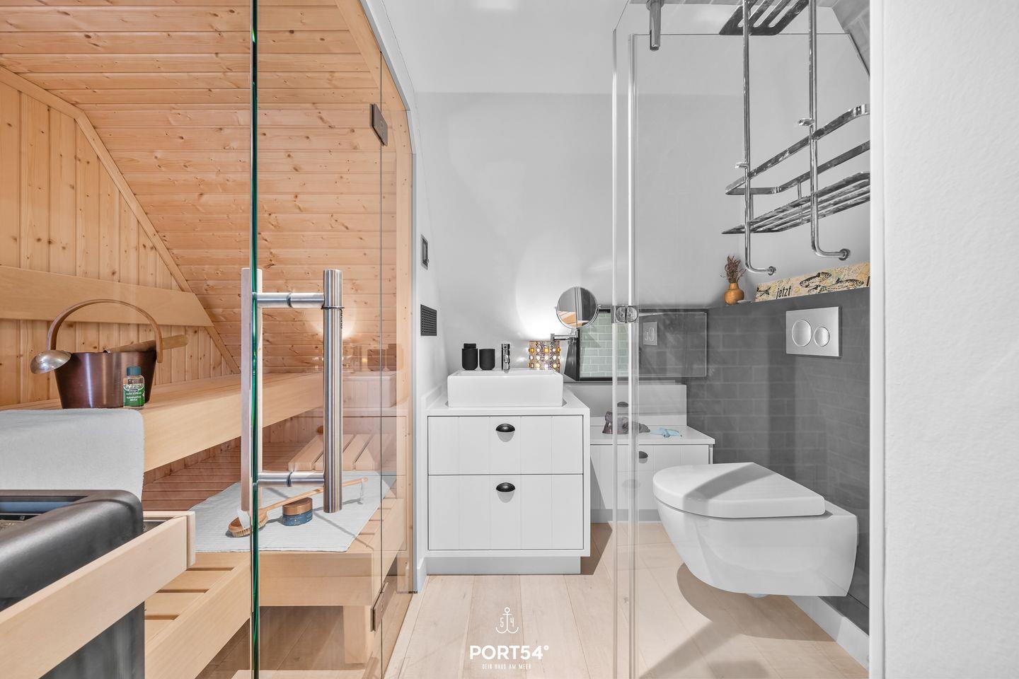 Ein besonderes Highlight ist der exklusive Wellnessbereich mit Sauna zur Eigennutzung, der sich im Haus befindet und bequem erreichbar ist. Hier kannst du nach einem erlebnisreichen Tag am Strand entspannen und neue Energie tanken. Außerdem ist hier auch eine Dusche vorhanden um sich direkt nach dem Saunagang zu erfrischen und dann auf den Liegen zu entspannen. Bitte beachte, dass der private Wellnessbereich über das Treppenhaus im 2 OG zu erreichen ist.