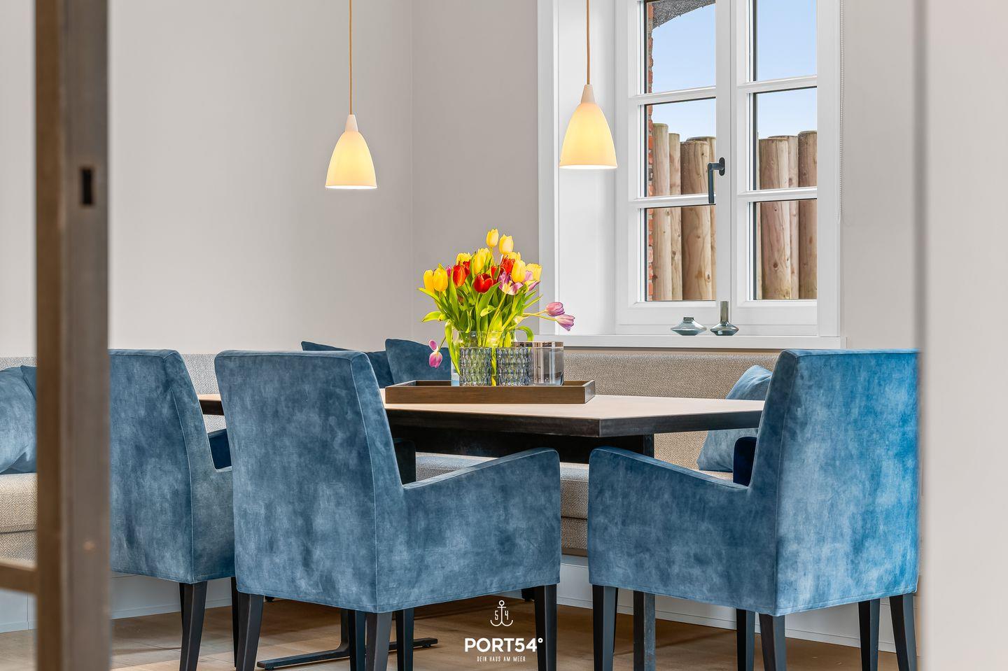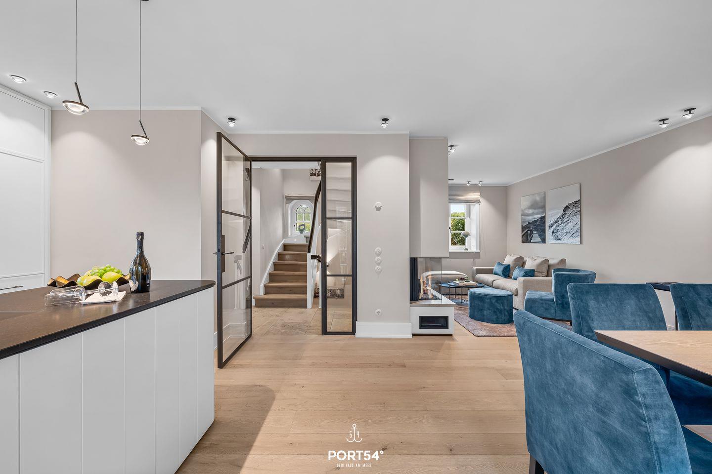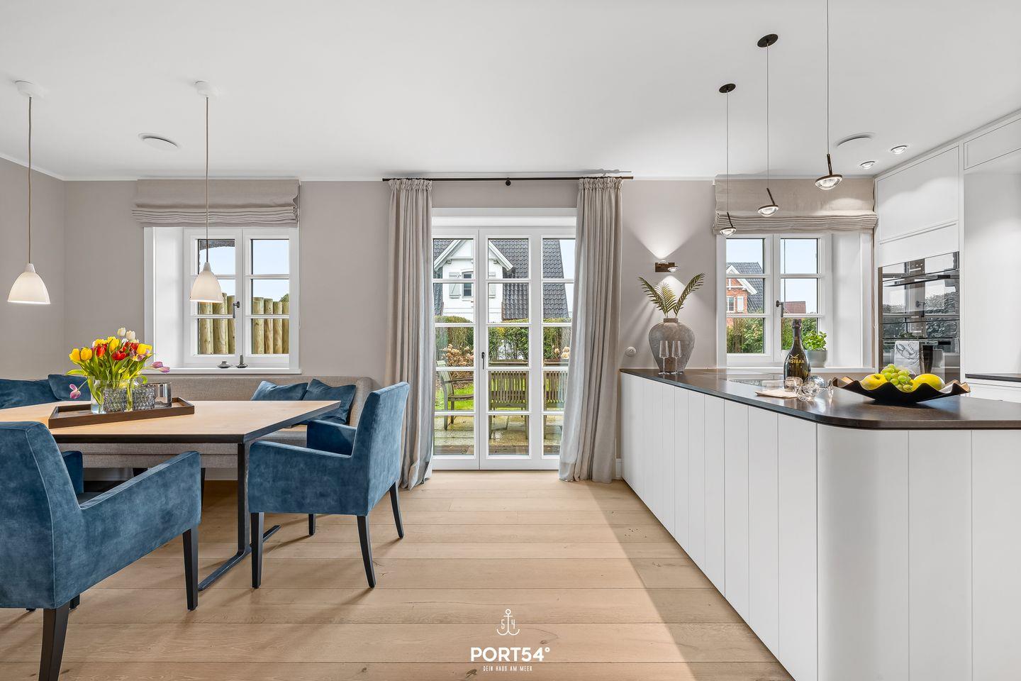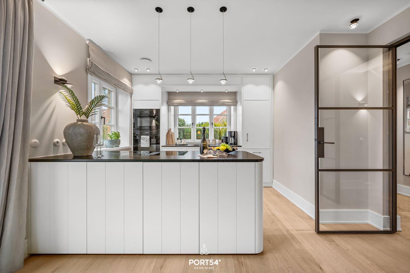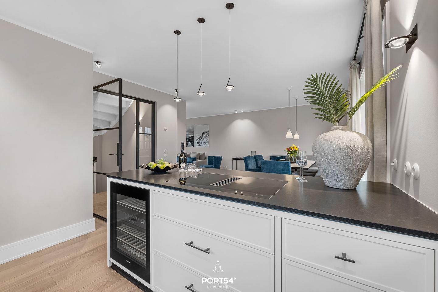 Die moderne Küche ist vollständig eingerichtet und ermöglicht komfortables Selbstversorgen. Neben Induktionskochfeld, Backofen, Mikrowelle und Geschirrspüler stehen selbstverständlich auch Kaffeemaschine, Nespresso-Espressomaschine, Wasserkocher und Toaster bereit – perfekt für ein entspanntes Frühstück vor einem Tag am Strand.