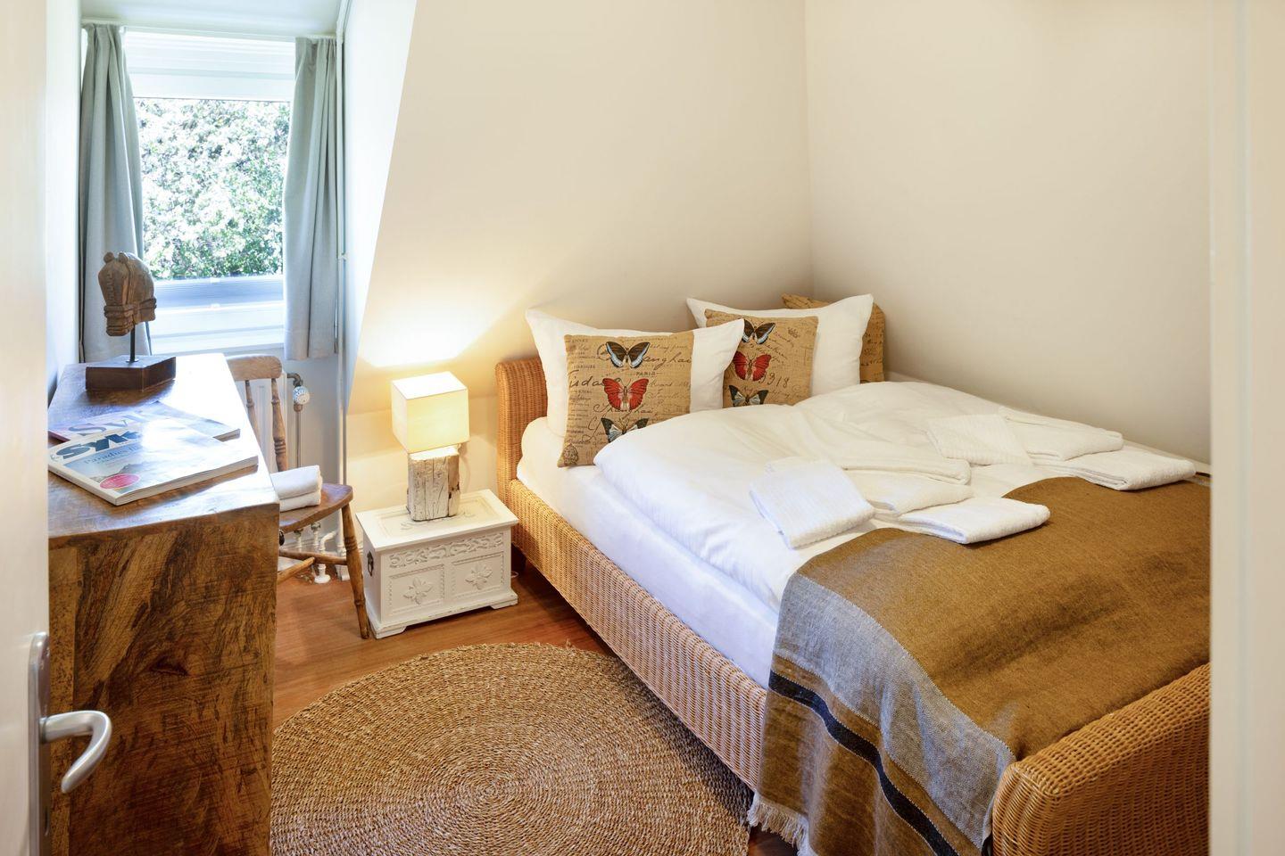 In der oberen Etage befinden sich zwei Schlafzimmer mit Doppelbetten und ein Zimmer mit einem Einzelbett sowie ein Wannenbad.