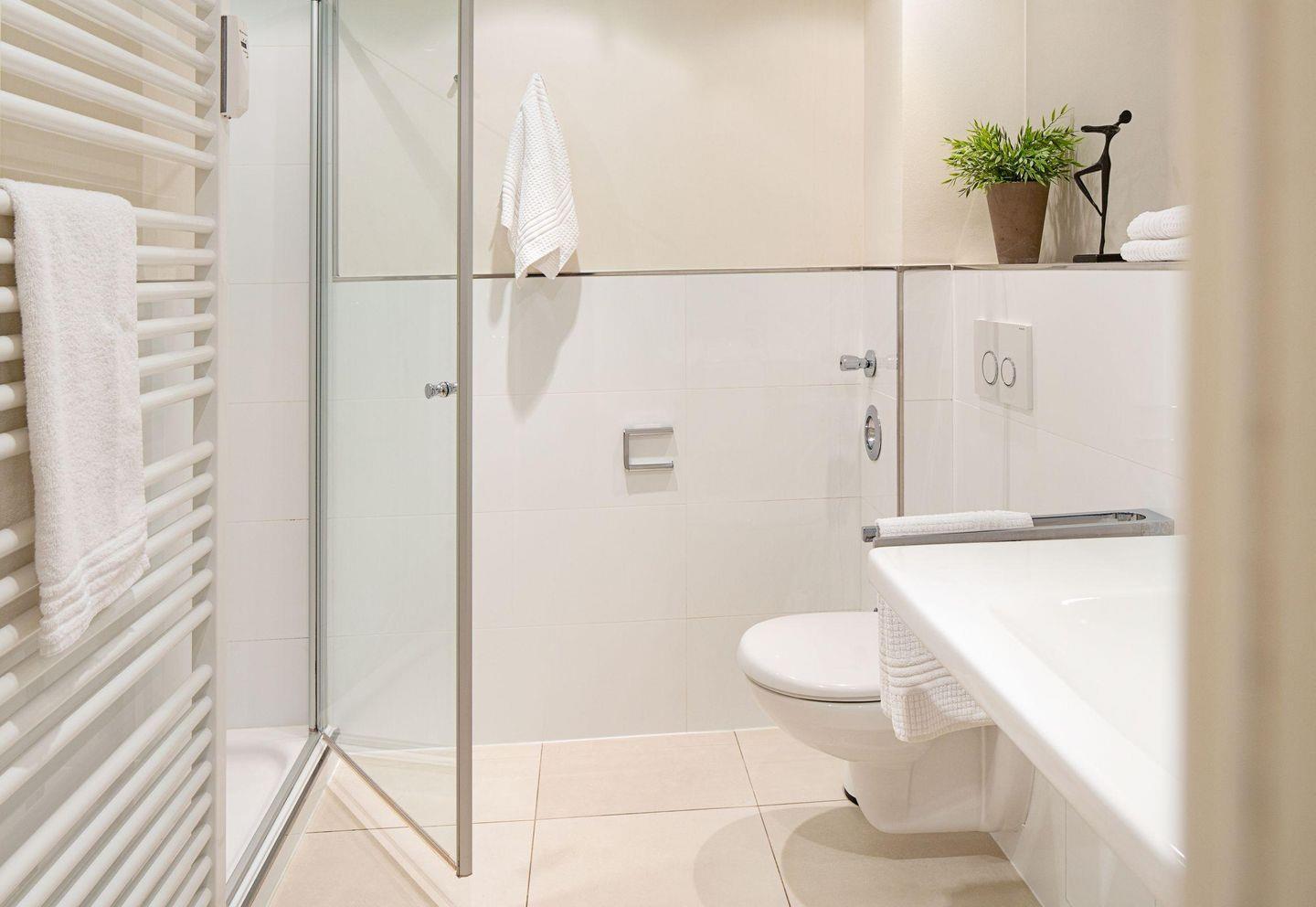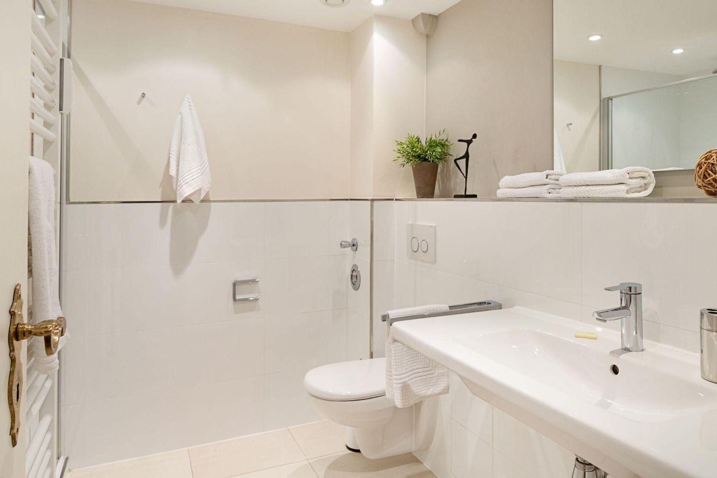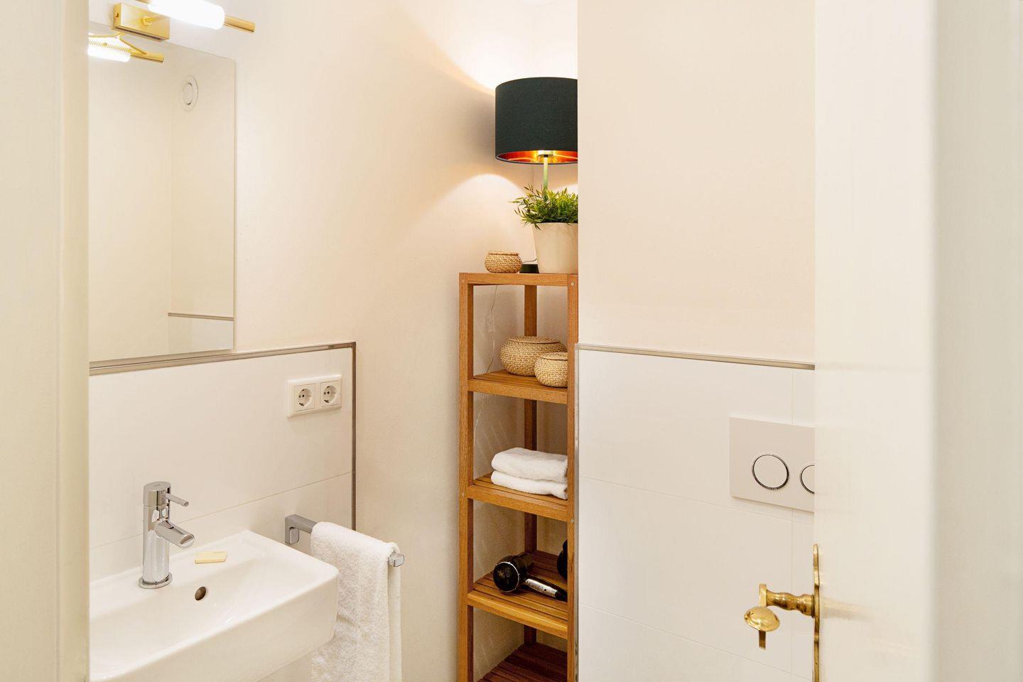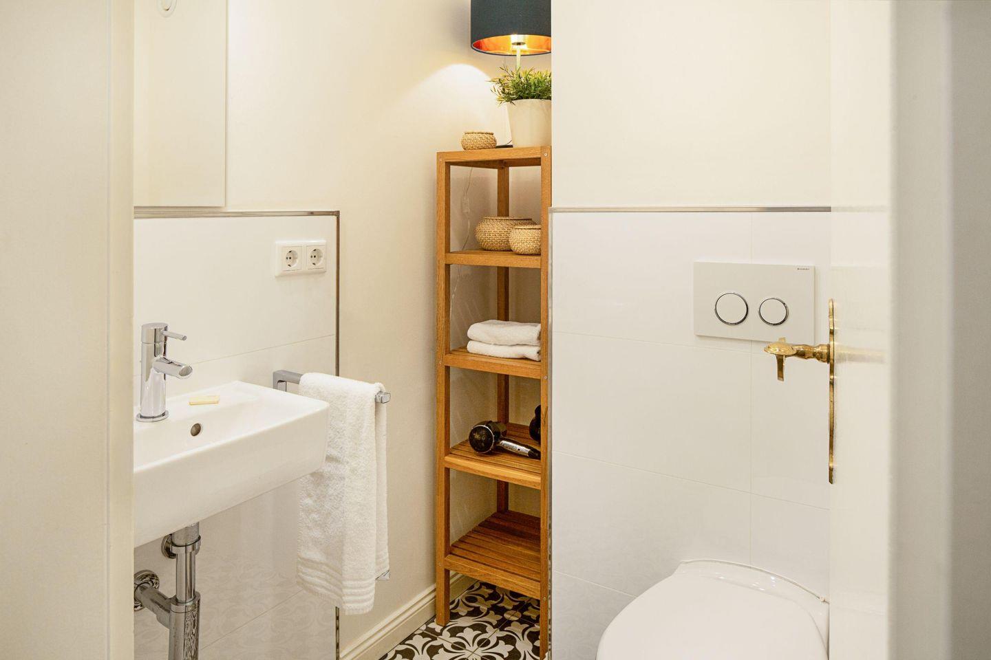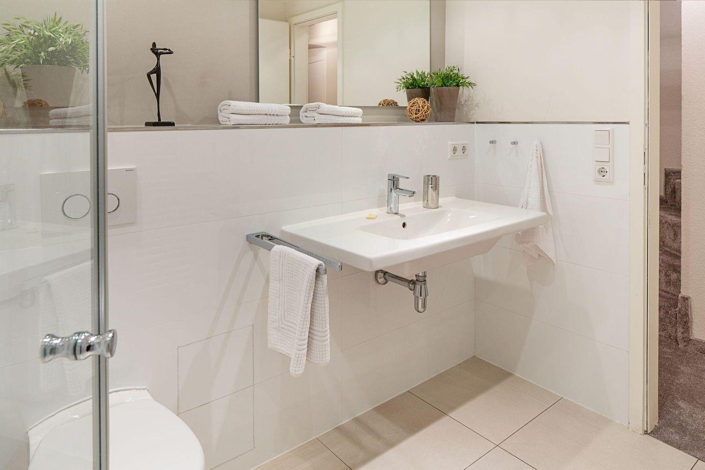 Das helle Badezimmer ist mit einer bodengleichen Dusche, einem Waschbecken und einem Haartrockner ausgestattet, während ein separates Gäste-WC zusätzlichen Komfort bietet. Die Erstausstattung mit Bettwäsche und Handtüchern ist ebenfalls inkludiert.
