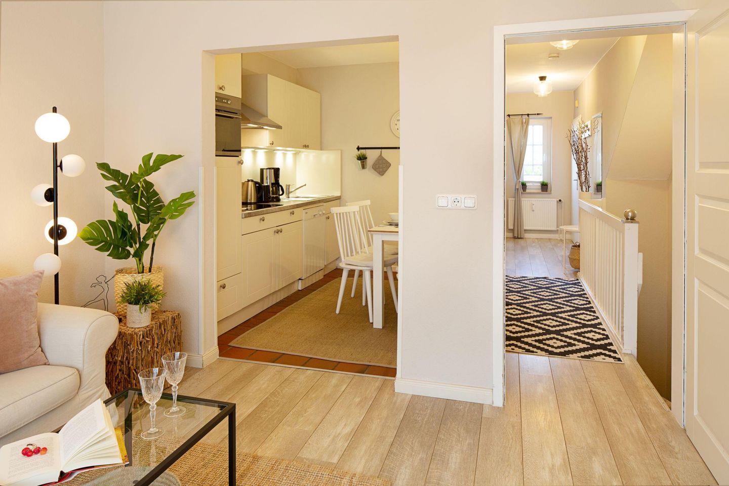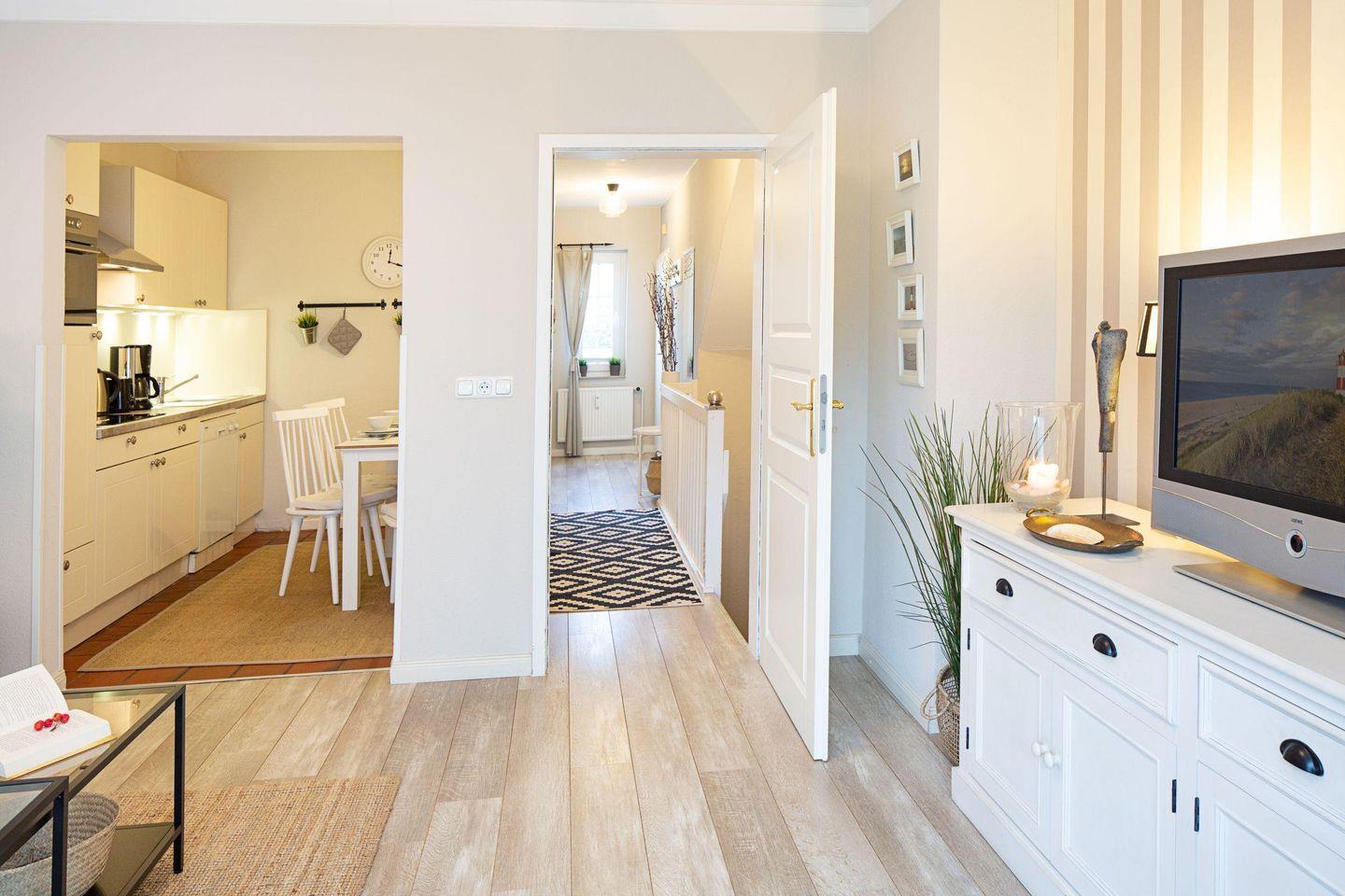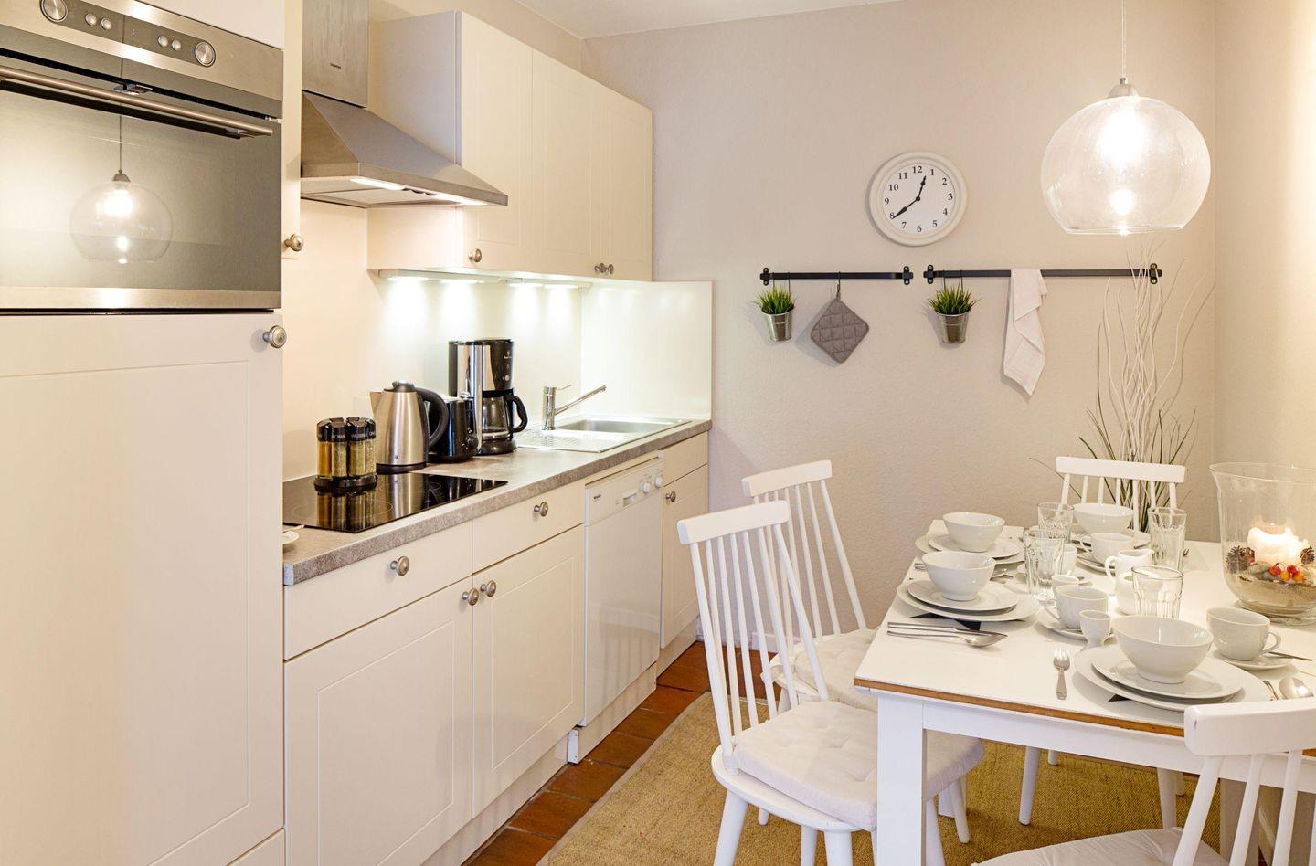 Die voll ausgestattete, Küche bietet Ihnen alles, was Sie zum Kochen benötigen, darunter einen Ceranherd, Backofen, Geschirrspüler und eine Nespresso- Maschine. Der Esstisch lädt zu gemeinsamen Mahlzeiten ein. Genießen Sie frische Brötchen, die Sie bequem über unseren Brötchenservice bestellen können. Die praktische Mikrowelle und das Kühl-Gefrier-Kombinationsgerät erleichtern Ihre Urlaubsvorbereitungen. Für die nötige Gemütlichkeit sorgen zudem W-LAN, eine HiFi-Anlage und eine umfangreiche Auswahl an Büchern, die Sie hier finden.