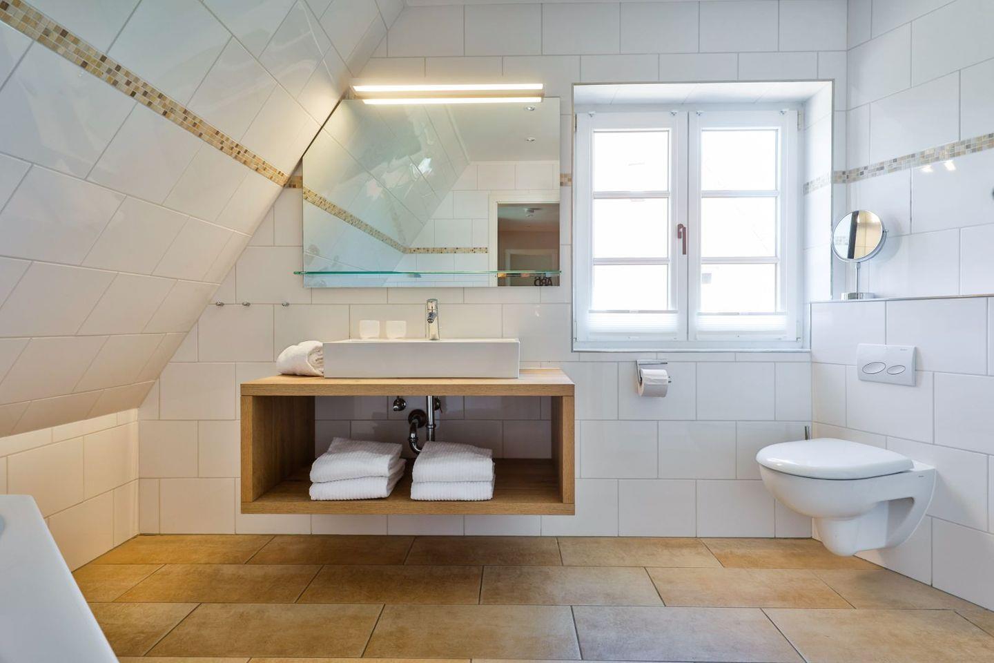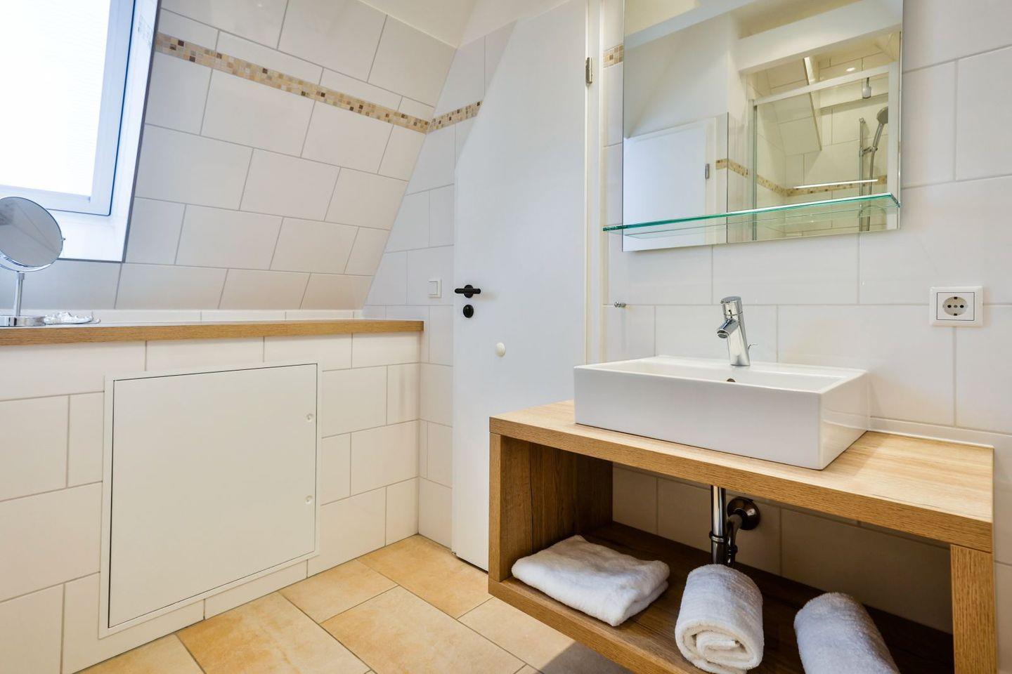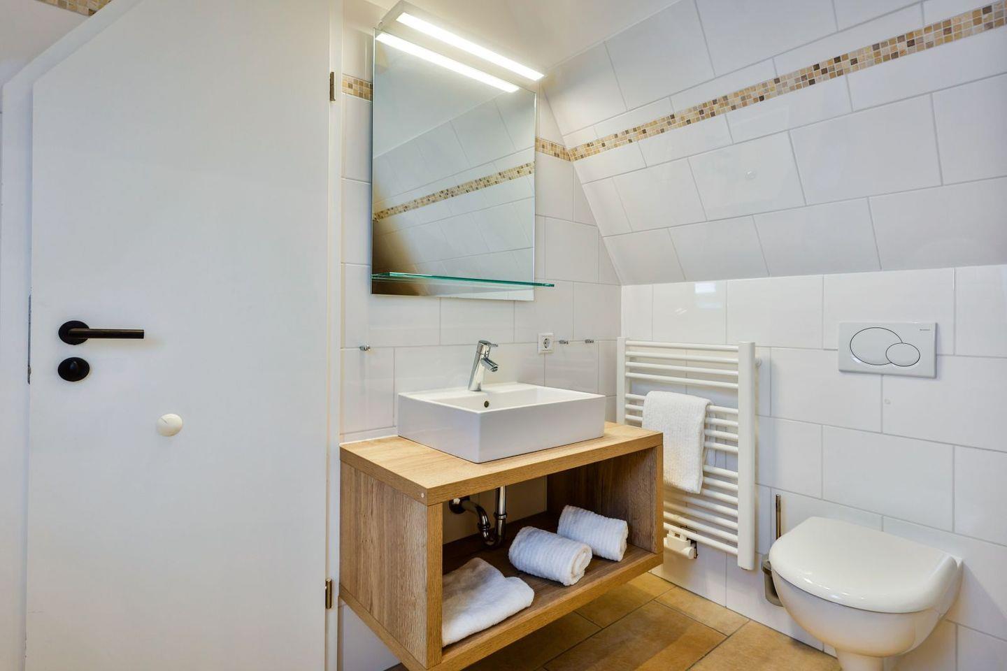 (geschlossene Treppe) befinden sich zwei große Schlafzimmer mit Boxspring-Betten, ein eigener Bereich für die Möglichkeit zum Home-Office sowie ein großes Bad mit Dusche und Badewanne. Im 2.Stock (offene, stark ansteigende Treppe) befindet sich das dritte Schlafzimmer mit zwei Einzelbetten und einem separaten Duschbad. Der großzügige Garten hält Sonnenliegen und eine Sauna bereit.