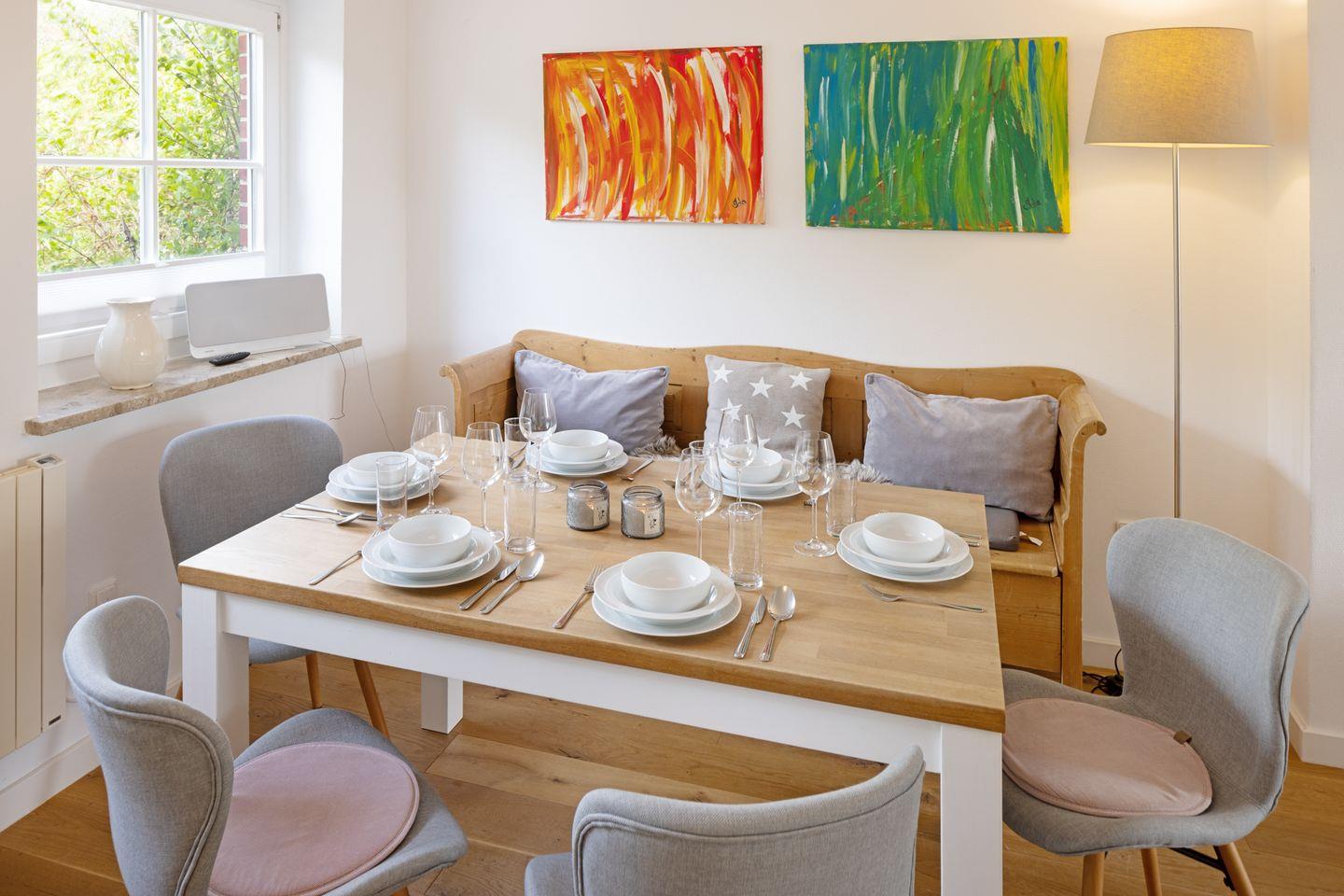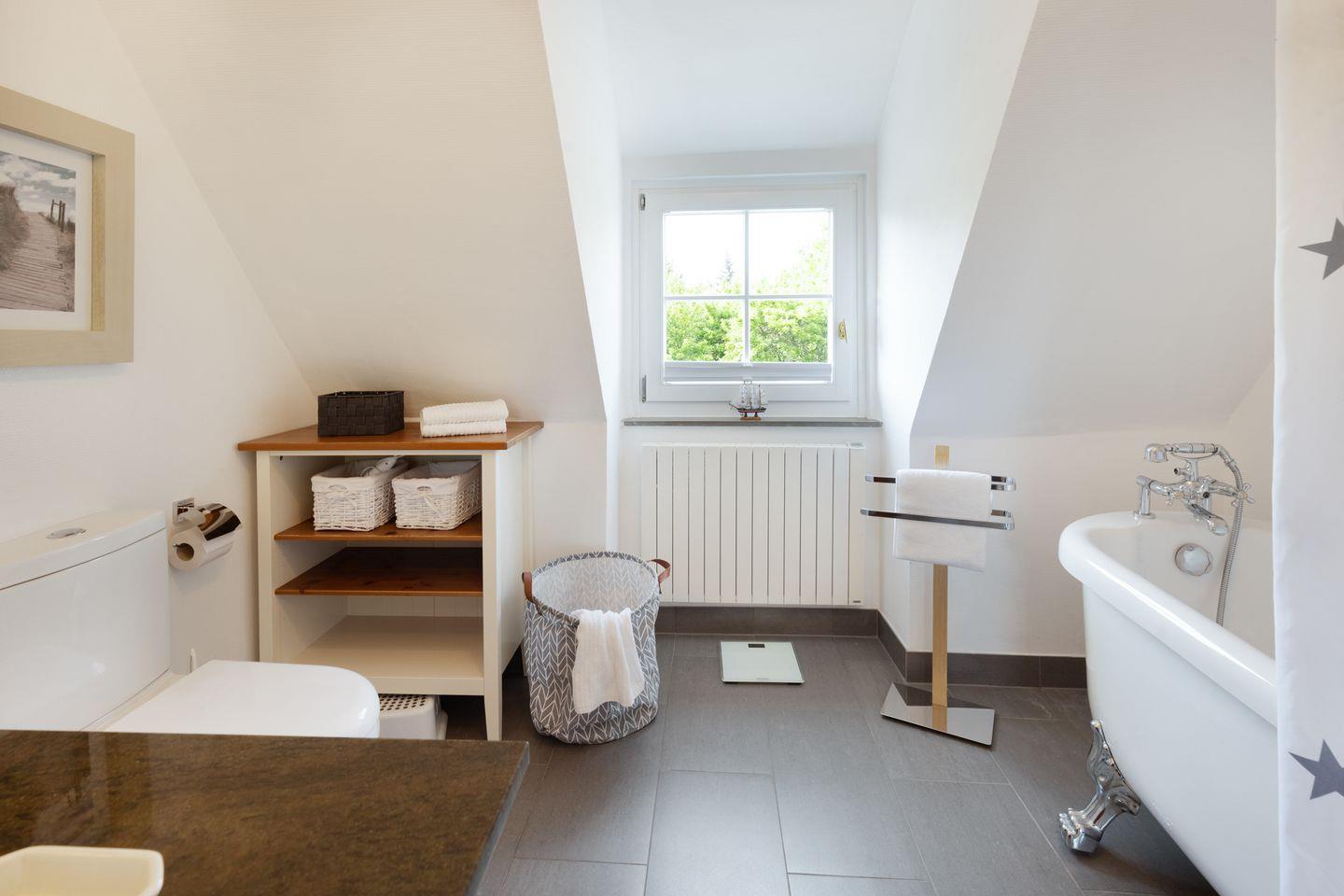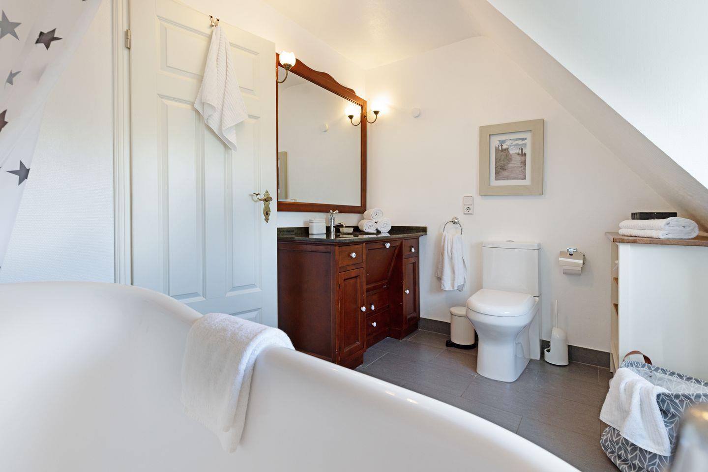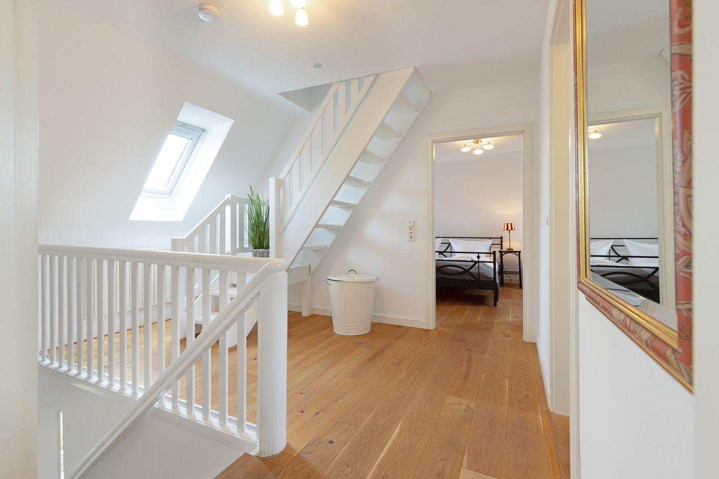 Es verfügt im 1. Stock über zwei Schlafzimmer mit Doppelbetten und Bad mit Wanne und im EG ein Schlafzimmer mit Etagenbett