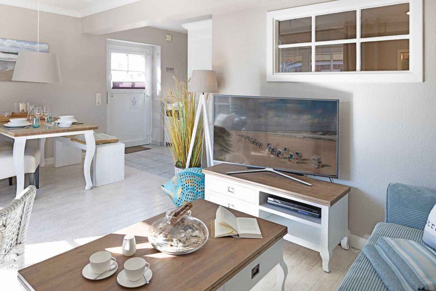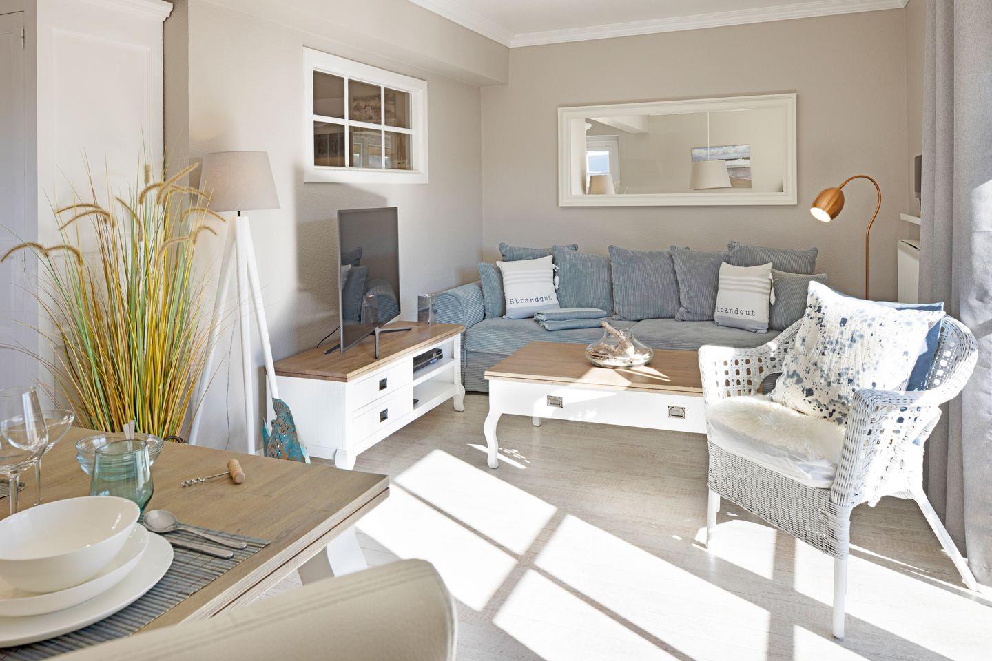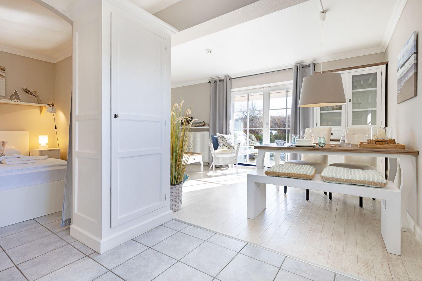 Das Appartement liegt im Erdgeschoss und verfügt über eine direkt vom Wohnraum erreichbare Terrasse mit Strandkorb und Gartenmöbeln. Eine komplett ausgestattete offene Küche, ein Duschbad und Schlafzimmer mit Doppelbett vervollständigen Ihr Domizil. Die 43m² große Ferienwohnung bietet durch ein durchdachtes Raumkonzept viel Platz für Ihren Urlaub.