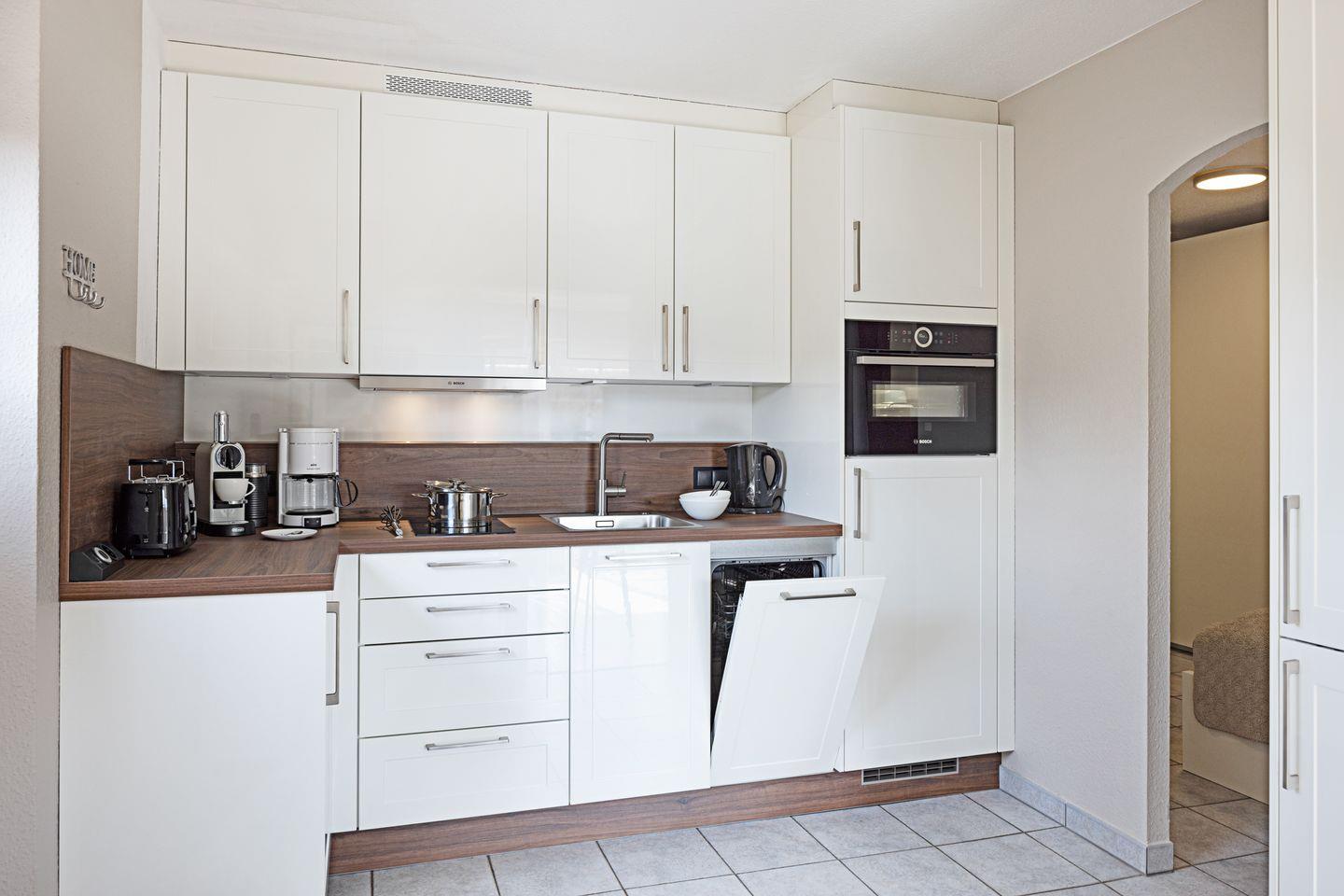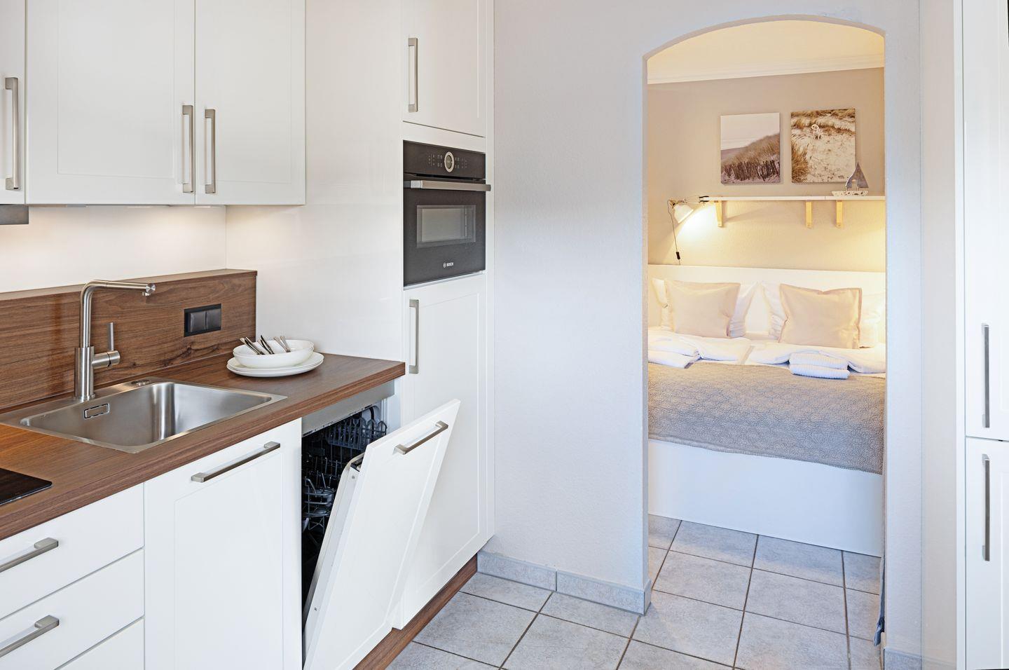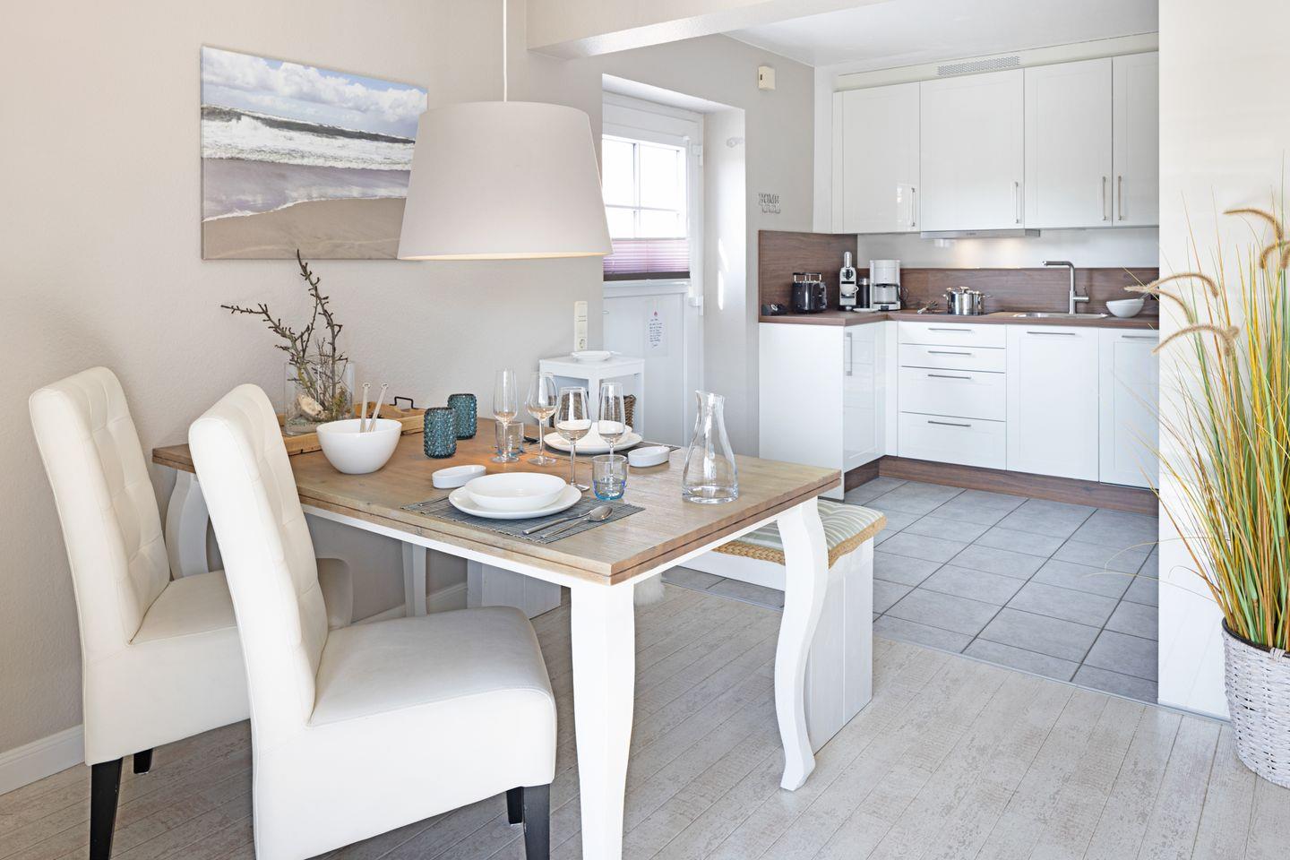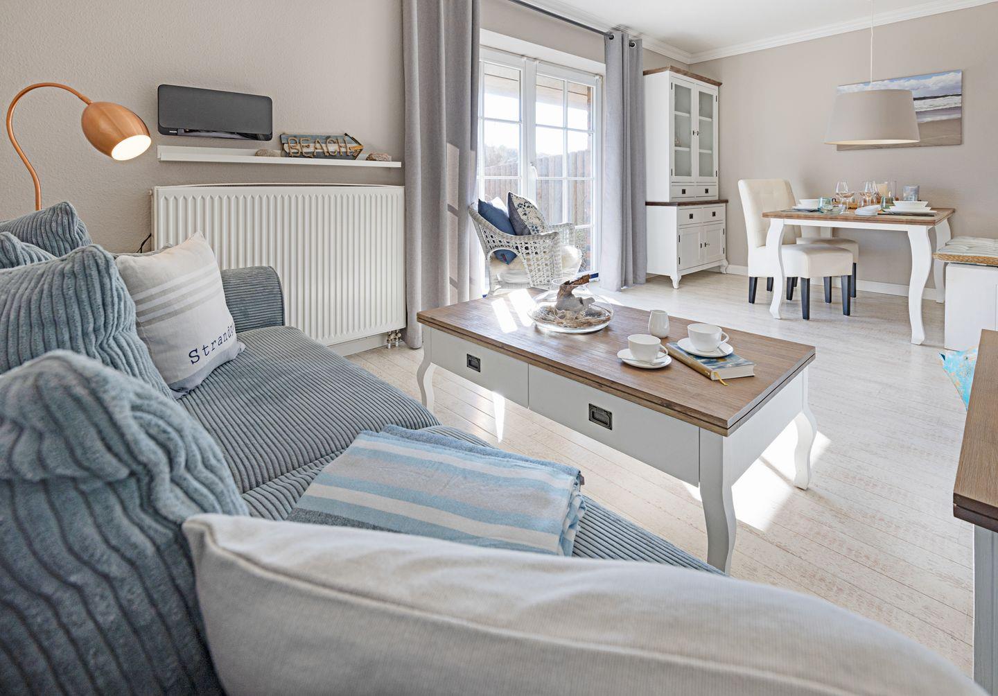Das Appartement liegt im Erdgeschoss und verfügt über eine direkt vom Wohnraum erreichbare Terrasse mit Strandkorb und Gartenmöbeln. Eine komplett ausgestattete offene Küche, ein Duschbad und Schlafzimmer mit Doppelbett vervollständigen Ihr Domizil. Die 43m² große Ferienwohnung bietet durch ein durchdachtes Raumkonzept viel Platz für Ihren Urlaub.