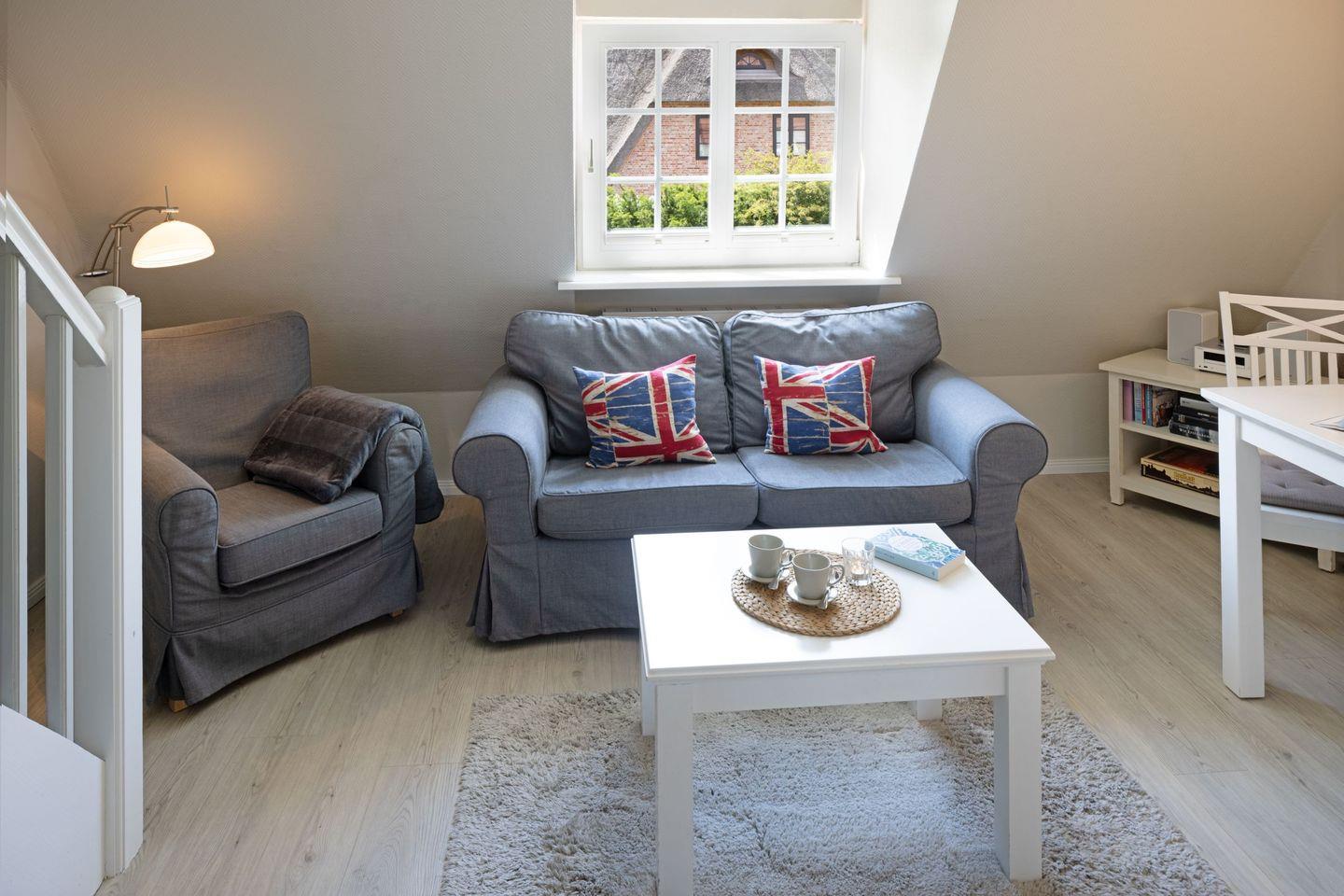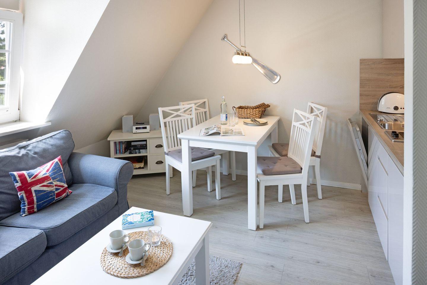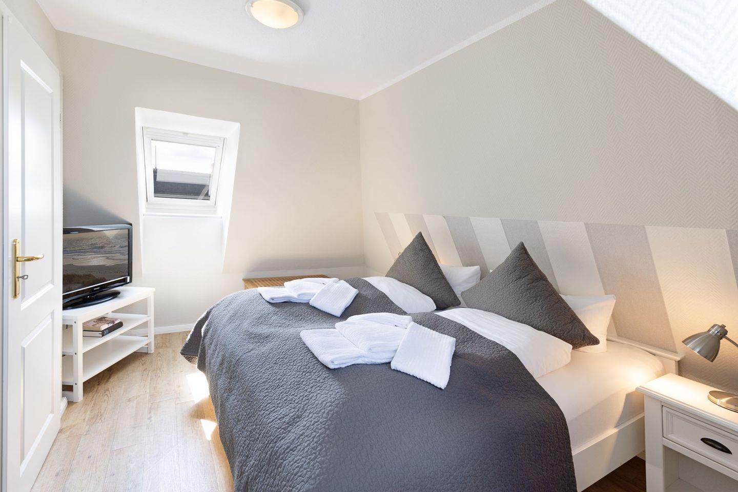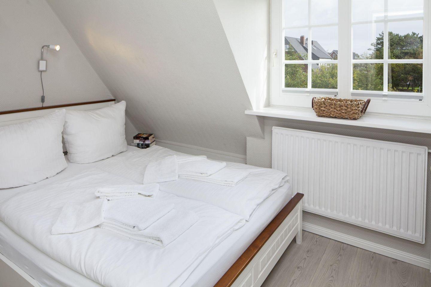 Das Appartement "Watt" (65 m²) für vier Personen liegt im Obergeschoss und bietet zwei Schlafräume im Dachgeschoss, jeweils mit Doppelbett.