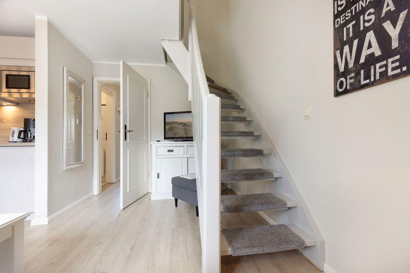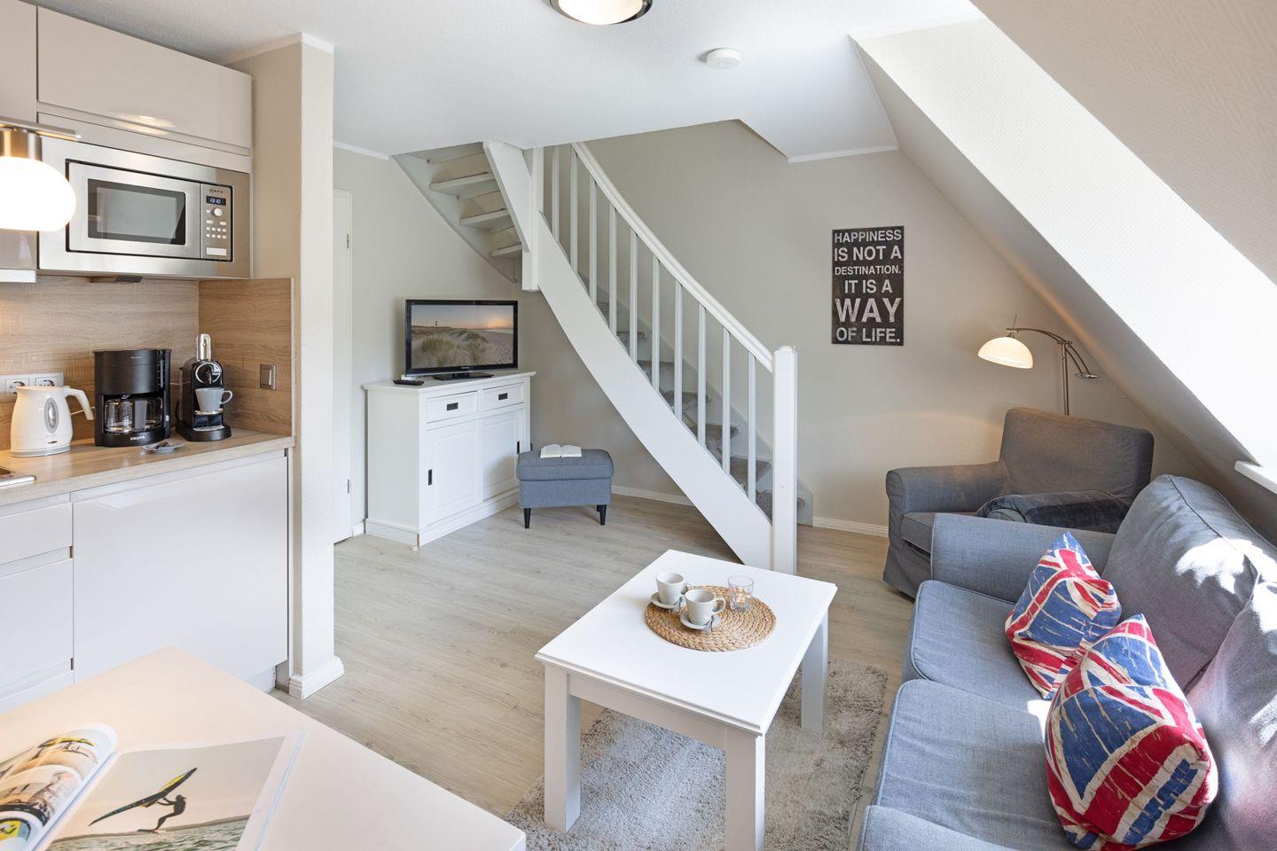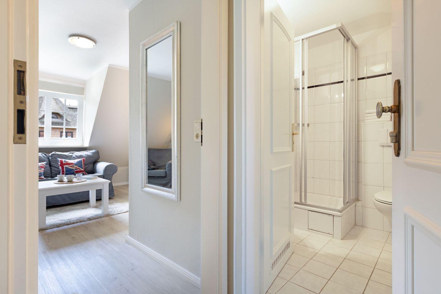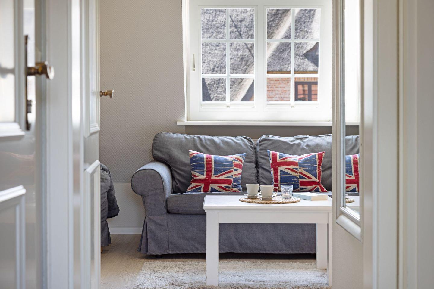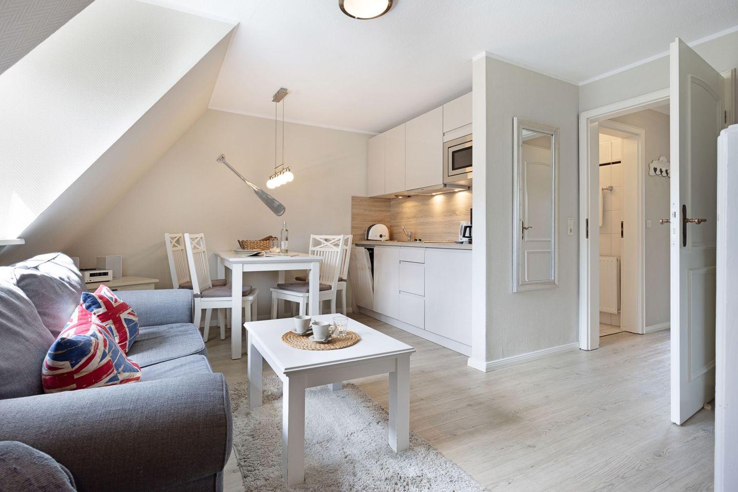 Das Appartement "Watt" (65 m²) für vier Personen liegt im Obergeschoss und bietet zwei Schlafräume im Dachgeschoss, jeweils mit Doppelbett.
