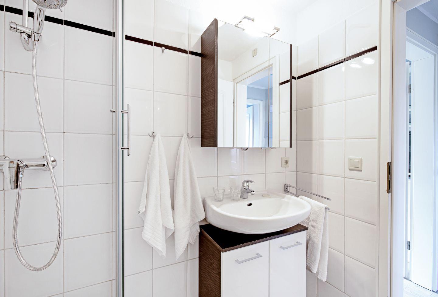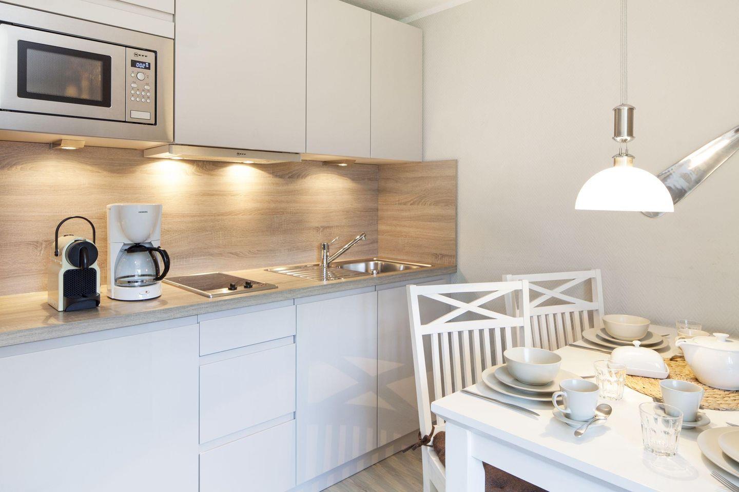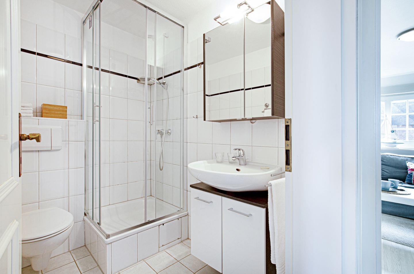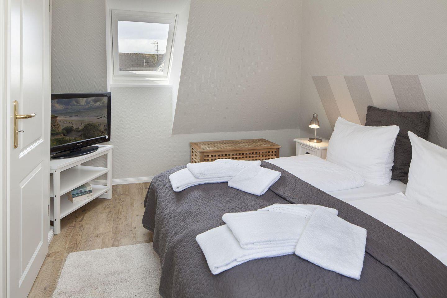 Das Appartement "Auster" (65 m²) für vier Personen liegt im Obergeschoss und bietet zwei Schlafräume im Dachgeschoss, jeweils mit Doppelbett.
