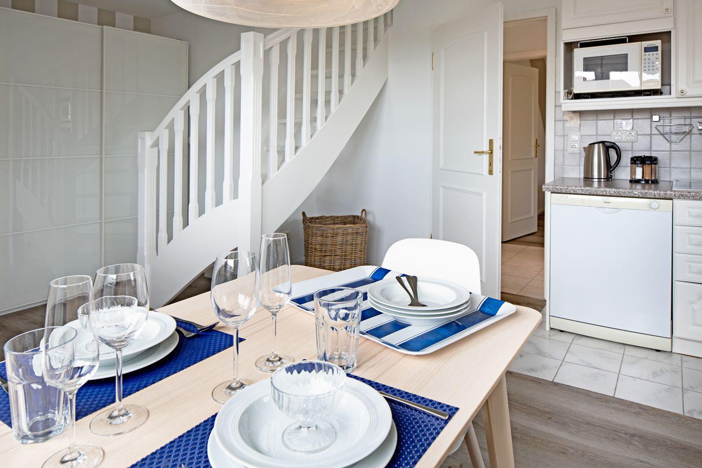 Über eine Treppe innerhalb der Wohnung kommen Sie in das Wohnzimmer mit Blick über den Königshafen und das Meer.