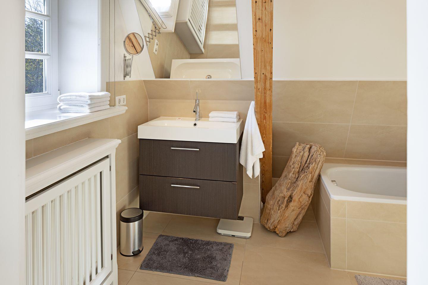 Im Obergeschoss finden Sie zwei Schlafzimmer mit Doppelbetten und ein großes Badezimmer mit Dusche und Badewanne.
