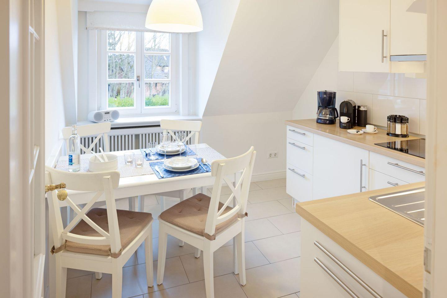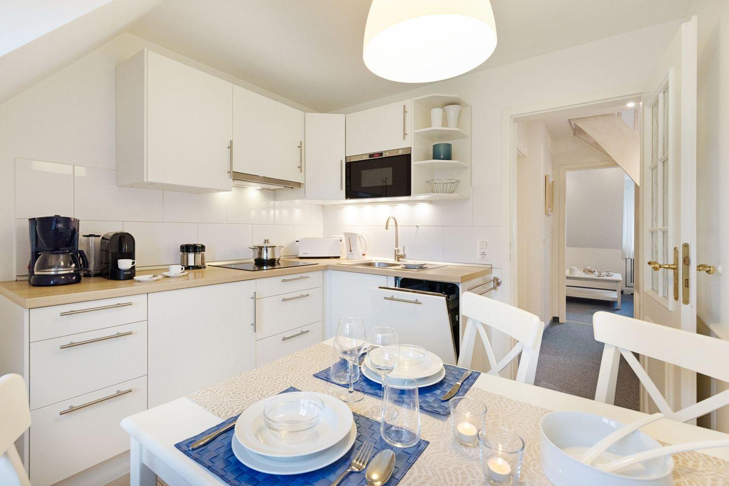 Die gut ausgestattete, geschlossene Küche ist ein weiteres Highlight der Ferienwohnung. Sie verfügt über moderne Küchengeräte, darunter einen Cerankochfeld-Herd, eine Spülmaschine, einen Kühlschrank mit Gefrierfach und sogar eine Nespresso Maschine für den perfekten Kaffeegenuss. Dank der vorausschauenden Erstausstattung und dem Einkaufsservice werden Sie sich hier sofort zu Hause fühlen.