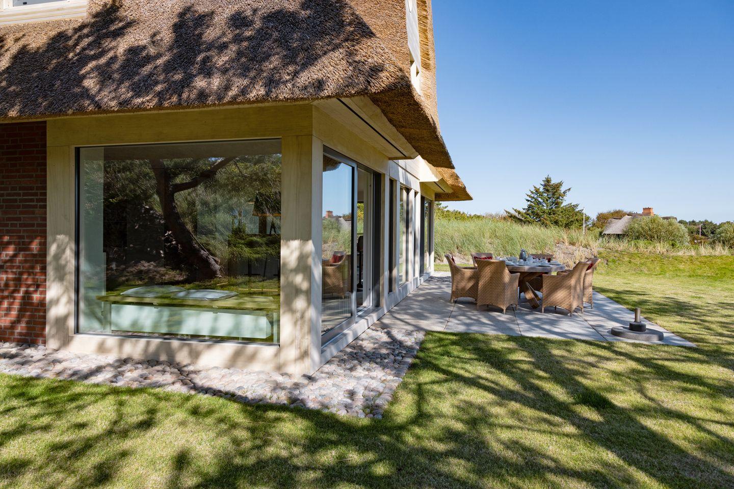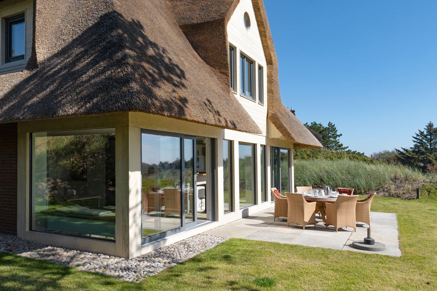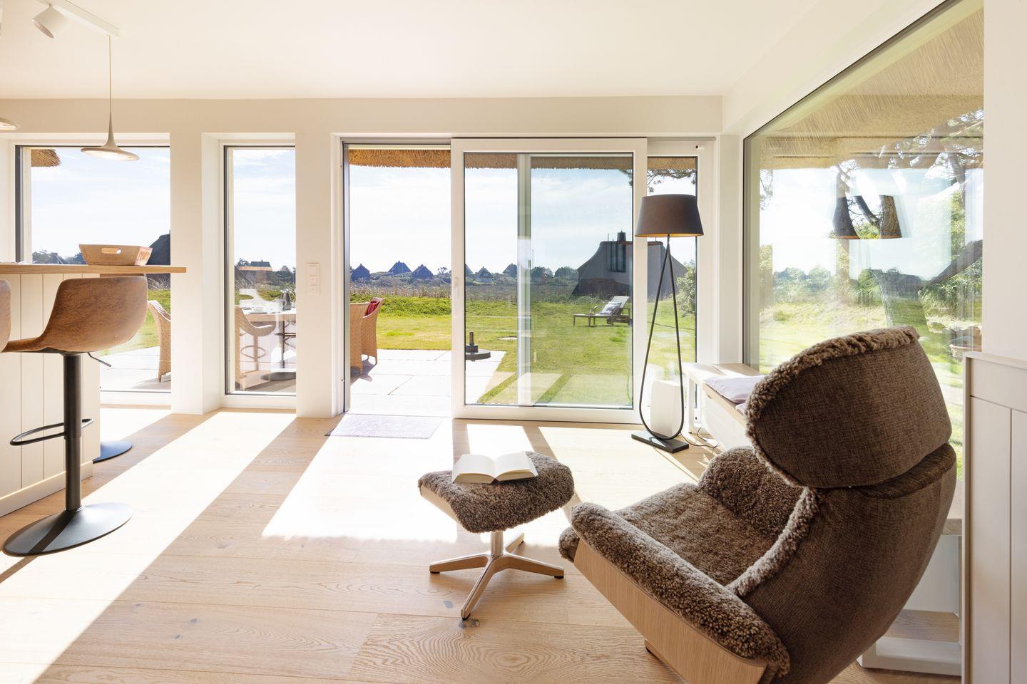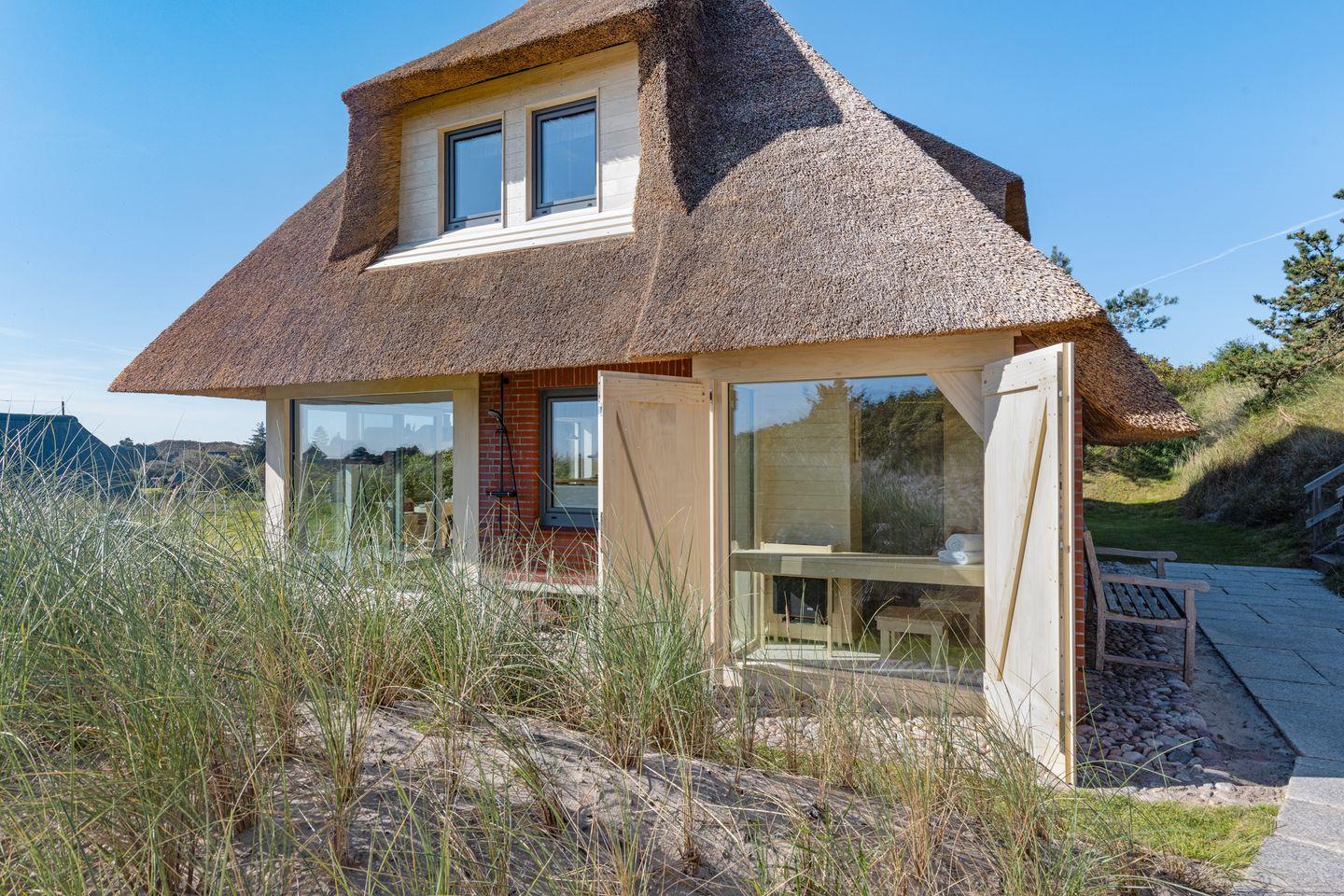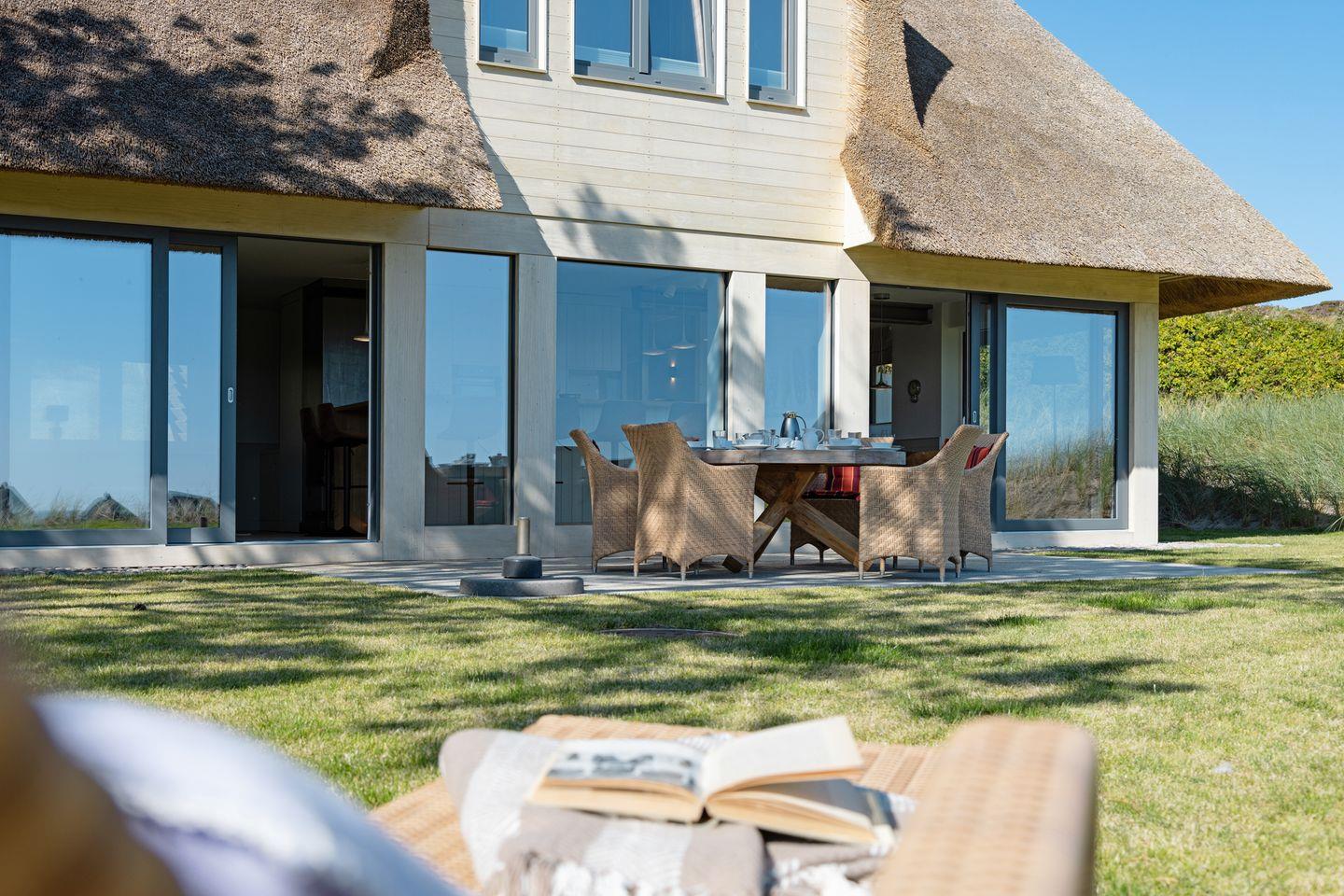 Modernes Ferienhaus unter Reet für bis zu vier Personen mit Sonnenterrasse und Weitblick über das Wattenmeer.