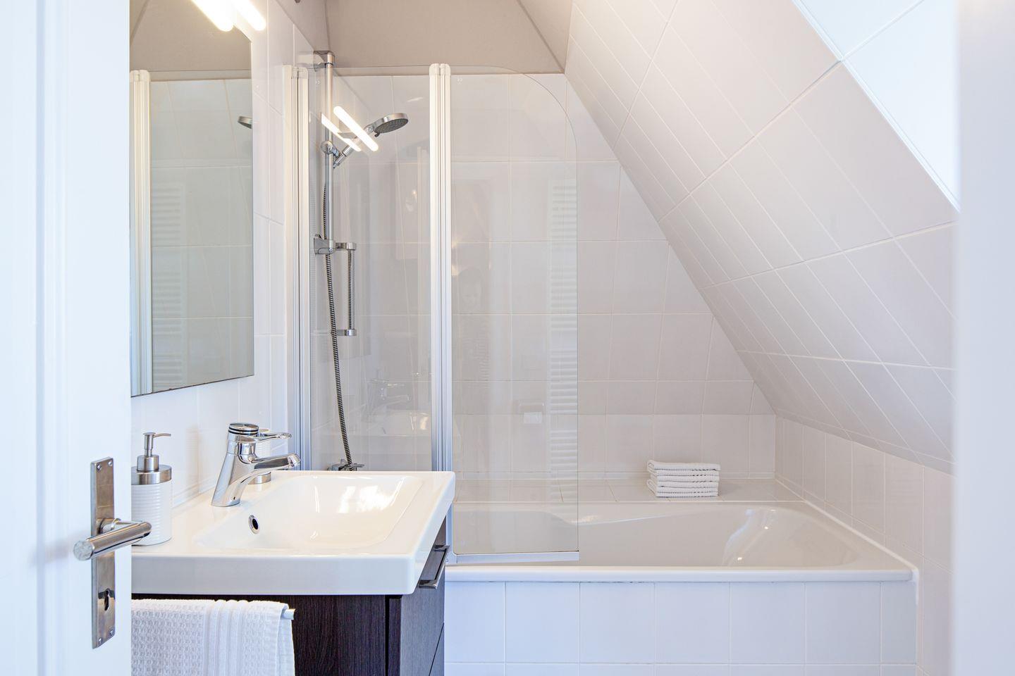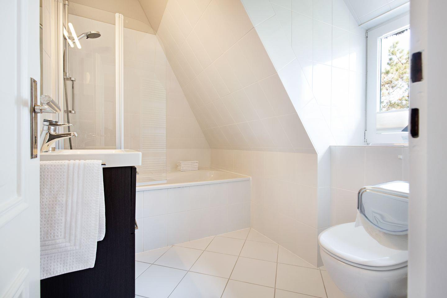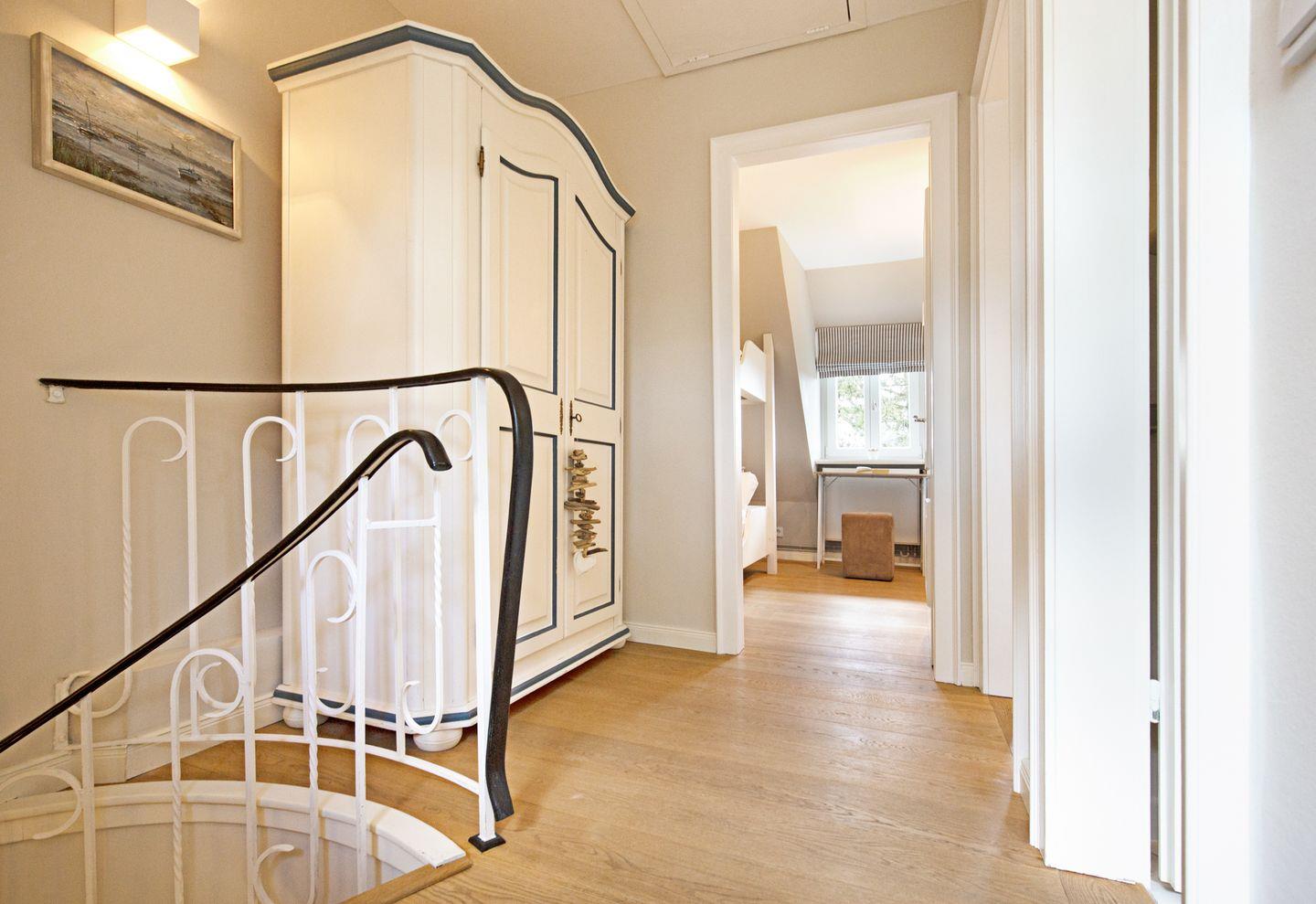 Im ersten Stock befinden sich die Schlafzimmer; eines mit Doppel- und eines mit Etagenbett und Ihr Badezimmer mit Badewanne.
