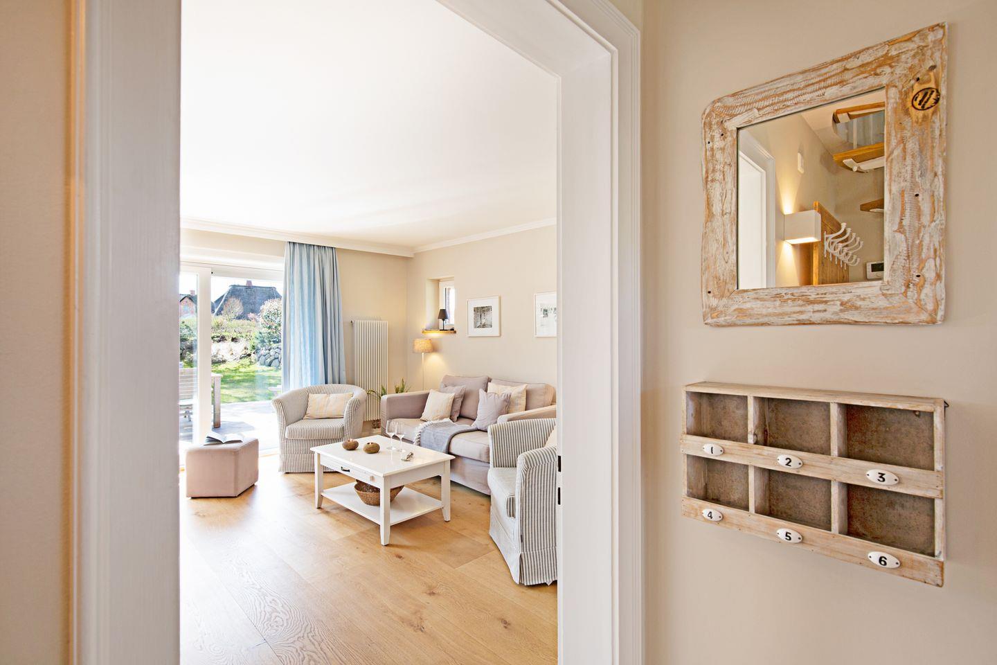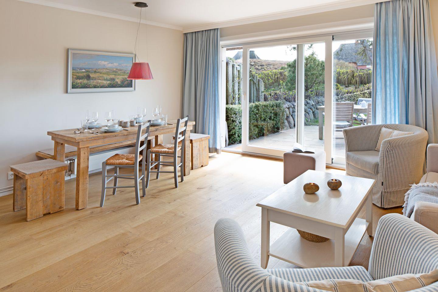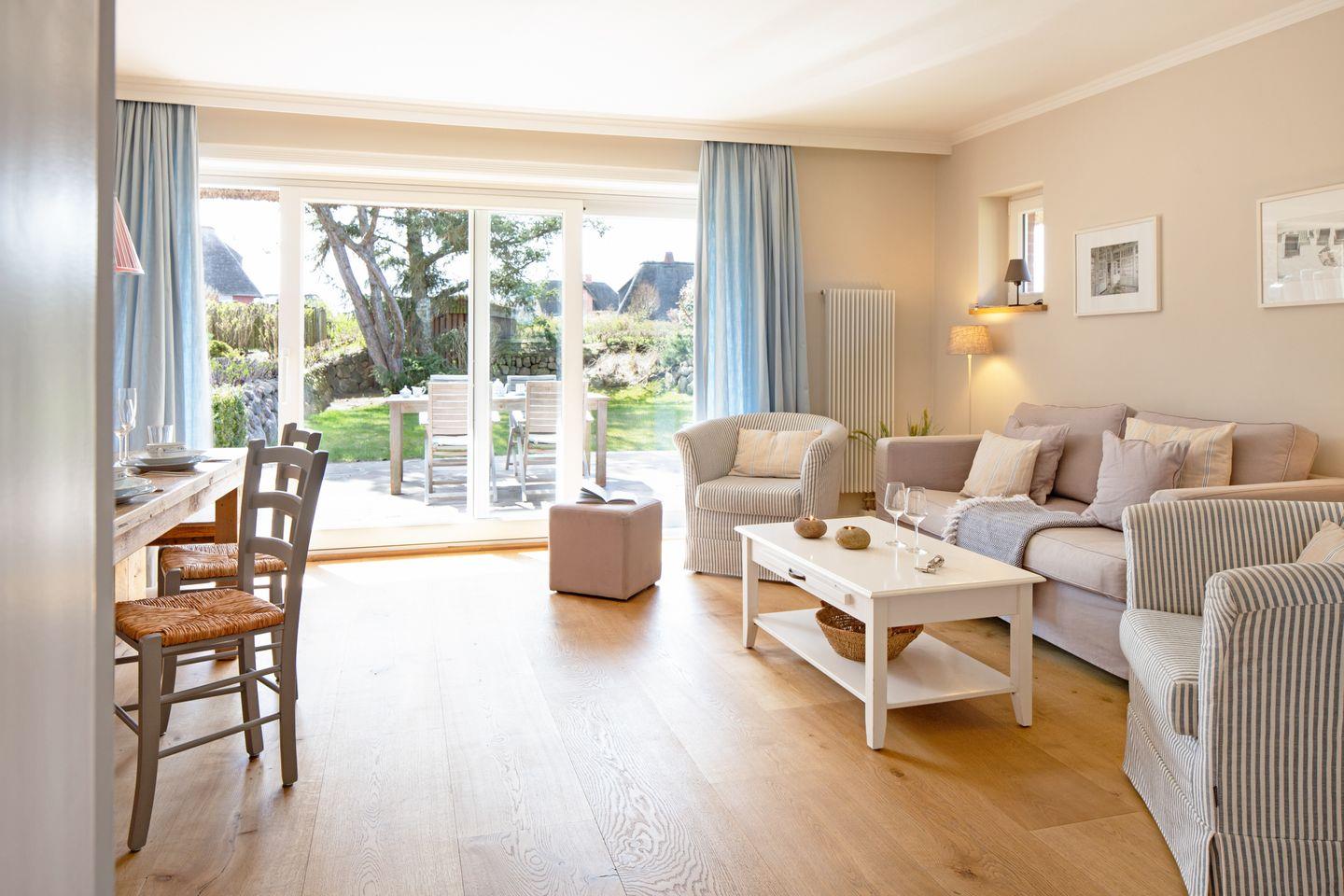 Vom Wohnzimmer aus können Sie über die große Terrassentür Ihren sonnendurchfluteten Garten zum Erholen betreten.