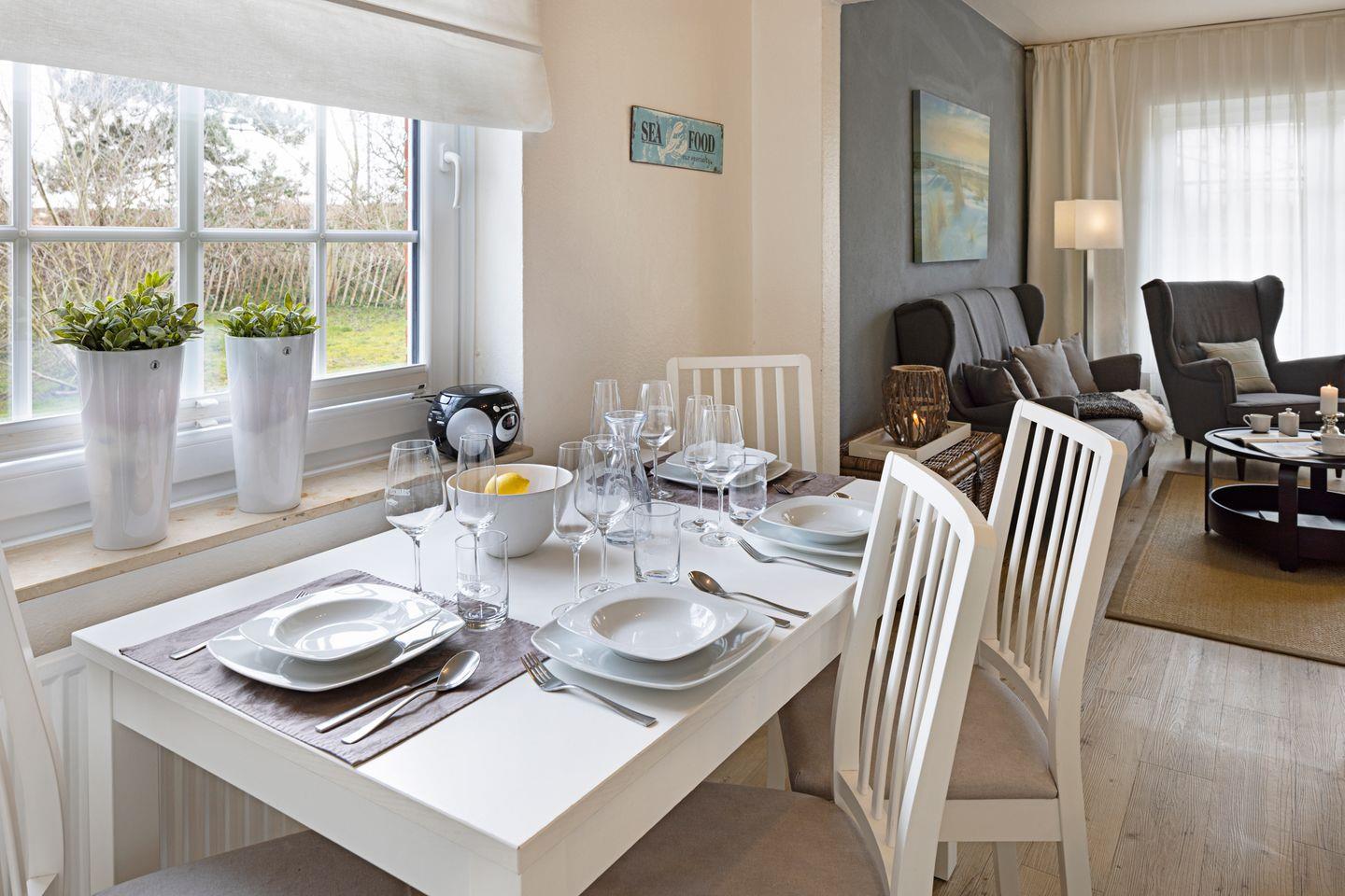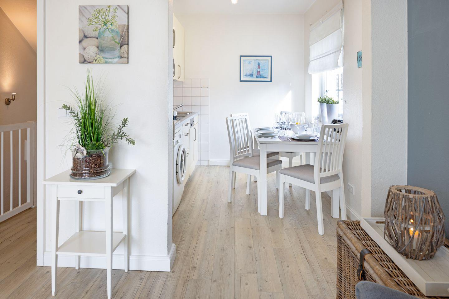 Das liebevoll ausgestattete Appartement "Friesenkoje" erwartet Sie. Das Feriendomizil liegt auf zwei Ebenen. Im Erdgeschoss finden Sie ein Zimmer mit Etagenbett, das auch für Erwachsene geeignet ist. Das wunderschöne Wohnzimmer mit angrenzender Küche und Essbereich, von dem aus sie einen Blick ins Grüne haben.