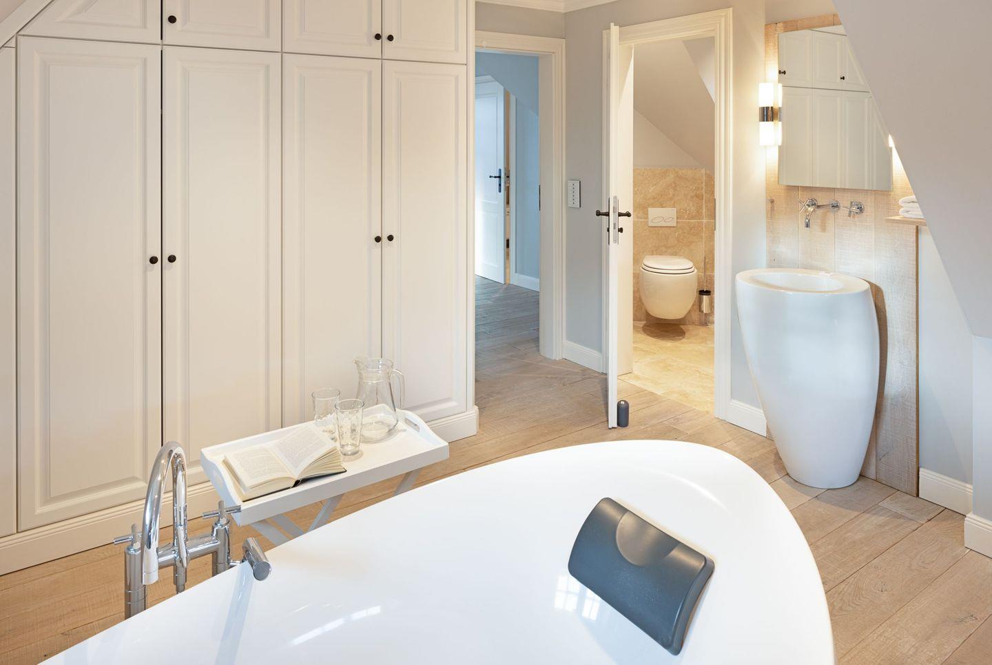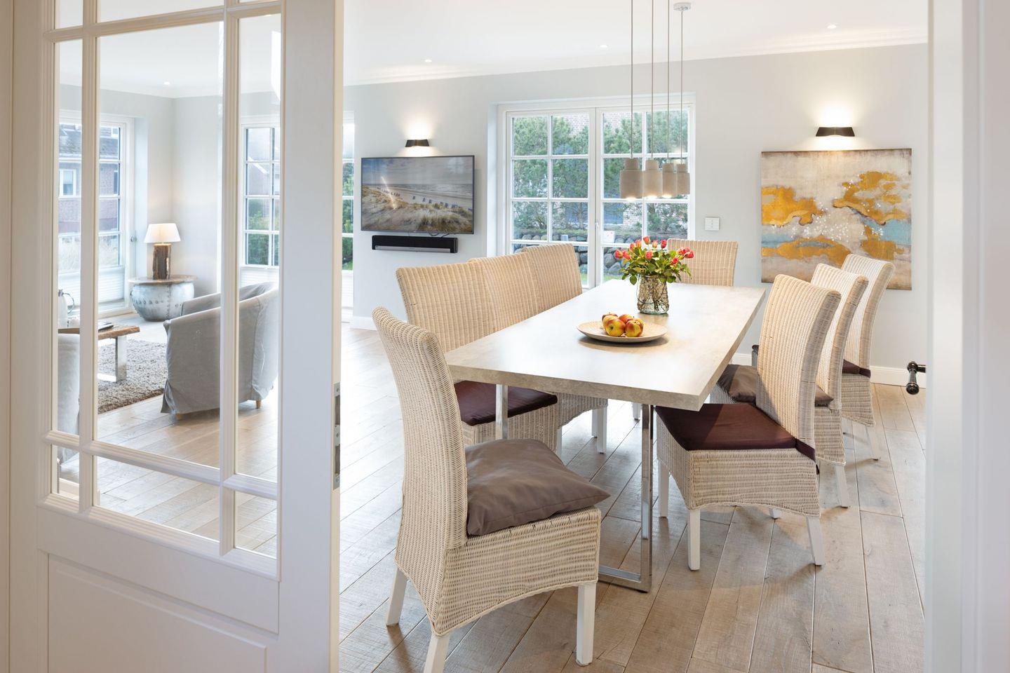 Hochwertig ausgestattete Neubau-Friesendoppelhaushälfte unter Reet mit Sauna, Terrasse und Strandkorb für bis zu acht Personen.