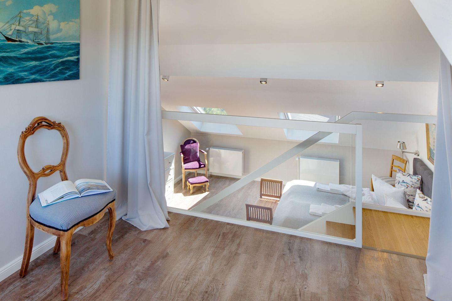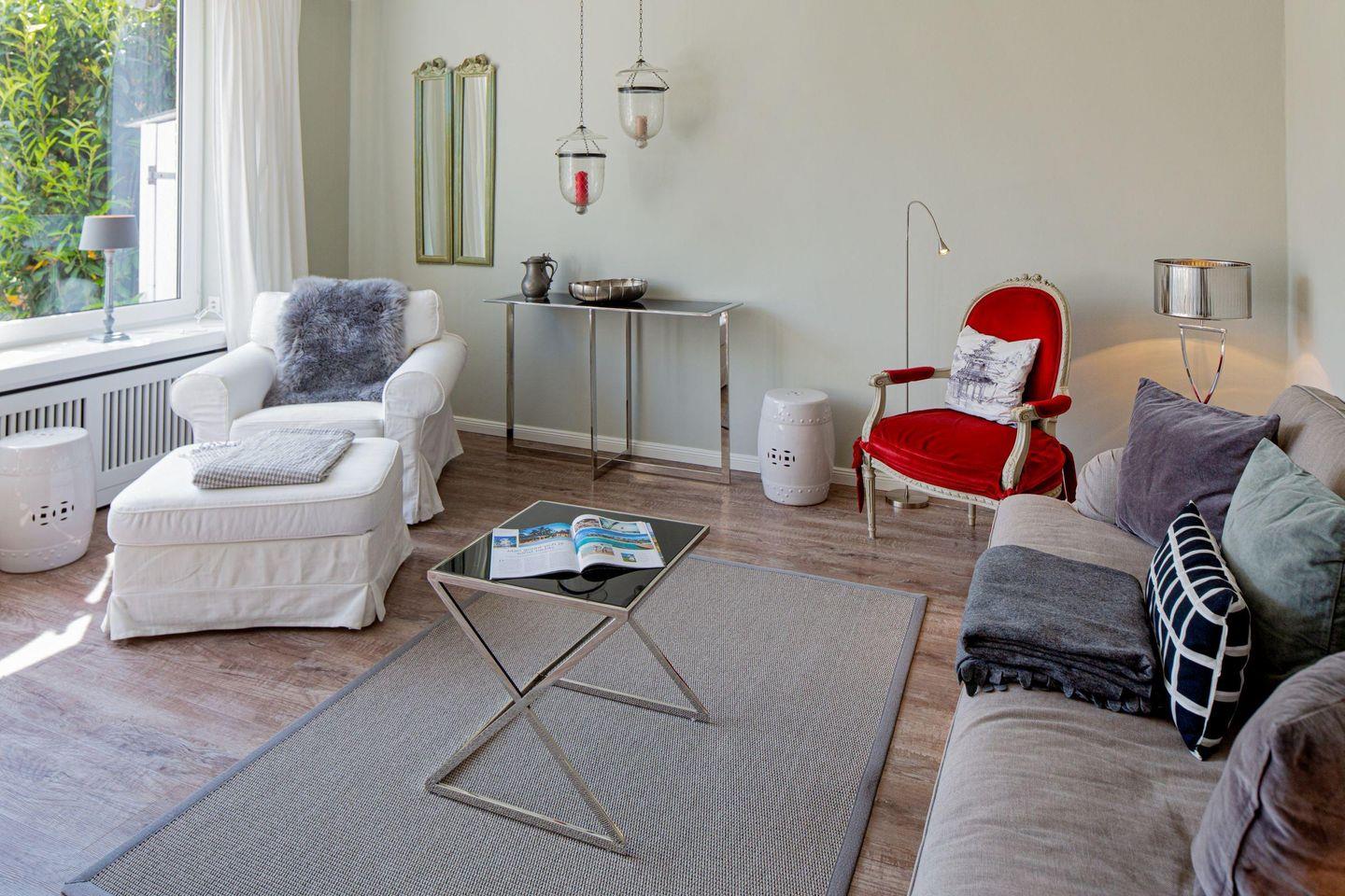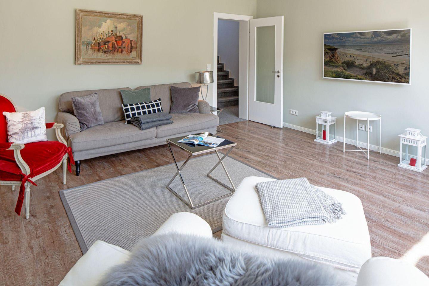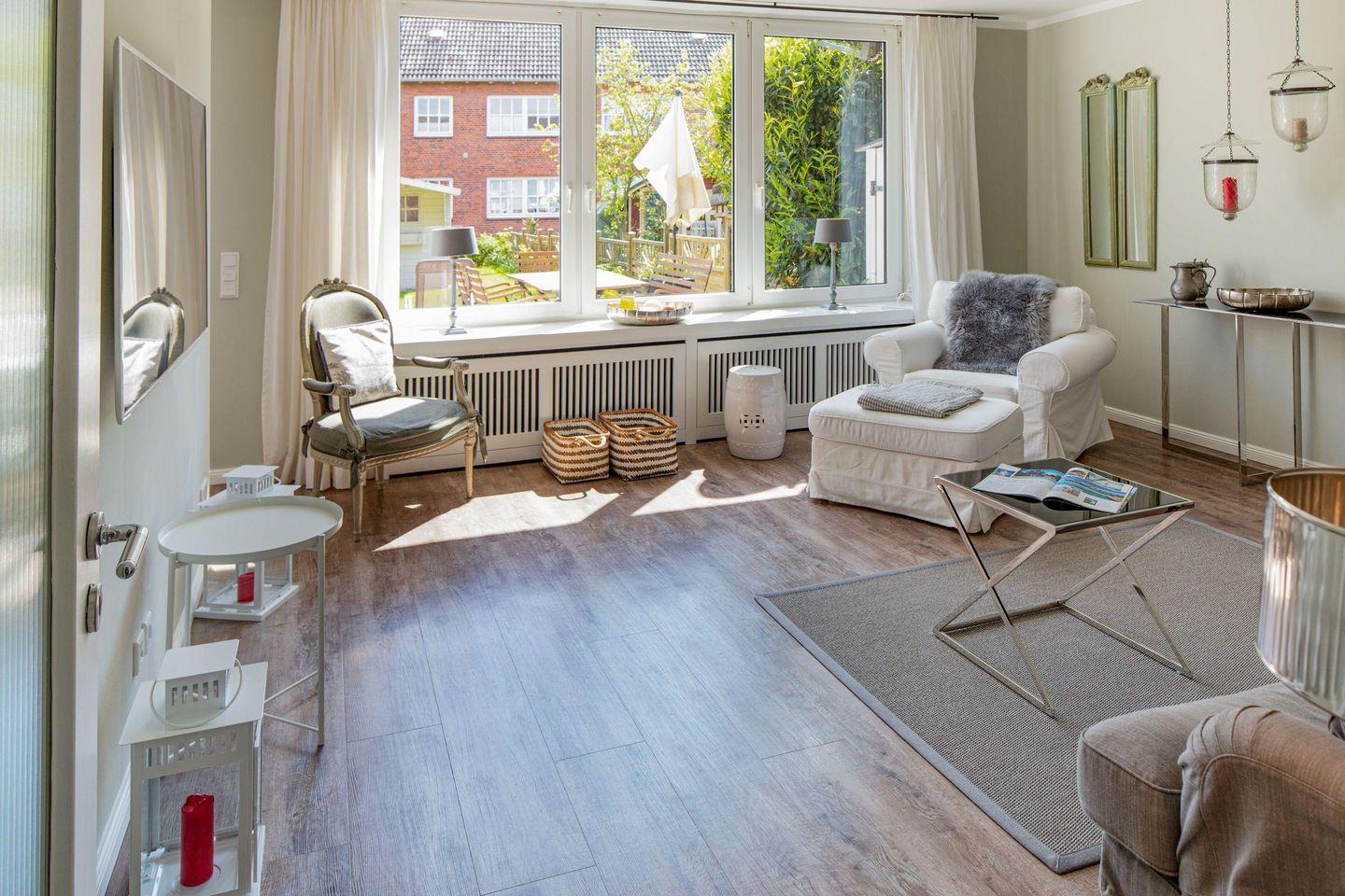 Vom Essbereich im Wohnraum erreichen Sie den Garten mit Terrasse und Gartenmöbeln. Die offene Küche bietet alles was man zum Kochen braucht. Im Hochparterre befindet sich ein Schlafzimmer mit Doppelbett und ein Bad mit Wanne. Im Dachgeschoss befindet sich ein Schlafzimmer mit Doppelbett und ein Schlafzimmer mit Einzelbetten und ein Duschbad. Im Erdgeschoss befindet sich ein kleiner Wellnessbereich mit gläserner Sauna, Duschbad und Relax-Liegen.
