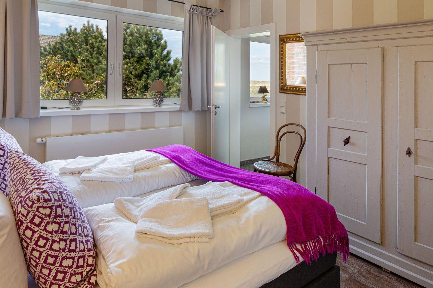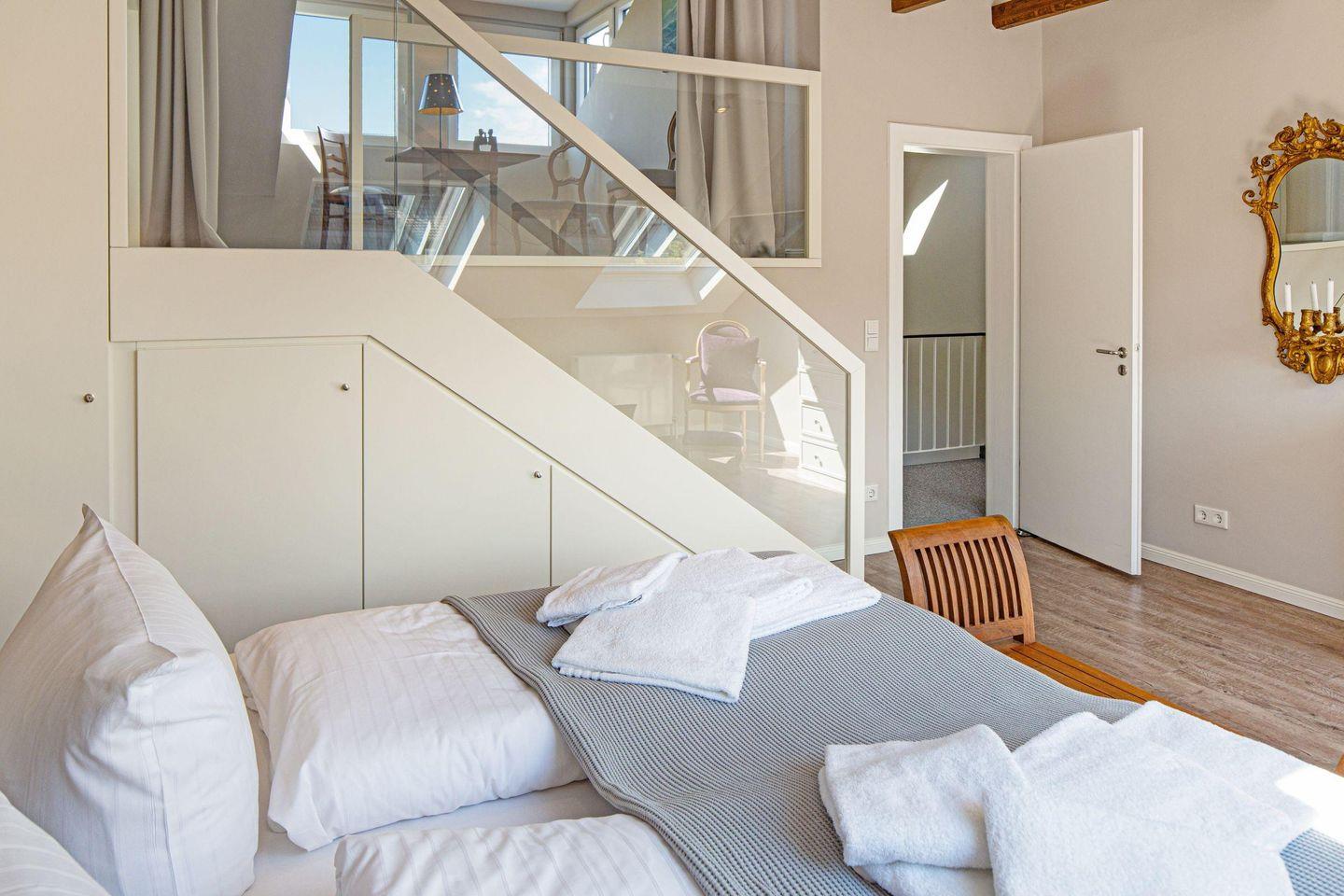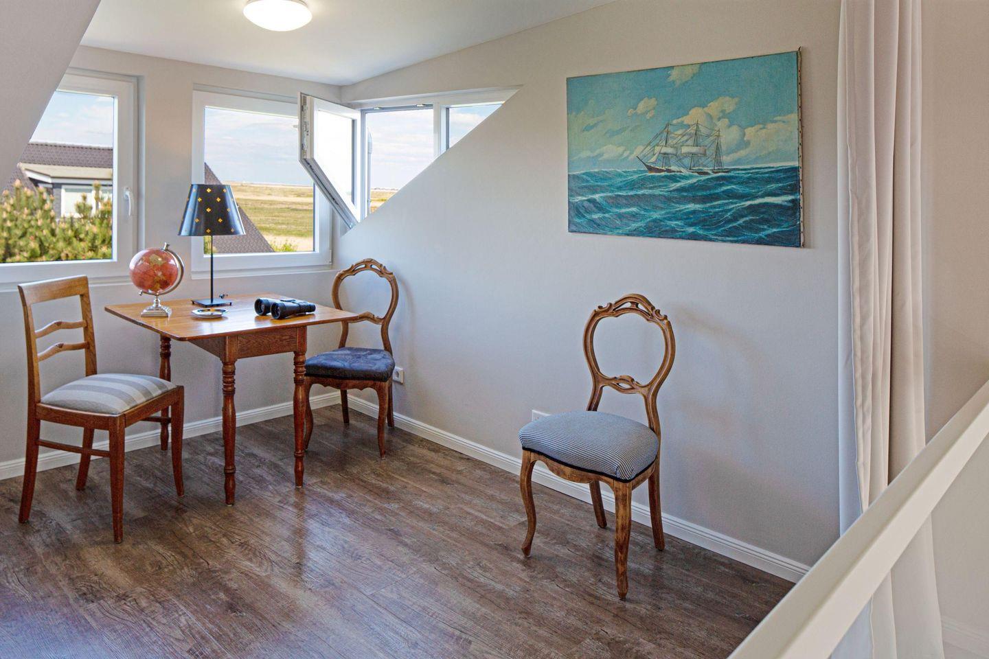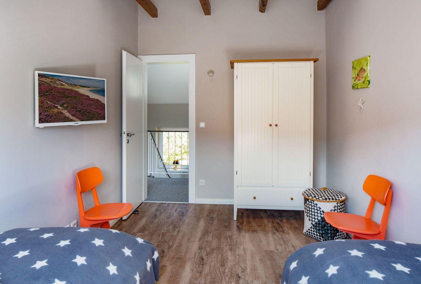 Vom Essbereich im Wohnraum erreichen Sie den Garten mit Terrasse und Gartenmöbeln. Die offene Küche bietet alles was man zum Kochen braucht. Im Hochparterre befindet sich ein Schlafzimmer mit Doppelbett und ein Bad mit Wanne. Im Dachgeschoss befindet sich ein Schlafzimmer mit Doppelbett und ein Schlafzimmer mit Einzelbetten und ein Duschbad. Im Erdgeschoss befindet sich ein kleiner Wellnessbereich mit gläserner Sauna, Duschbad und Relax-Liegen.