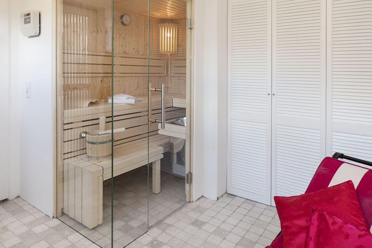 Luxuriöses Ferienreihenhaus für bis zu sechs Personen mit gläserner Sauna, Garten und Terrasse sowie Meerblick.