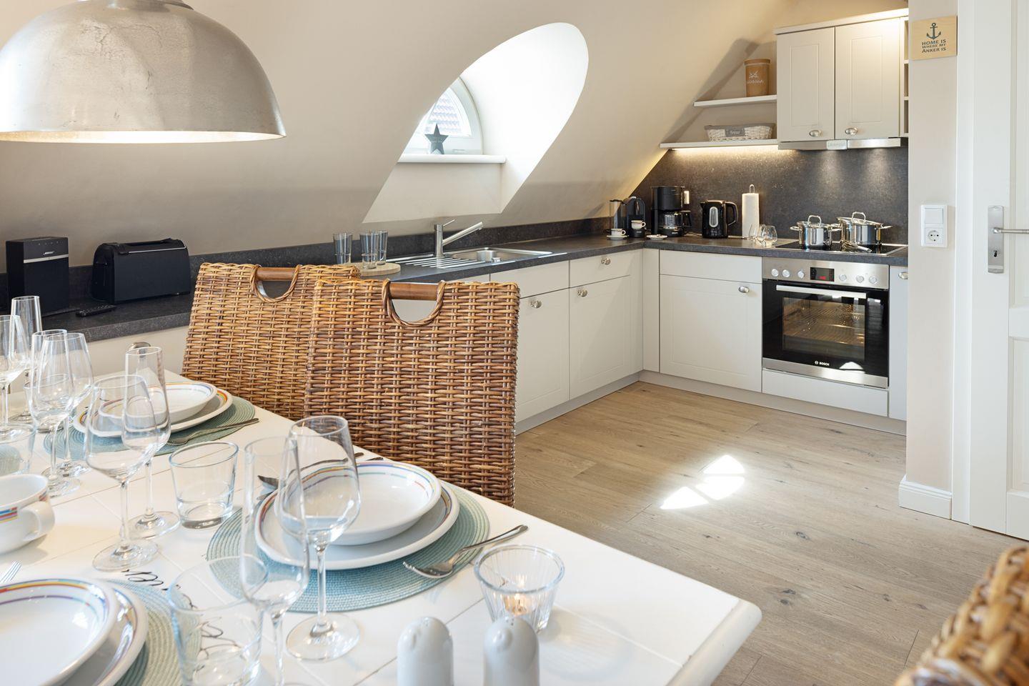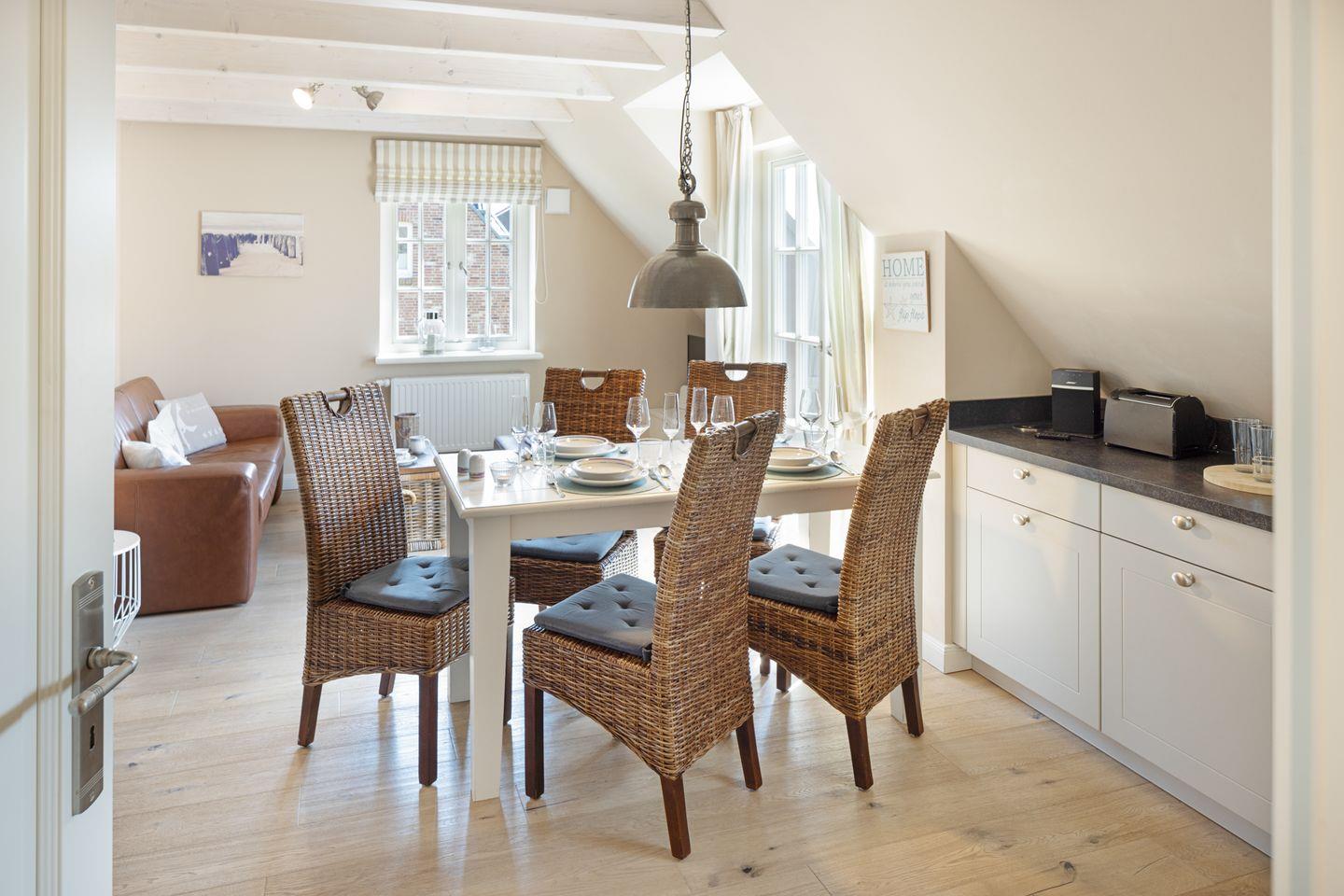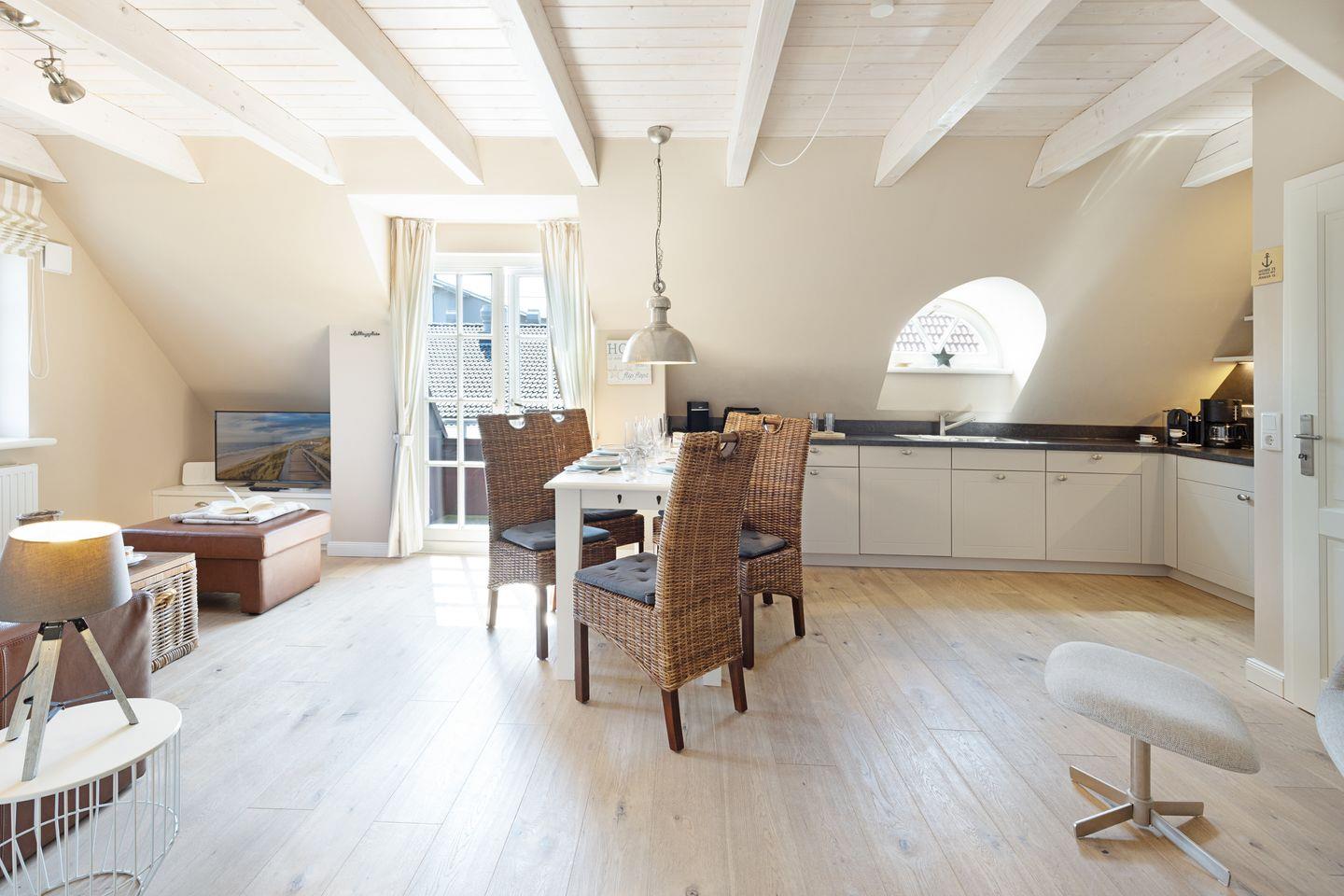 Willkommen an Ihrem "Ankerplatz". Das über einen separaten Eingang im Obergeschoss gelegene Appartement hat ein Schlafzimmer mit Doppelbett und ein großes Schlafsofa im Wohnzimmer. Das Wohn- und Esszimmer mit offener Küche und seiner stilvollen und behaglichen Ausstattung bietet viel Raum für bis zu 4 Personen. Weiterhin steht Ihnen eine Loggia zur Verfügung.