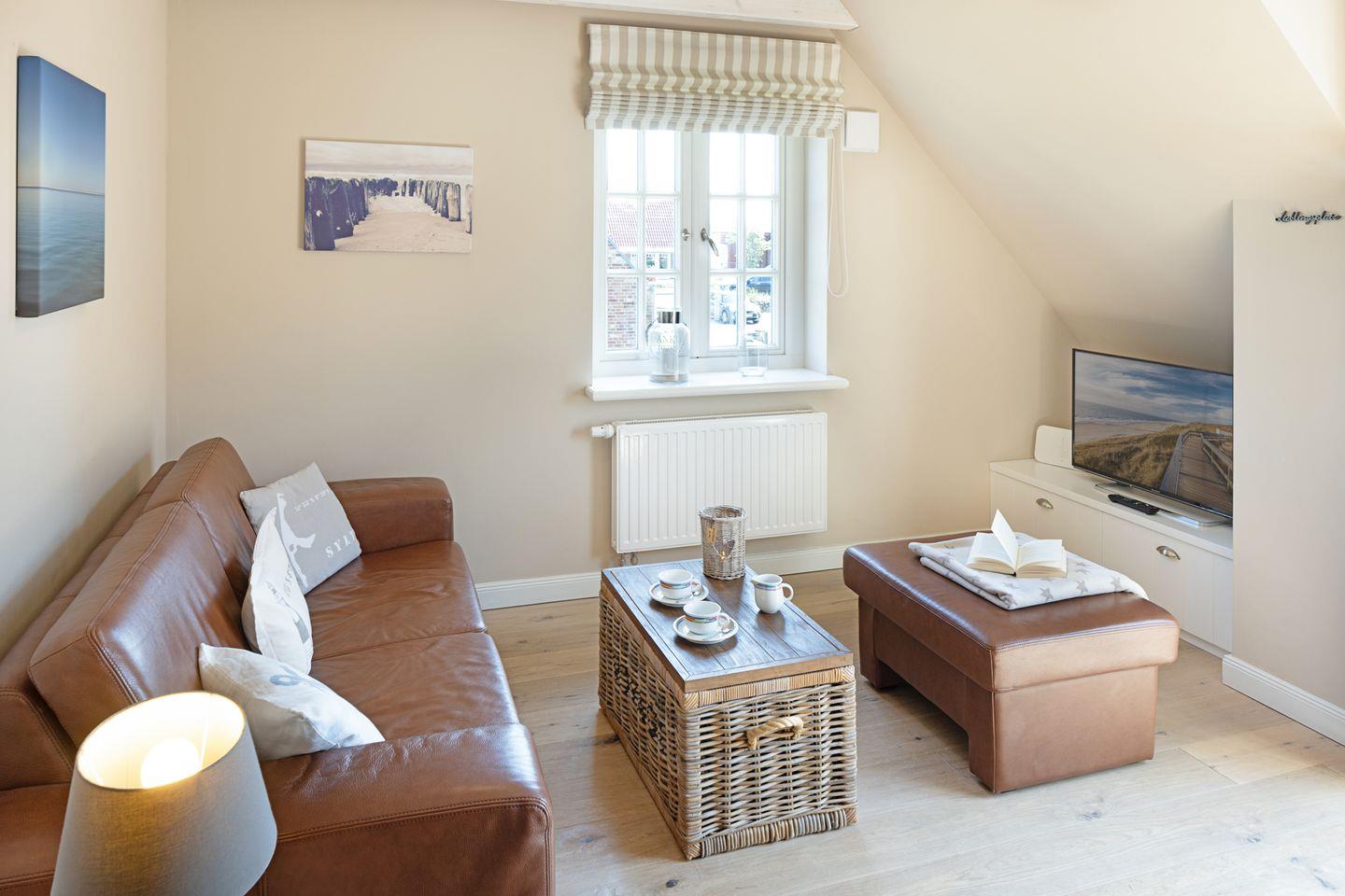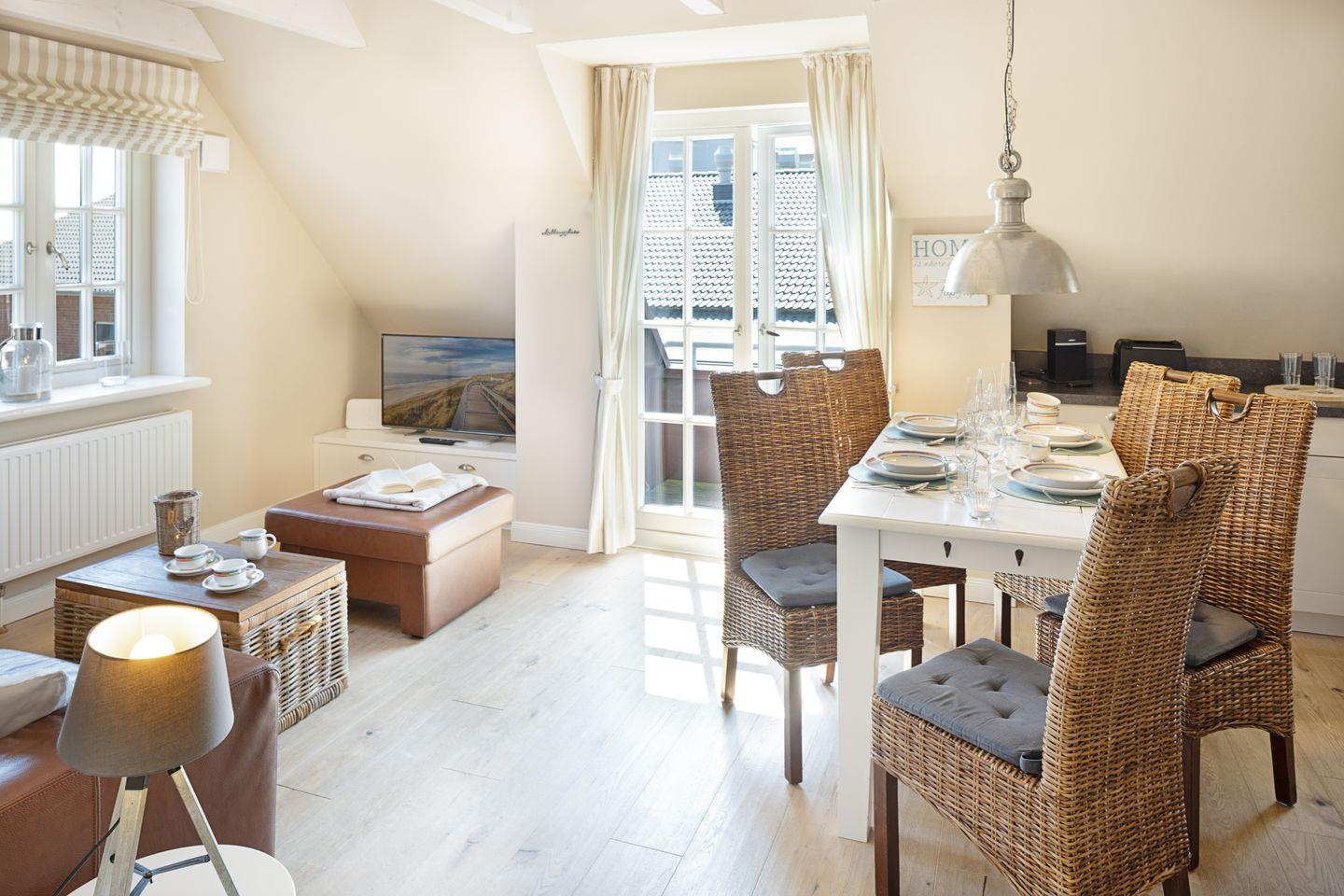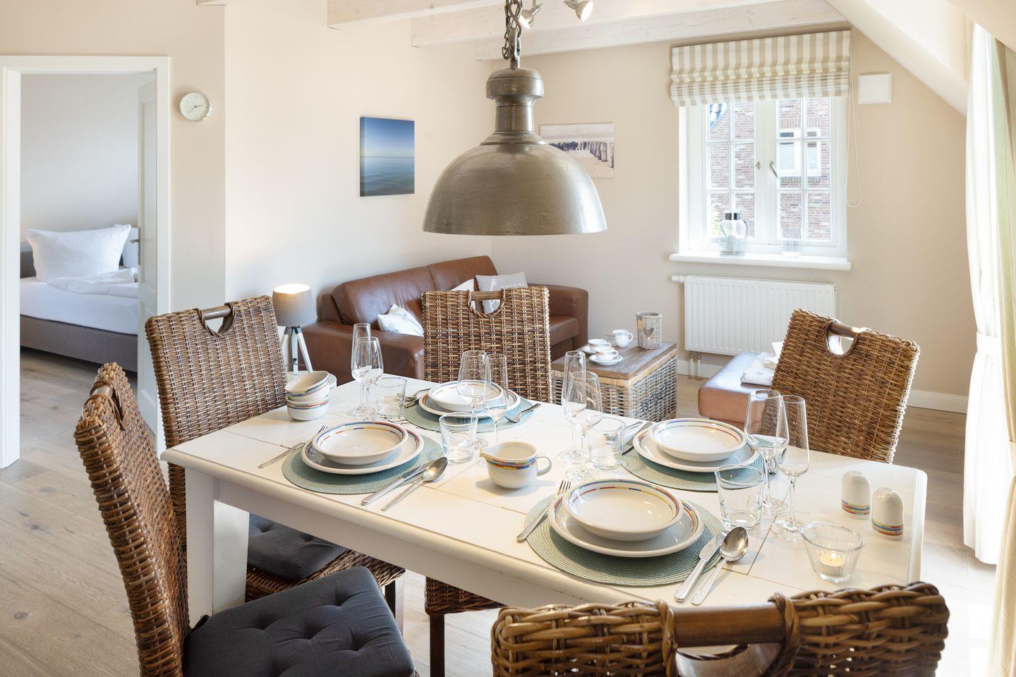 Willkommen an Ihrem "Ankerplatz". Das über einen separaten Eingang im Obergeschoss gelegene Appartement hat ein Schlafzimmer mit Doppelbett und ein großes Schlafsofa im Wohnzimmer. Das Wohn- und Esszimmer mit offener Küche und seiner stilvollen und behaglichen Ausstattung bietet viel Raum für bis zu 4 Personen. Weiterhin steht Ihnen eine Loggia zur Verfügung.