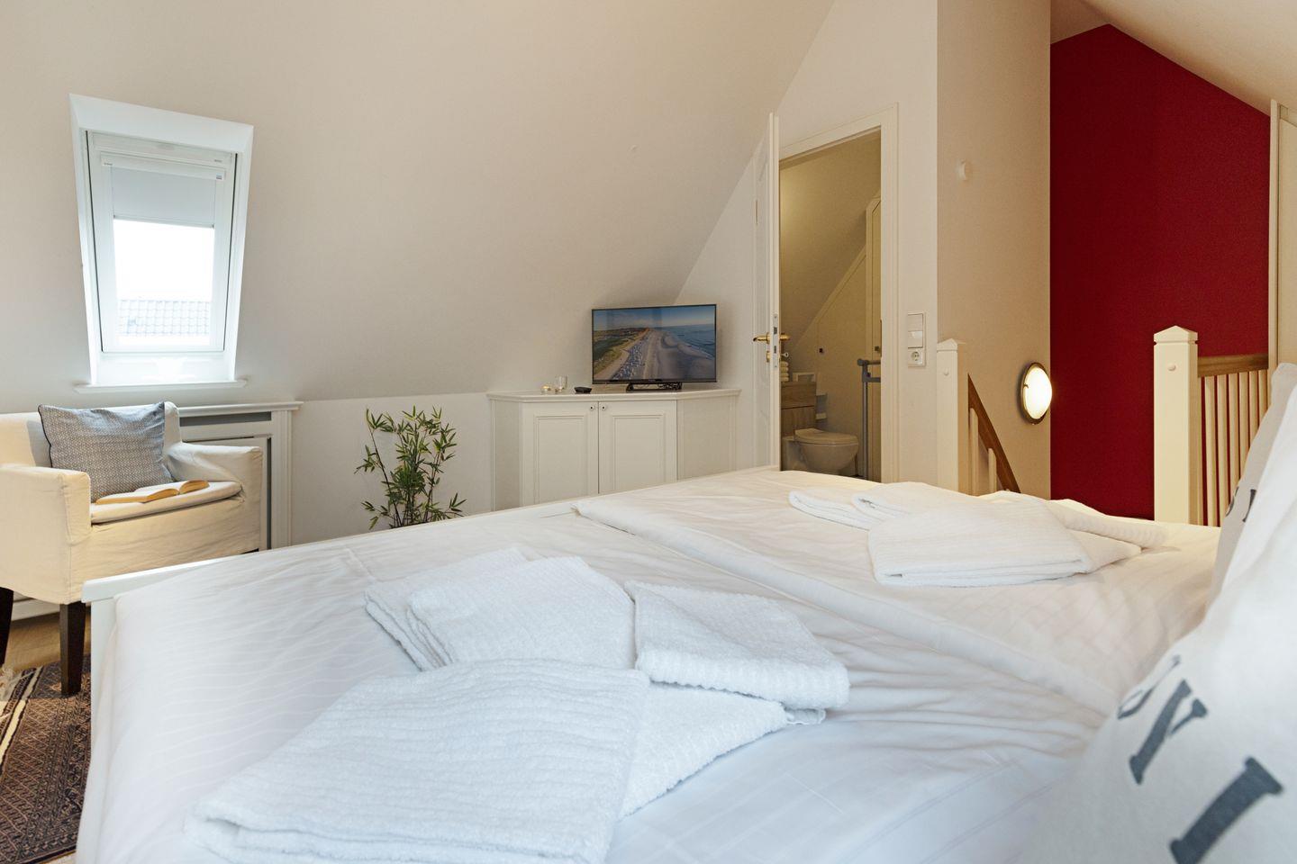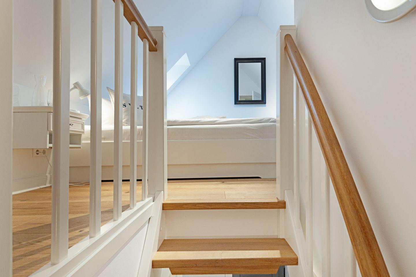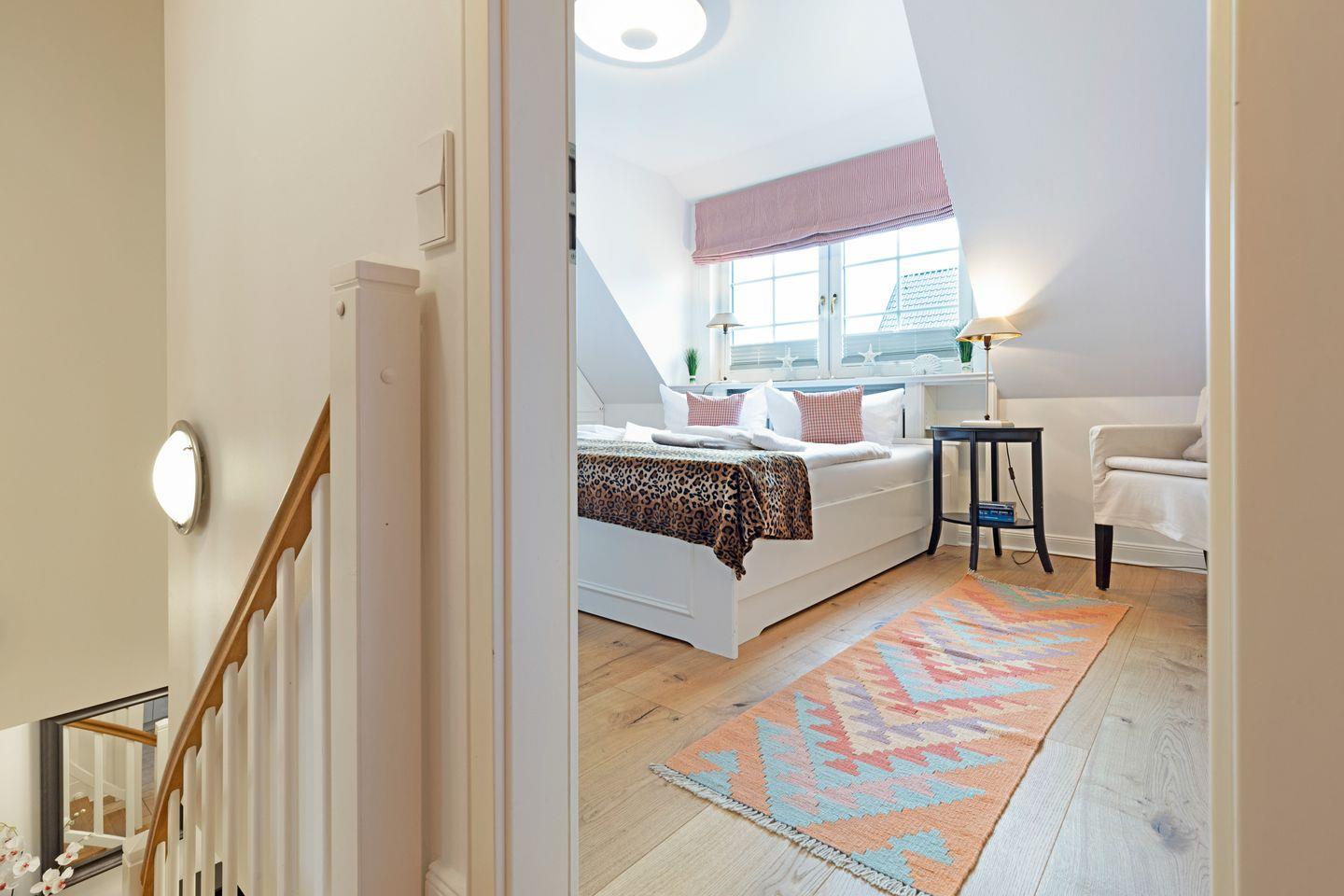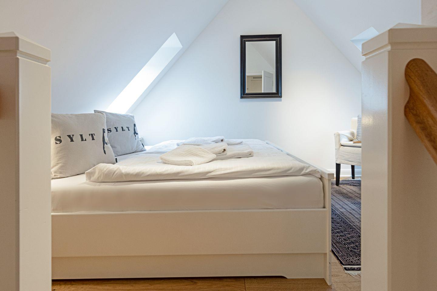 Im Dachgeschoss (stark ansteigende Treppe) befindet sich ein Schlafzimmer mit Doppelbett und ein Gäste-WC. Ein zusätzliches Bad gibt es im EG.
