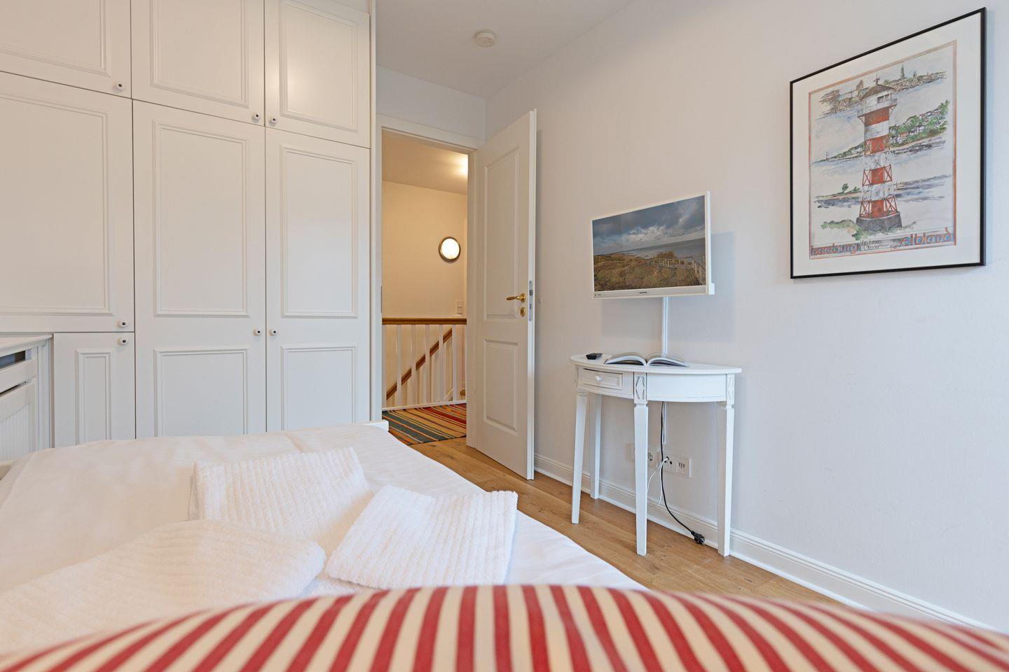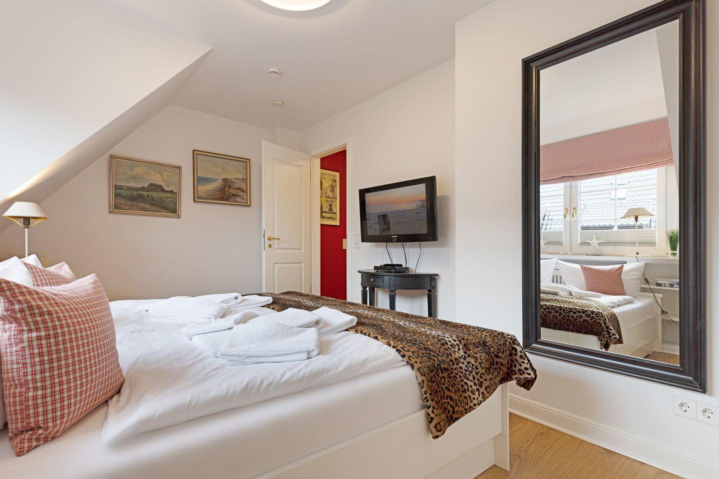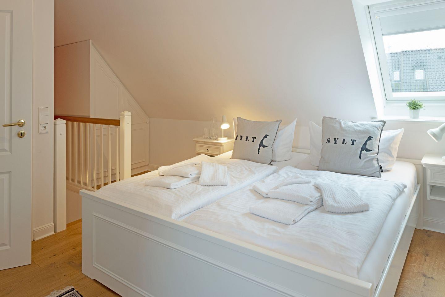 Im Dachgeschoss (stark ansteigende Treppe) befindet sich ein Schlafzimmer mit Doppelbett und ein Gäste-WC. Ein zusätzliches Bad gibt es im EG.