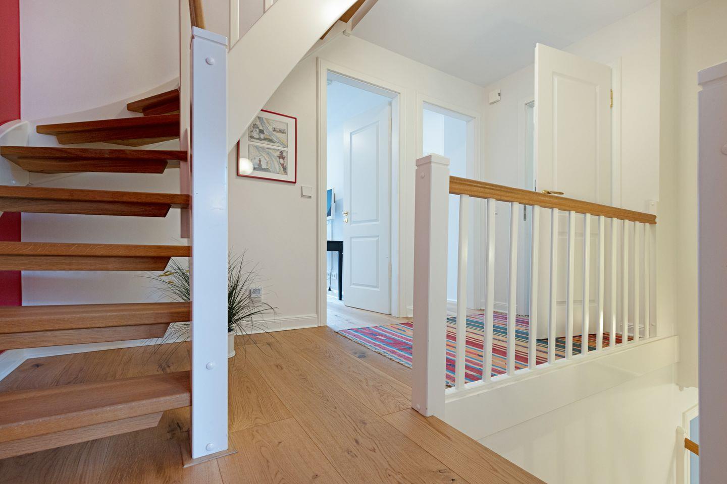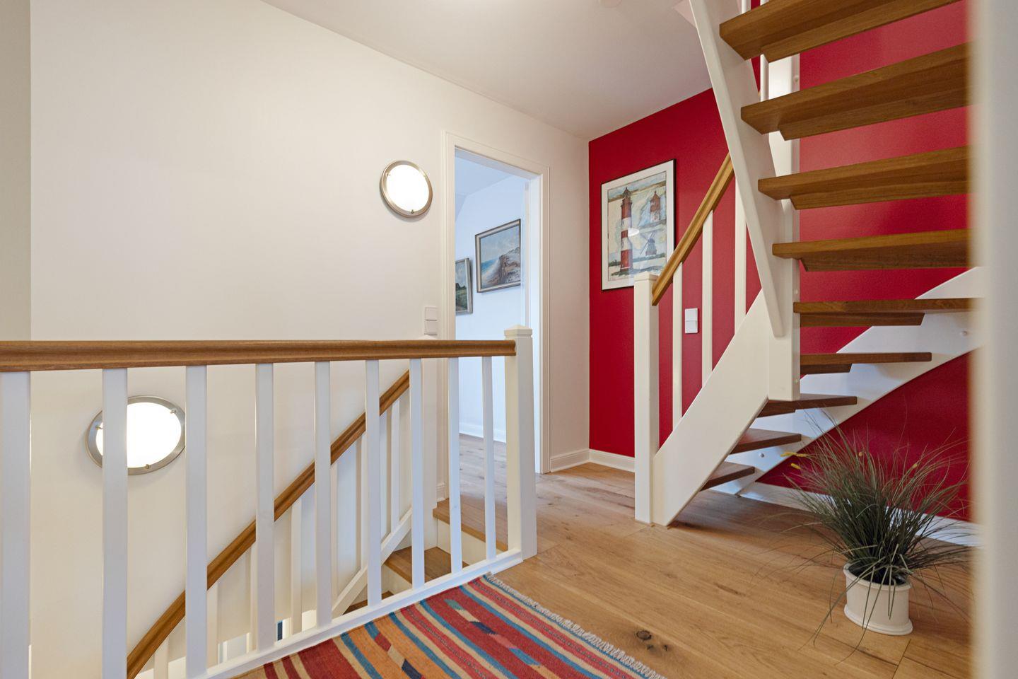 In der ersten Etage befindet sich ein Schlafzimmer mit Doppelbett, zwei Zimmer mit jeweils einem Einzelbett und ein Bad.