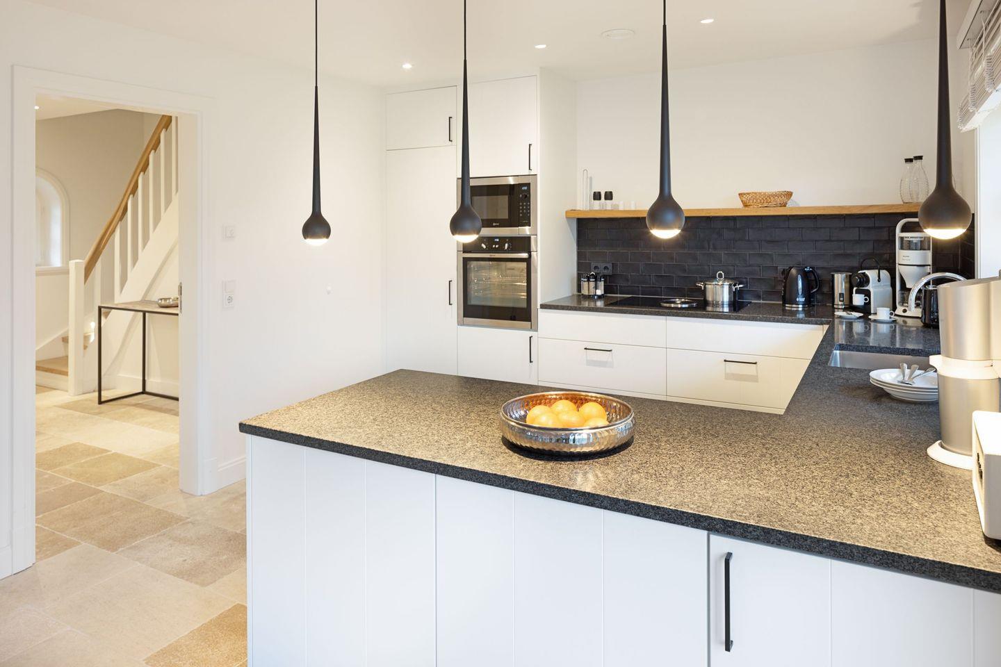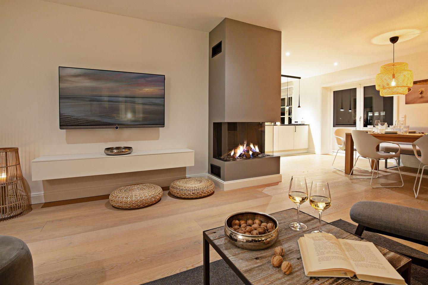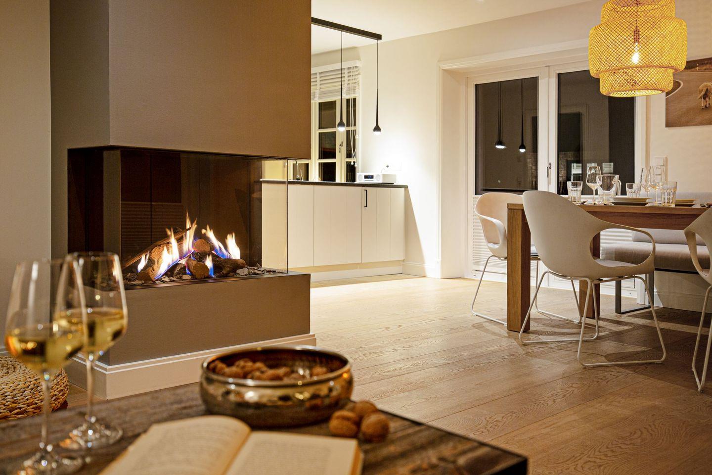 Das Haus überzeugt durch ein durchdachtes Raumkonzept und eine stilvolle Ausstattung. Im Erdgeschoss bildet der großzügige Wohnbereich das Herzstück des Hauses. Die offene Küche, der Essbereich und das Wohnzimmer fügen sich harmonisch zusammen und schaffen eine einladende Atmosphäre. Ein besonderes Highlight ist der verglaste Gas-Kamin, der von drei Seiten einsehbar ist und dem Raum eine warme, gemütliche Stimmung verleiht. Große Fensterfronten und drei Terrassentüren sorgen für viel Tageslicht und ermöglichen einen direkten Zugang in den Garten mit Terrasse.