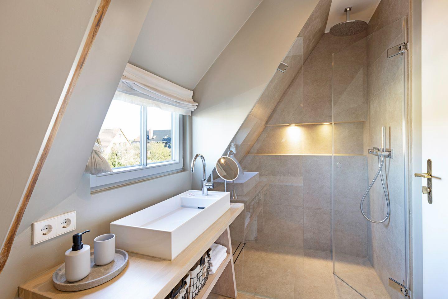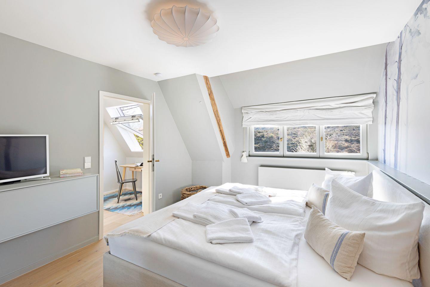 Das Haus verfügt über zwei Schlafräume mit jeweils Doppelbett (-eines im 1. Stock, eines im DG) und einem Schlafraum mit einem Einzelbett im 1. Stock. Ein edles Duschbad, sowie ein Wannenbad (1. Stock) vervollständigen Ihr Urlaubsdomizil.