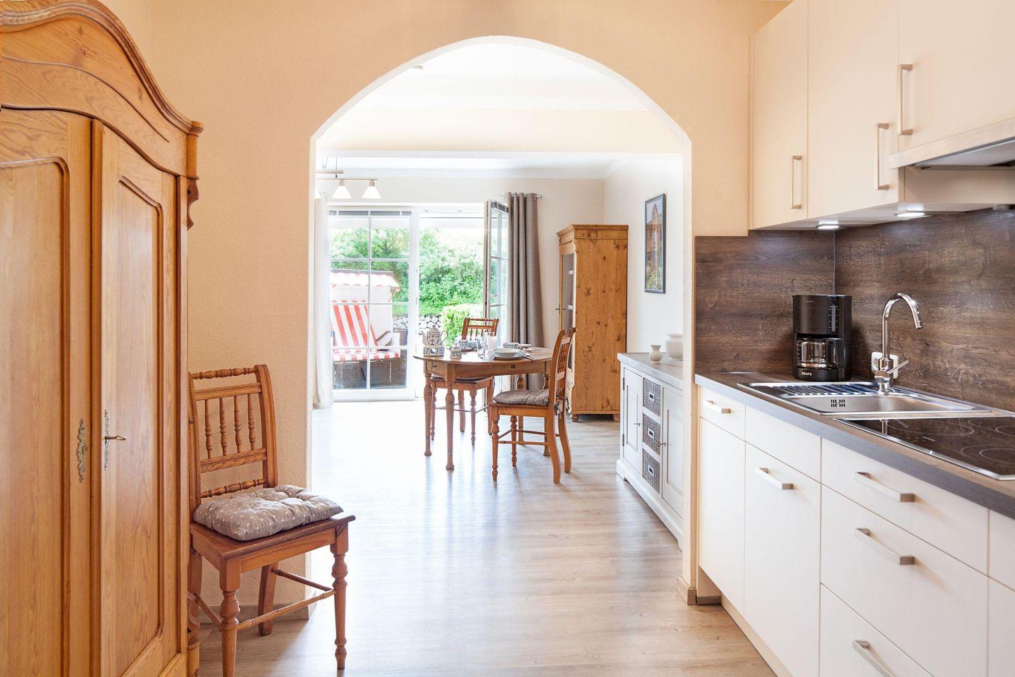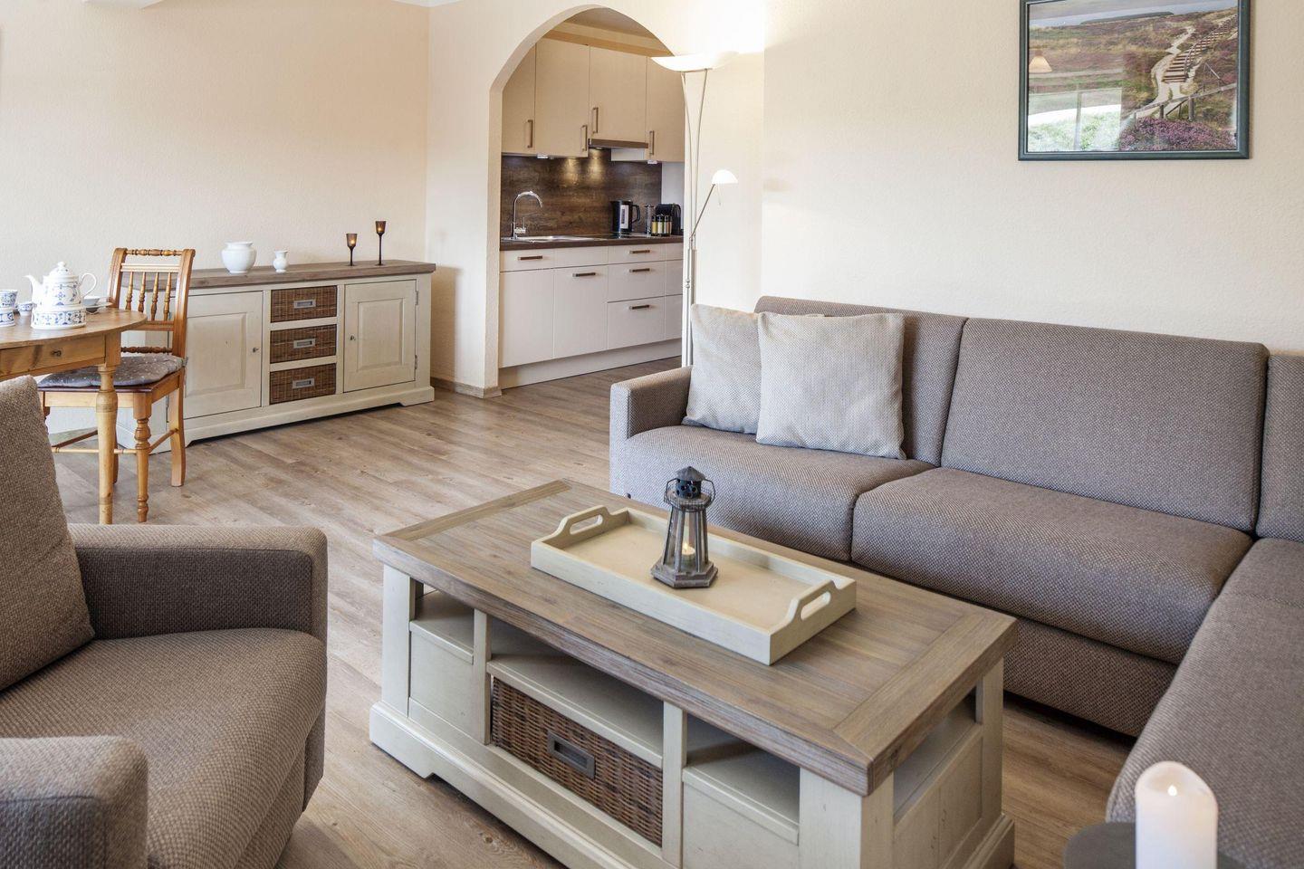 Willkommen im Appartement "Sonnendeck". Das direkt an der Strandpromenade in List liegende Appartement für zwei Personen, verfügt über ein Schlafzimmer mit Doppelbett, ein Duschbad, eine offene Küche und ein gemütliches Wohnzimmer, von dem aus Sie die Terrasse mit Strandkorb und Gartenmöbeln erreichen.