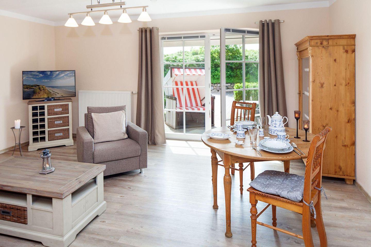Großzügiges Appartement im Erdgeschoss mit Terrasse und Strandkorb für zwei Personen.