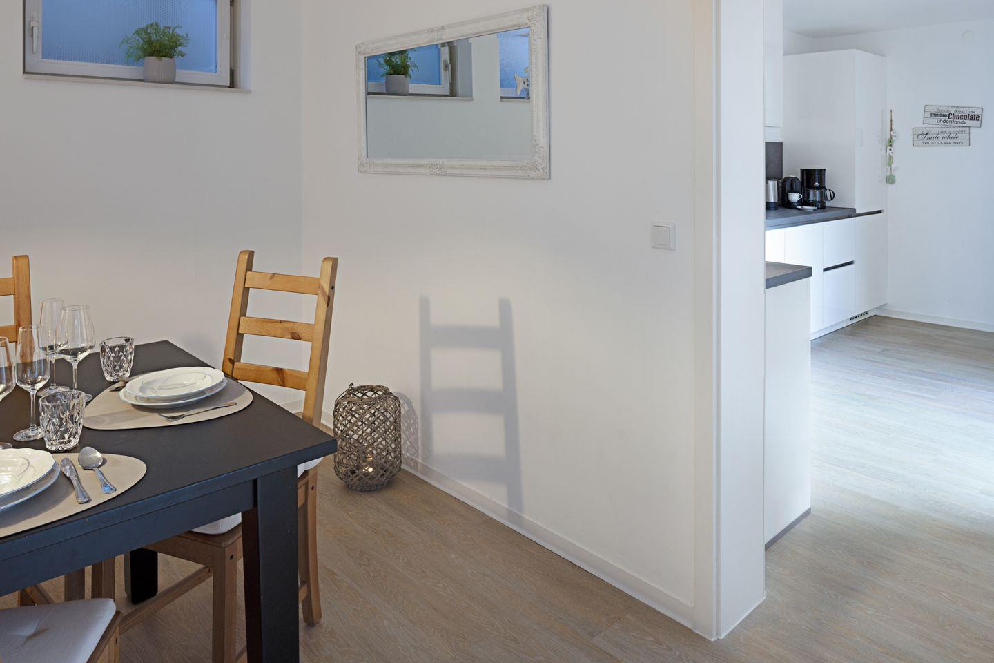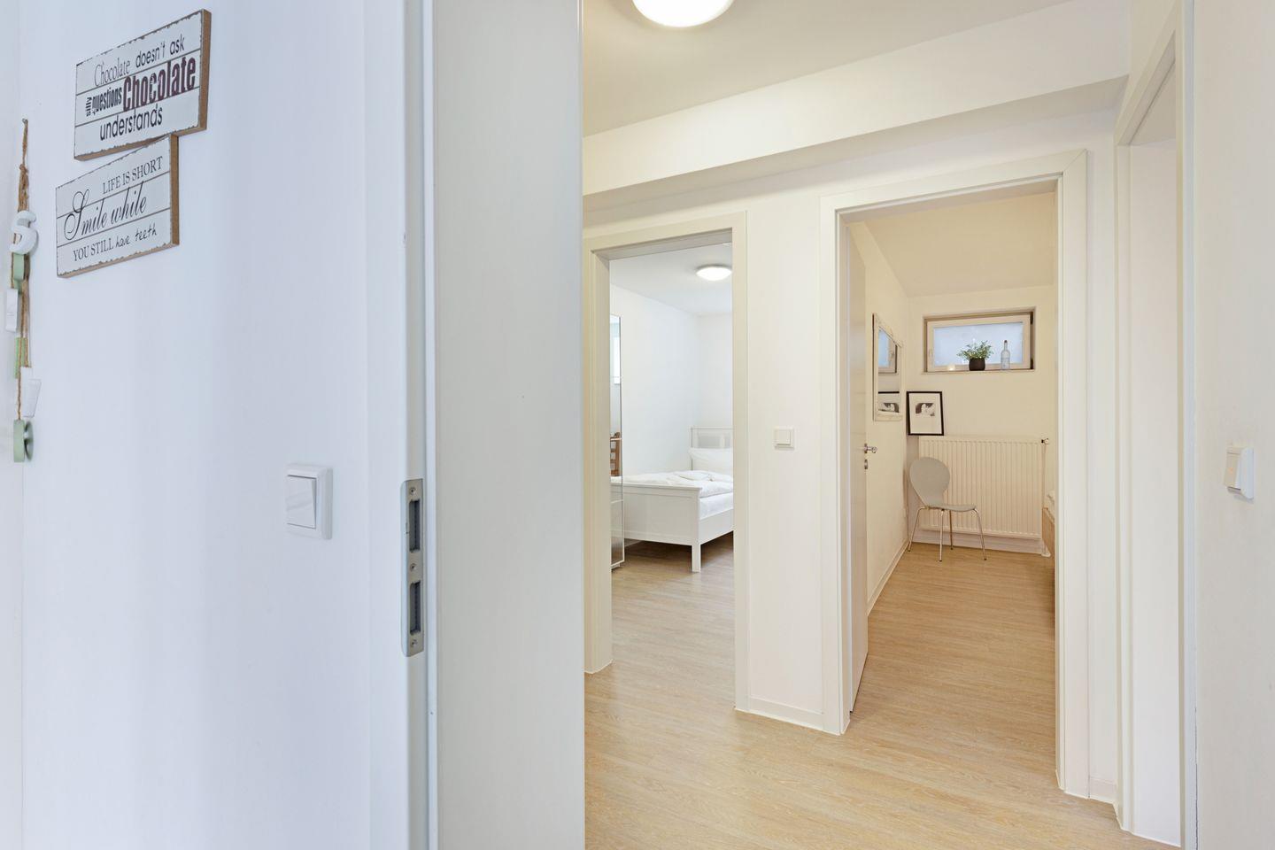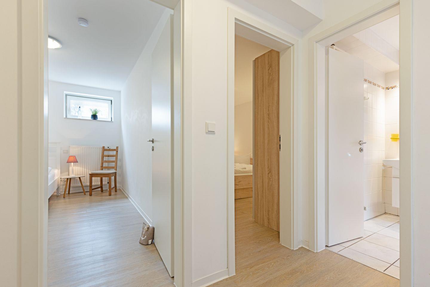Es liegt im Souterrain und ist mit drei Schlafräumen, offener Küche und Duschbad ausgestattet.