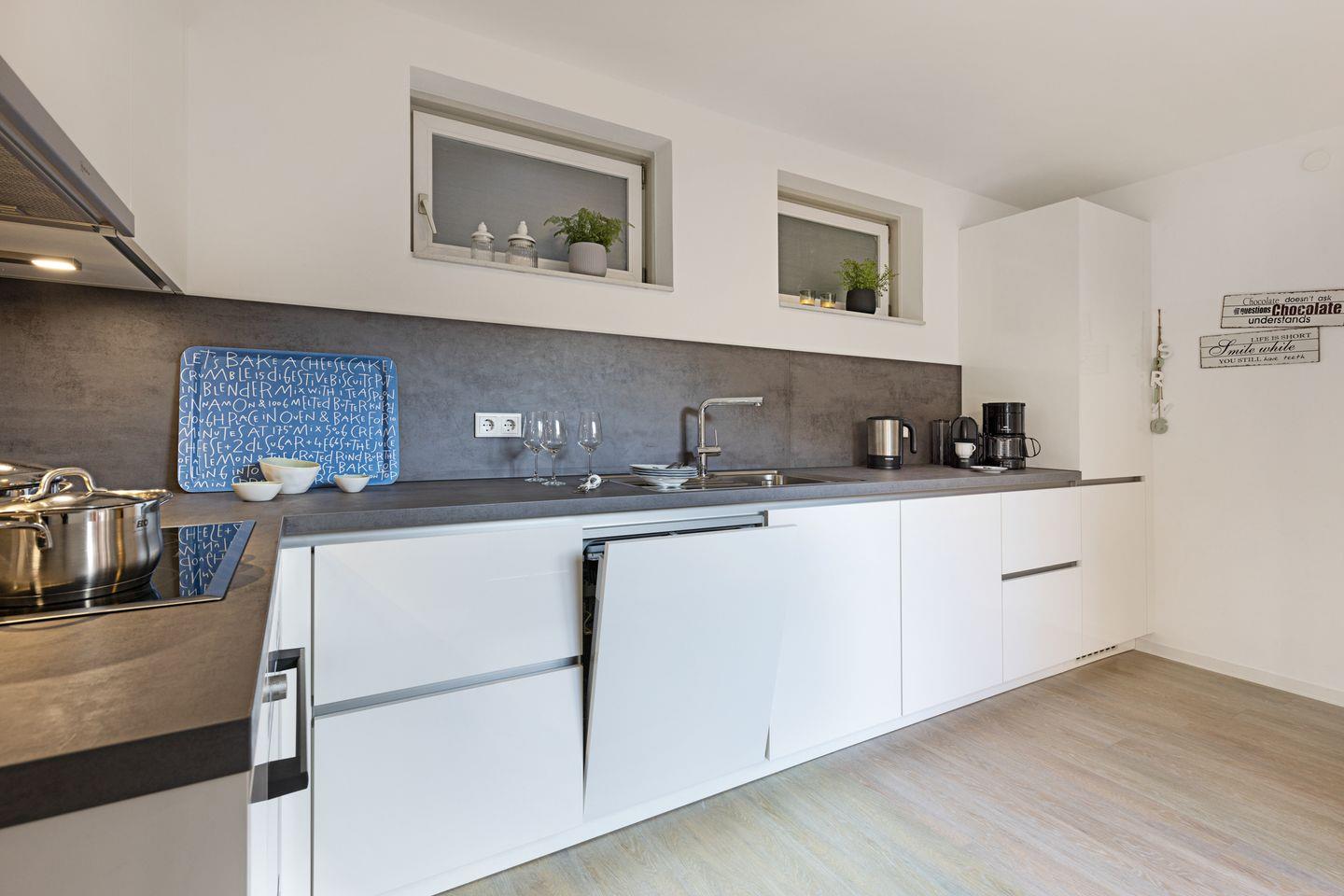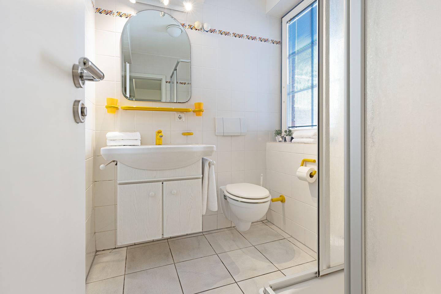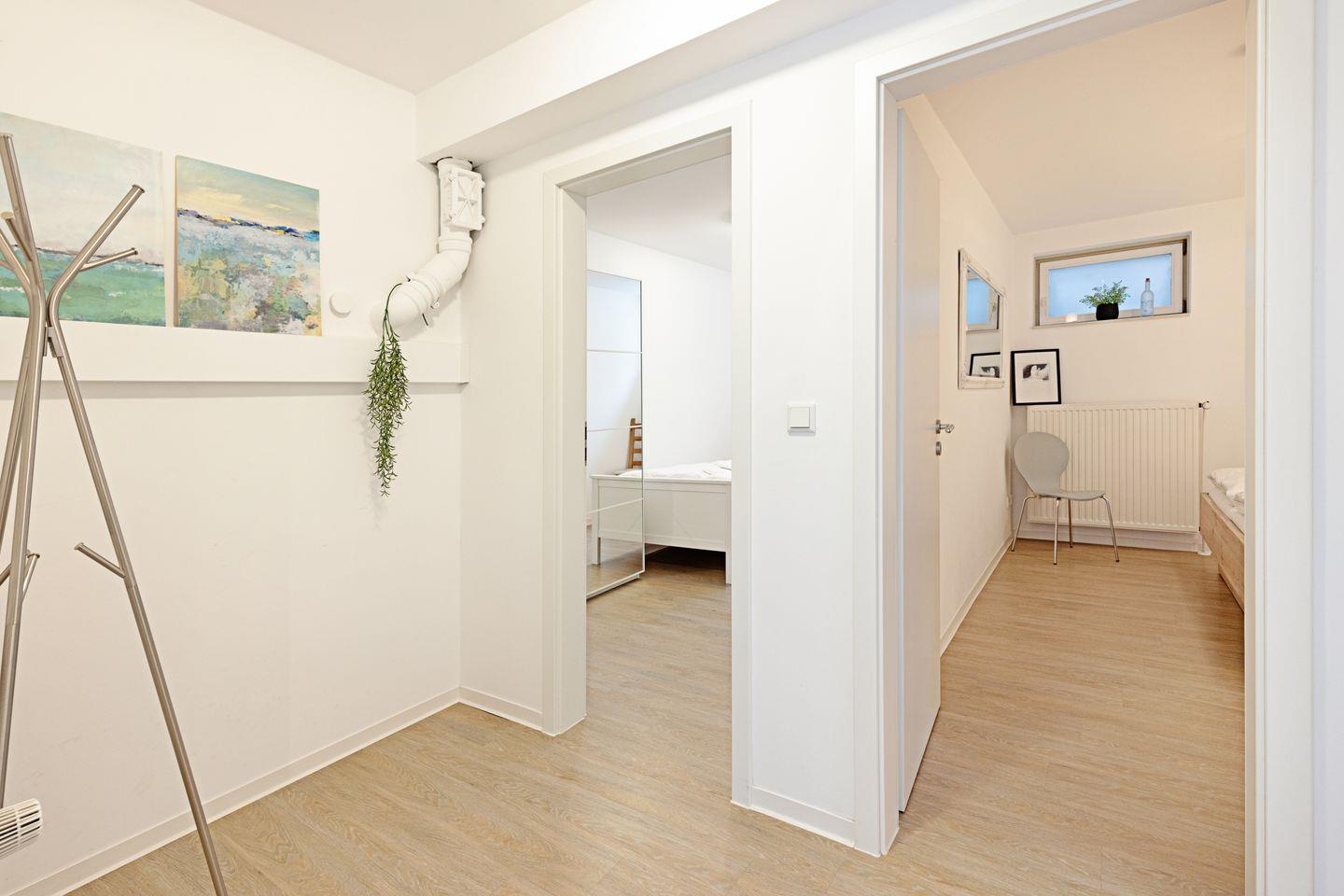 Es liegt im Souterrain und ist mit drei Schlafräumen, offener Küche und Duschbad ausgestattet.
