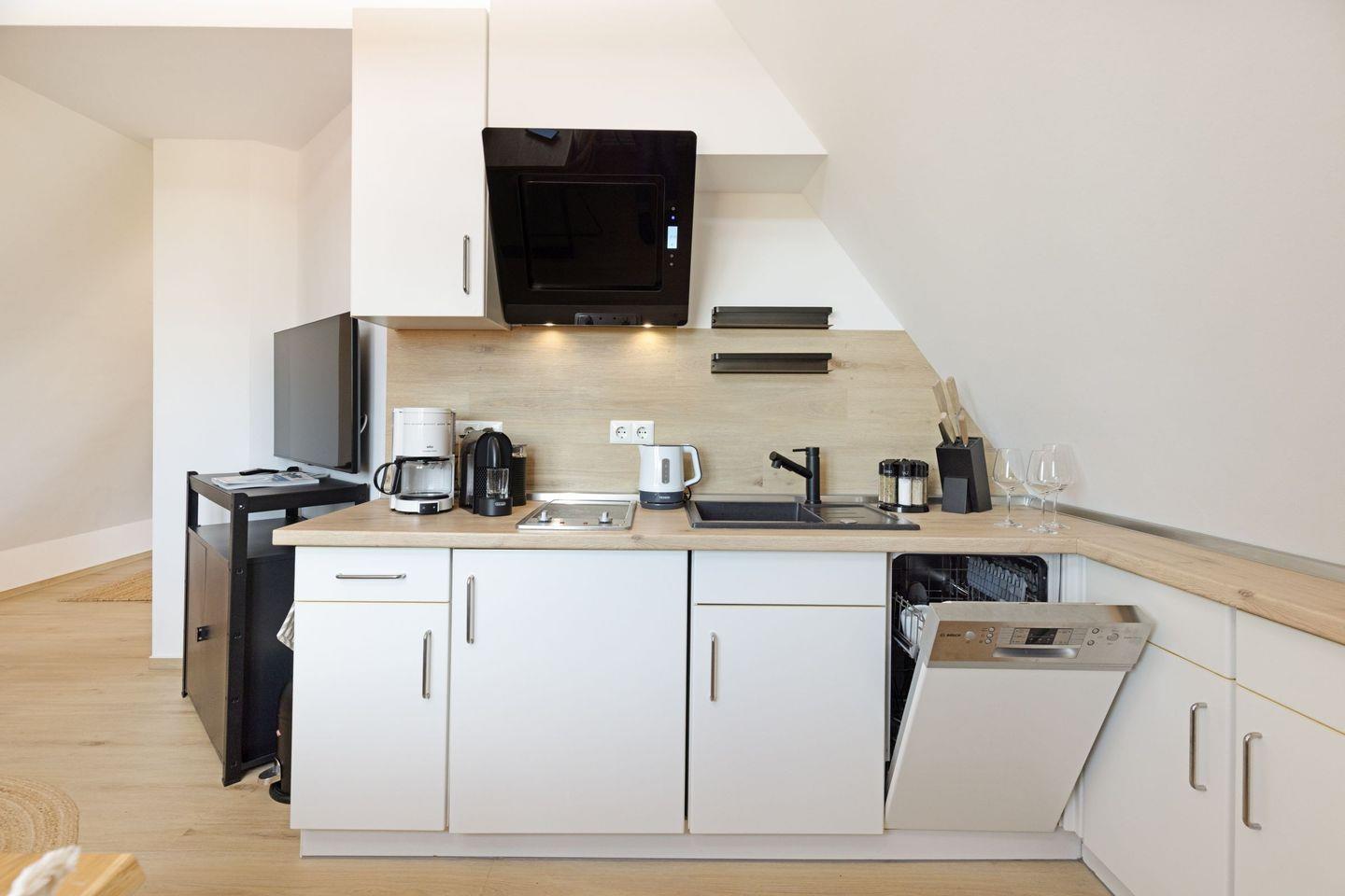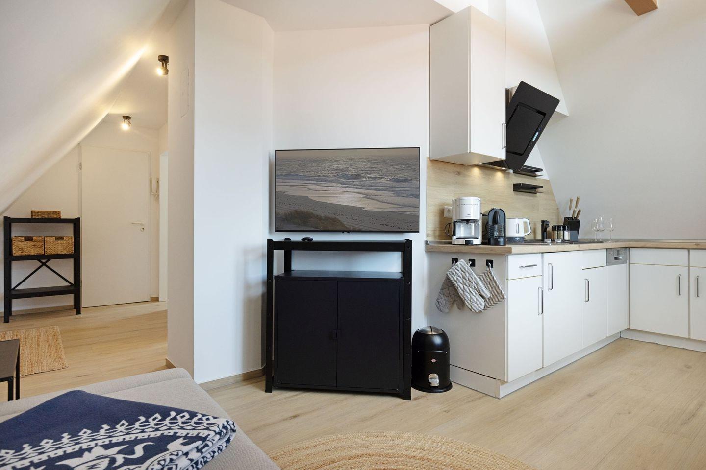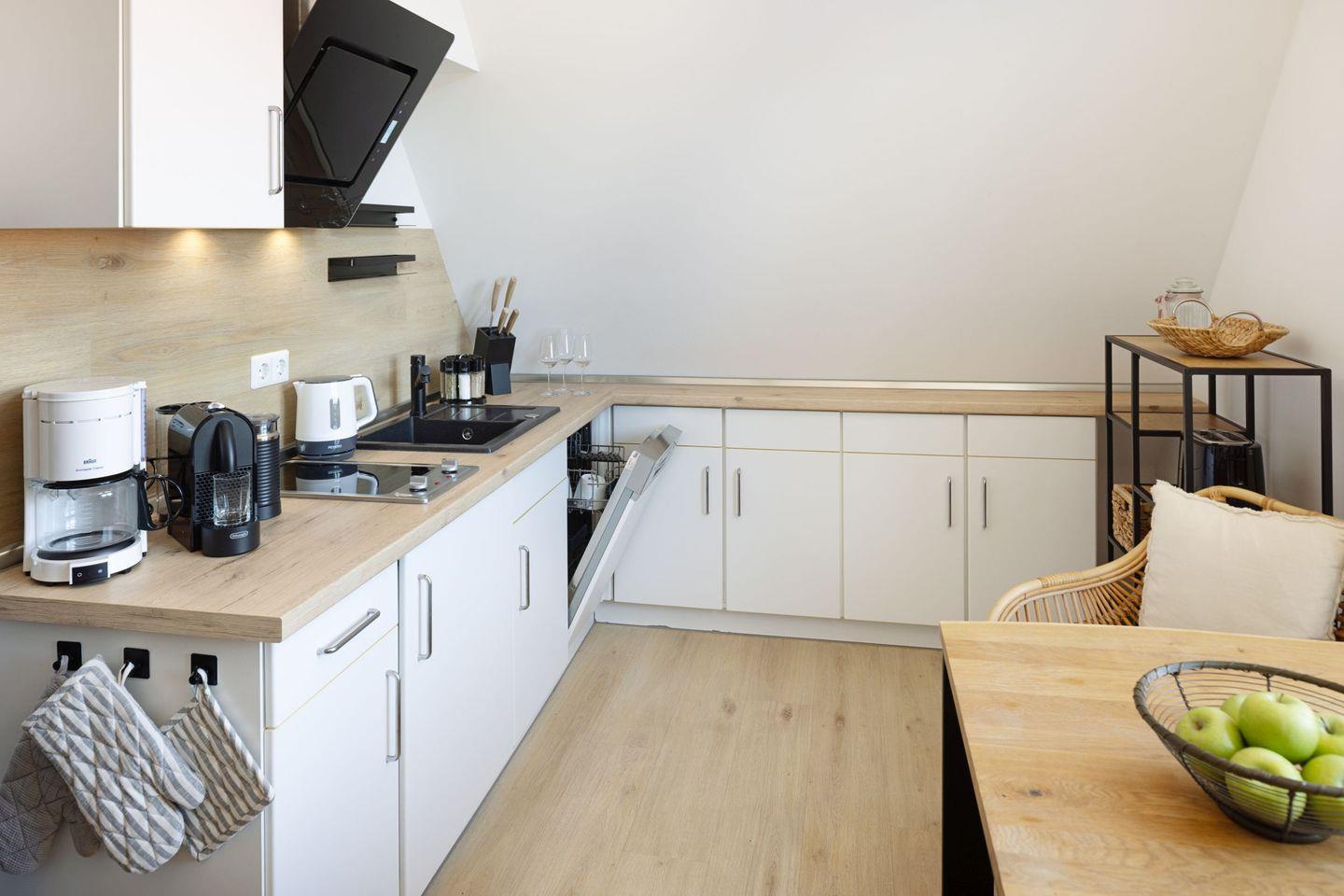 Die modern ausgestattete Küche lässt keine Wünsche offen: Sie verfügt über eine Spülmaschine, einen Kühlschrank mit Gefrierfach, einen Herd, eine Mikrowelle sowie eine Nespresso-Maschine uvm., sodass Sie auch im Urlaub bequem Ihre Lieblingsgerichte zubereiten können. Das moderne Badezimmer ist mit einer Dusche und einem Föhn ausgestattet.