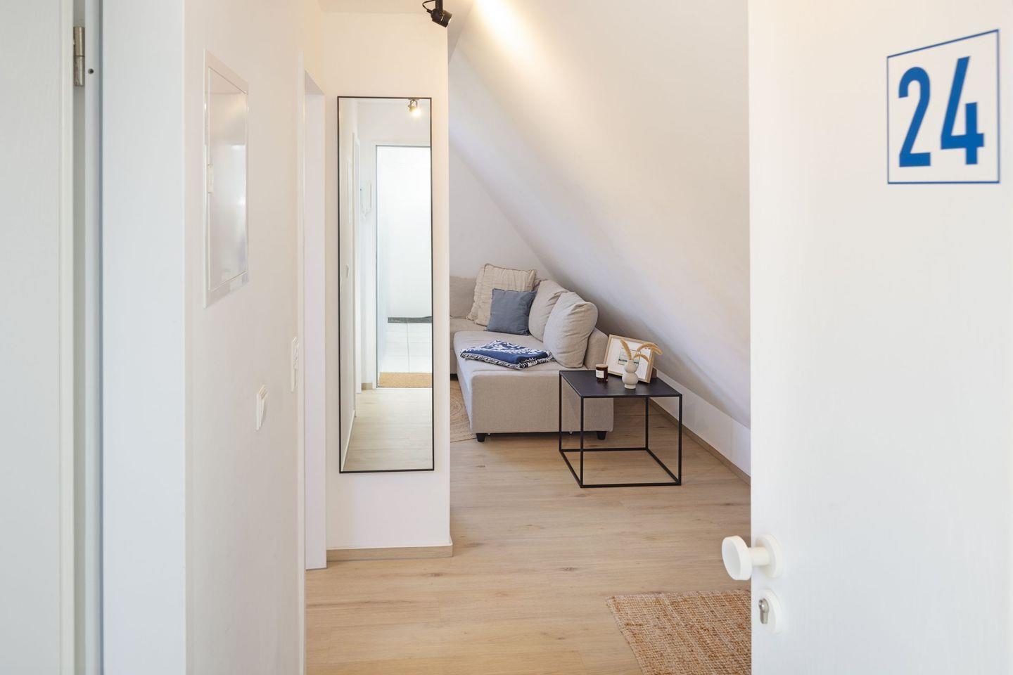 Die im Jahr 2022 renovierte Wohnung besticht durch ihre helle, freundliche Ausstrahlung sowie einen offen gestalteten Wohnbereich mit gemütlicher Sofaecke und Essplatz – perfekt für entspannte Abende. Der lichtdurchflutete Wohnraum lädt mit einem komfortablen Sofa und einem Smart-TV zum Verweilen und Entspannen ein.